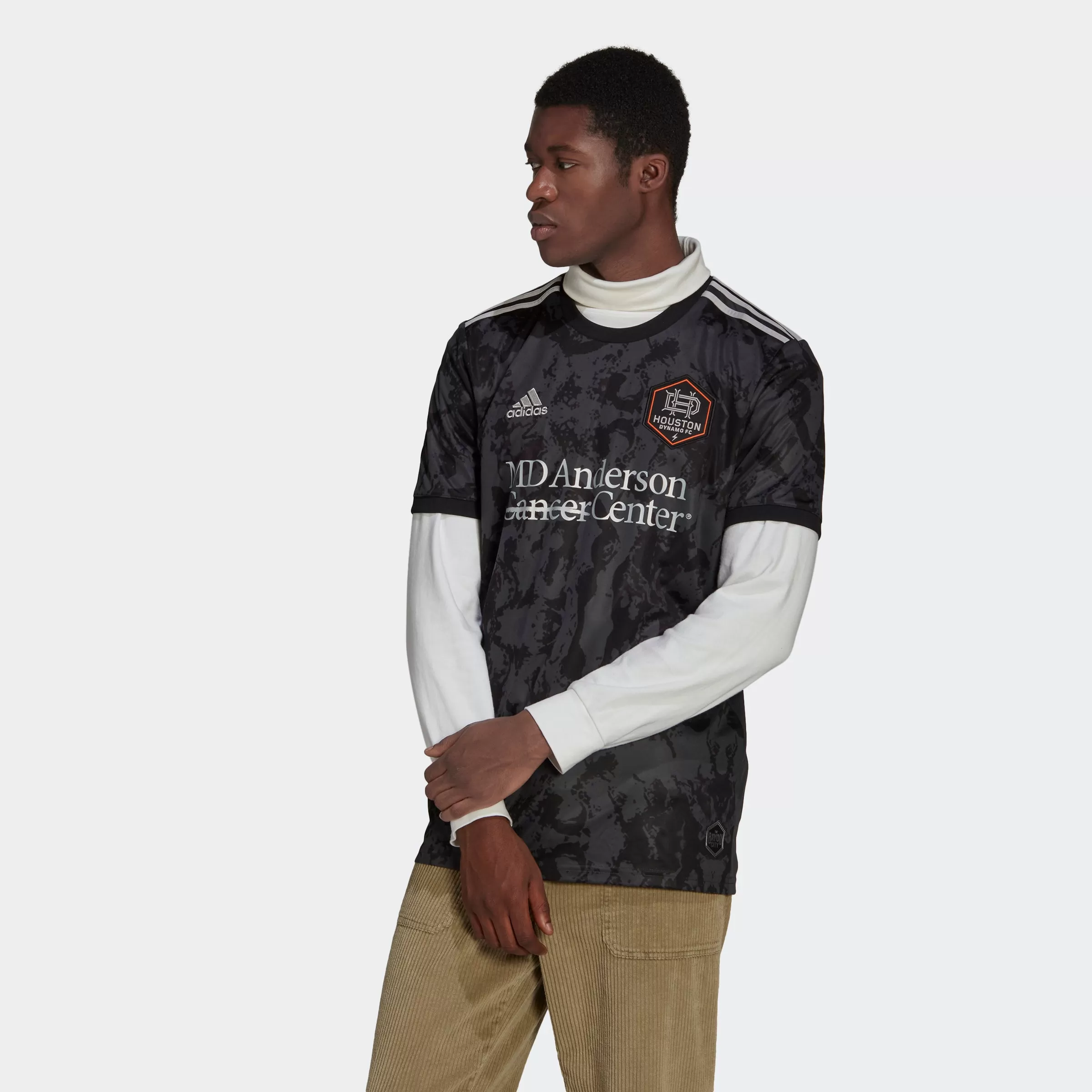 A reflection of Houston’s remarkable landscape. This adidas Houston Dynamo soccer jersey incorporates the region’s patchwork of meandering bayous into its tonal design. Created to keep fans comfortable, it fields moisture-wicking AEROREADY and breathable mesh panels. Silver detailing and a “Bayou City” jock tag signoff stand out against the dark colors.