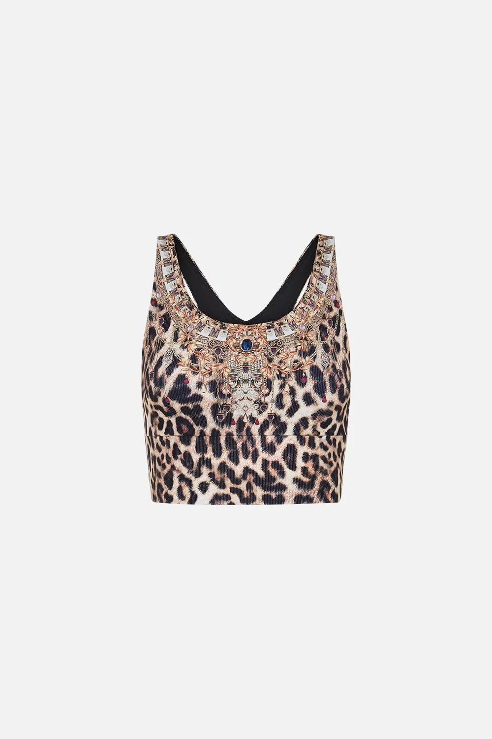 The Nomadic Nymph Banded Racer Back Crop steals our gaze with a sandy leopard print finished with soft blends of icy blues, vines of golden foliage and enchanting gemstones dipped in breathtaking sapphire. Complete with compression support and anti-pilling technology, this luxury sports bra is home to a fitted silhouette, a scooped neckline that complements a racer back design and a generous underbust band to shape and flatter.