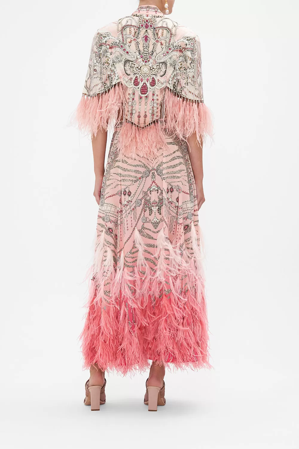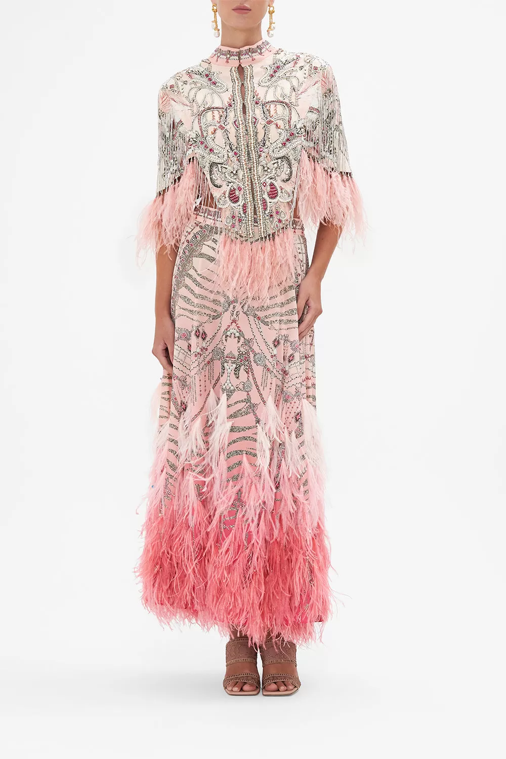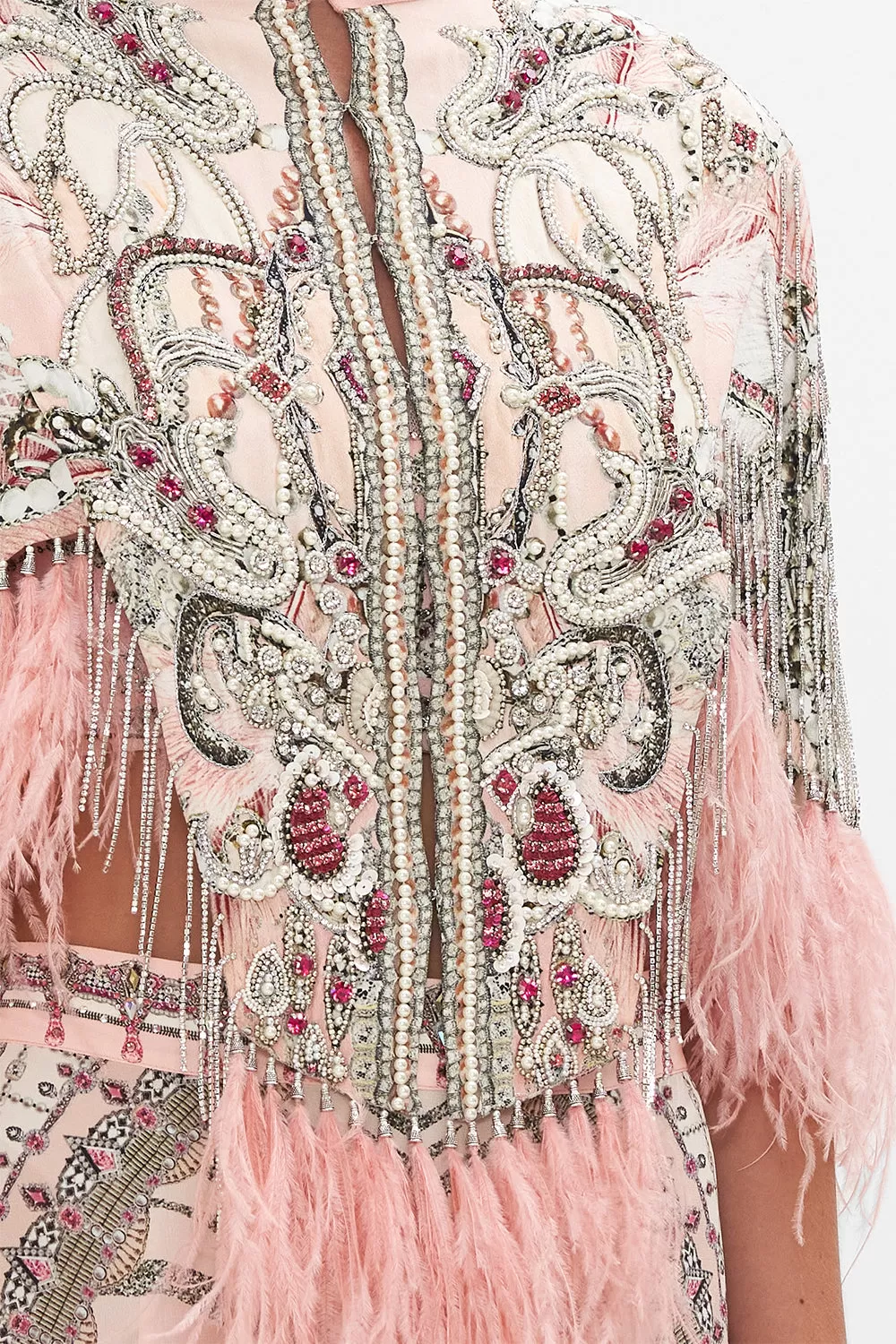 The Starships Sistas Beaded Gilet explores a mosaic dipping into a palette of peachy creams and watermelon pinks as feathered details billow amidst chain accents and ornaments of royalty.