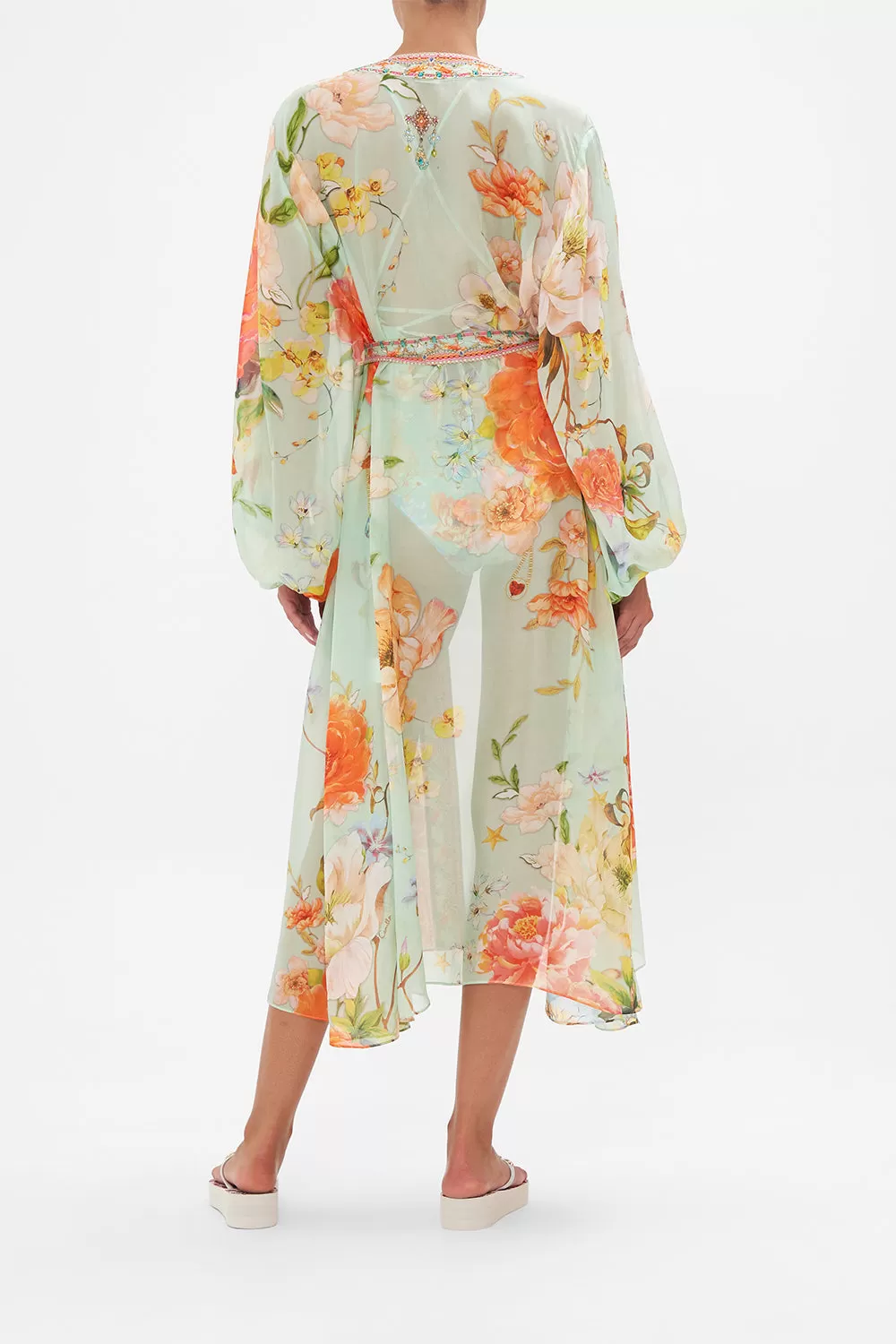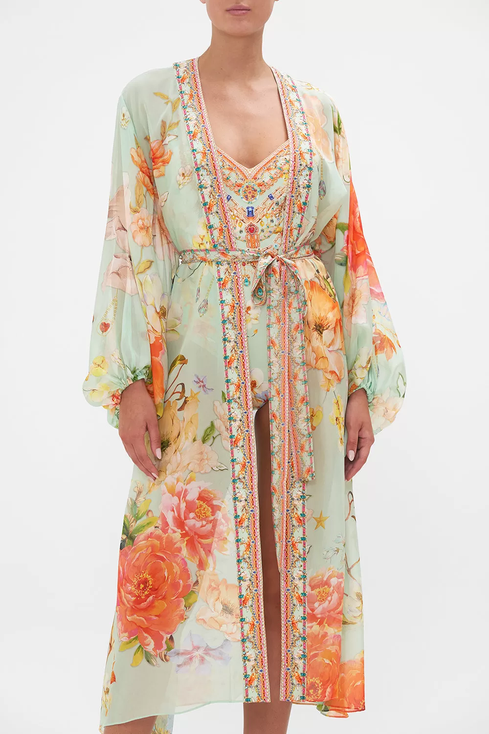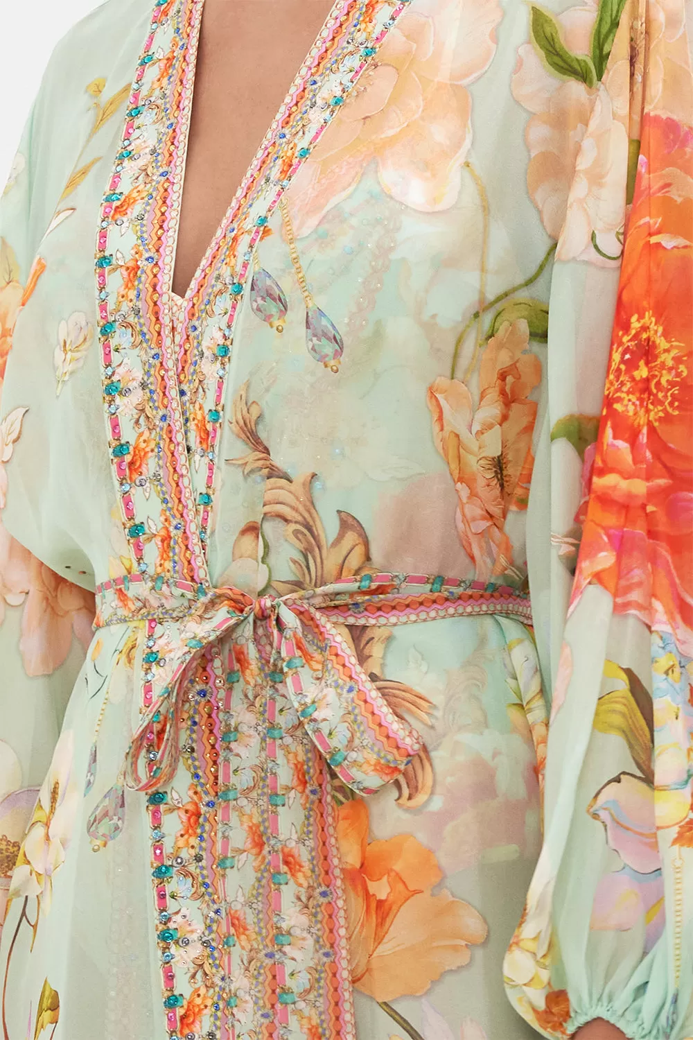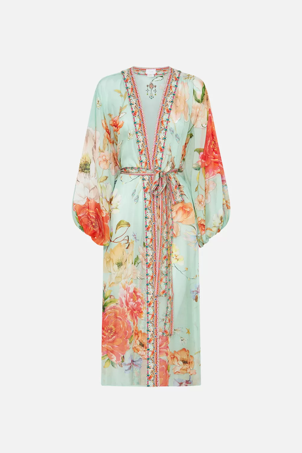 The Talk The Walk Blouson Sleeve Layer is a sensual immersion of fragrant blooms. Subtle glimmers of hidden jewels and gilded flourishes dance amongst the soft mint ambiance. Finished with hand-embellished CAMILLA crystals, this luxury silk layering piece is home to statement blouson sleeves that dance at the wrist, contrasting neck bands that line the full length edge and a relaxed maxi silhouette designed to be worn effortlessly open or wrapped and cinched in with waist tie enclosure. Lovingly handcrafted and designed in Australia, explore more from The Moral Of The Story: Act II collection.