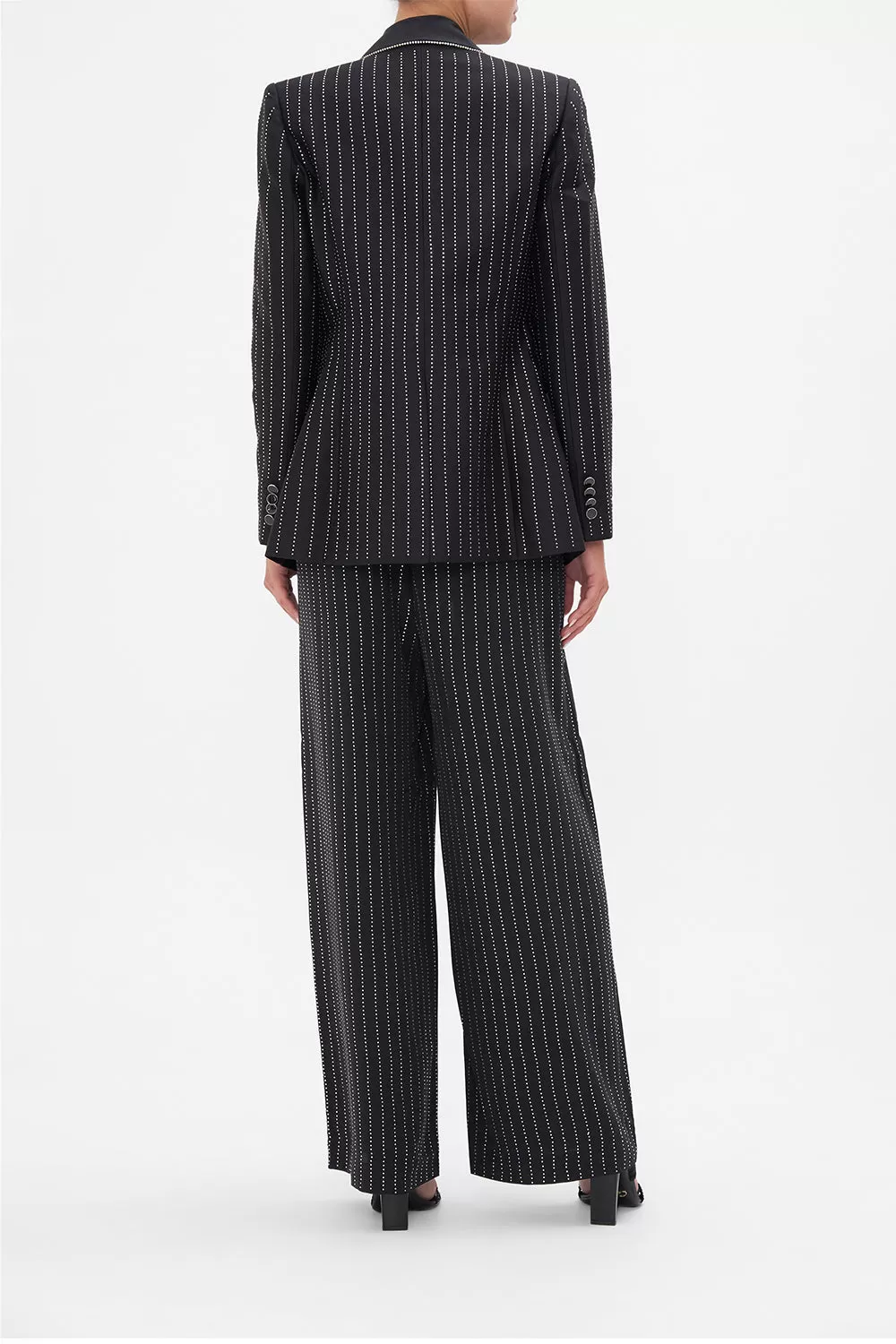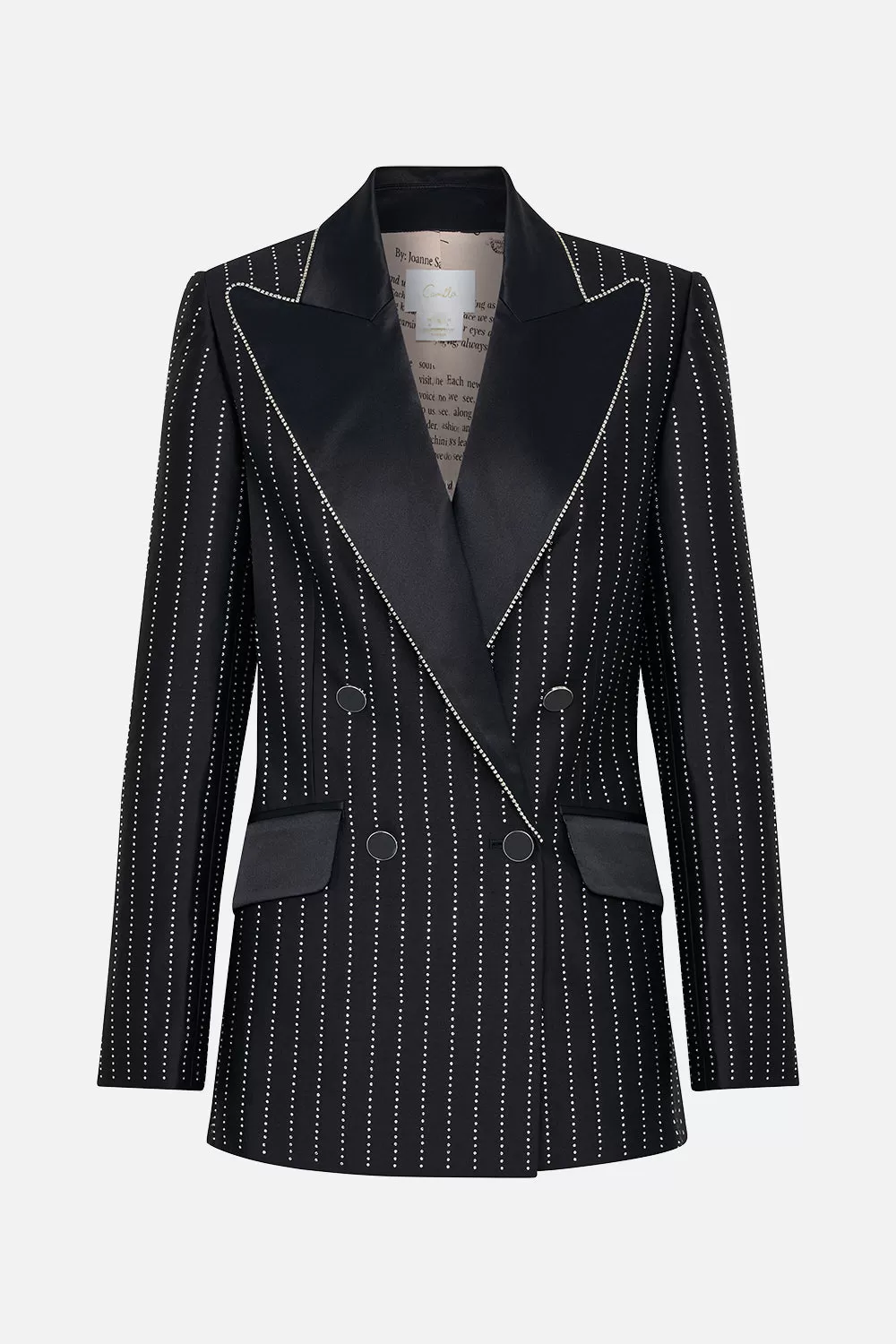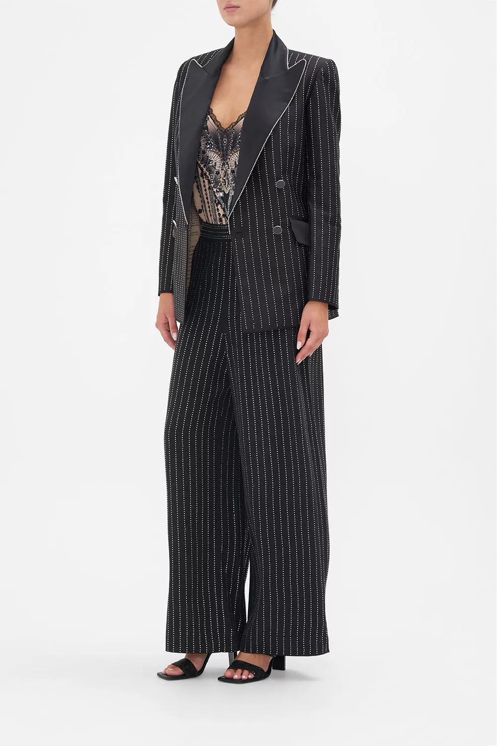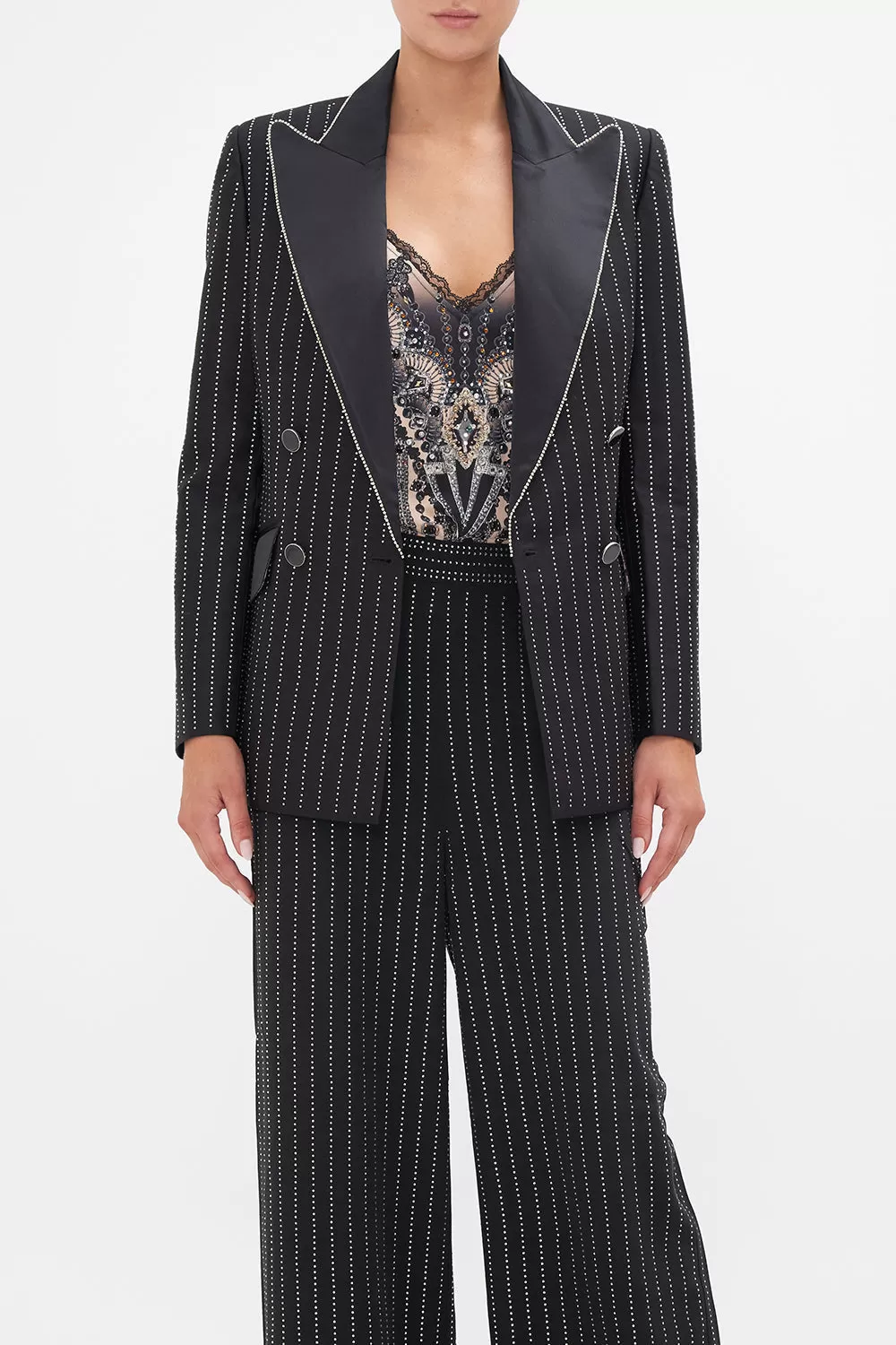 The Curtain Call Chaos Double Breasted Suit Jacket interweaves fine sparkling lines against a backdrop of a deep midnight hue. Decadently finished with a wide peaked contrast lapel, this silk-wool blend blazer embodies a classically tailored relaxed fit silhouette, fully lined, adorned with an all over hotfixed crystal pinstripe pattern embellished throughout, double breasted button enclosures and front flap pockets. Lovingly handcrafted and designed in Australia, explore more from The Moral Of The Story: Act II collection.