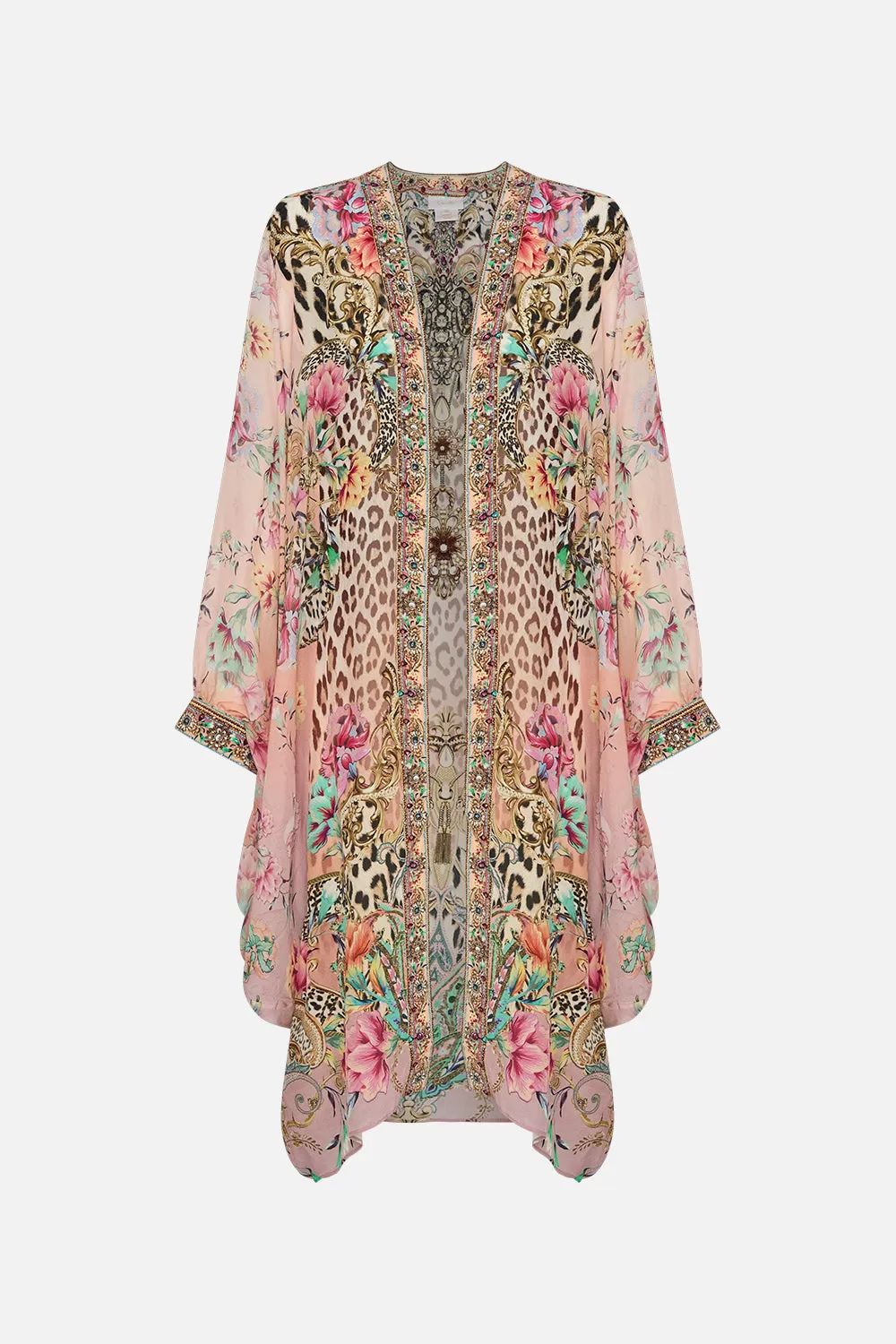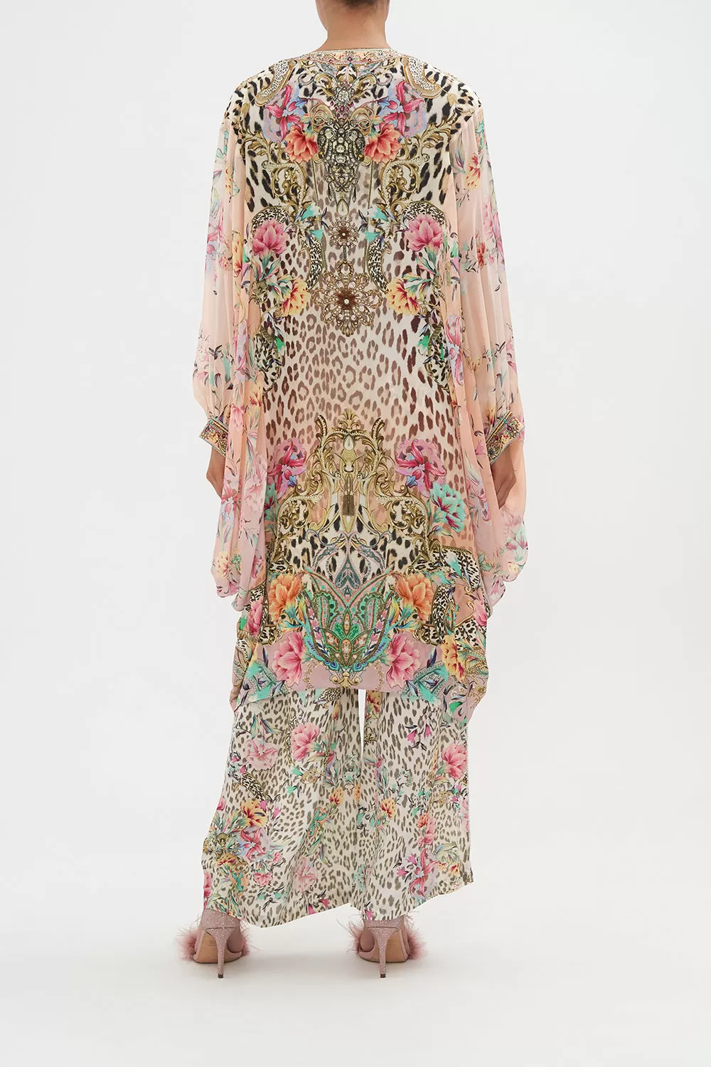 The Queen Atlantis Dramatic Sleeve Cocoon Layer brings back a classic with timeless leopard print finished with petals dipped in blush hues, roped accents and gold baroque detailing. Crafted from the softness of silk, this luxury layer is home to statement sleeves that cocoon down to the wrist, a relaxed oversized silhouette that drapes into a midi length and hand-embellished crystals that adorn contrasting neckbands.