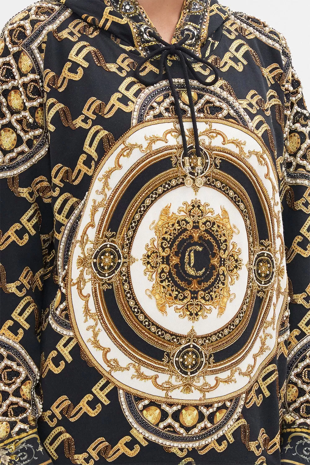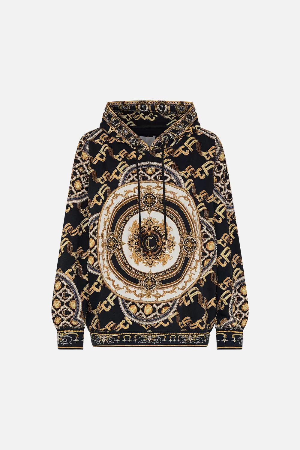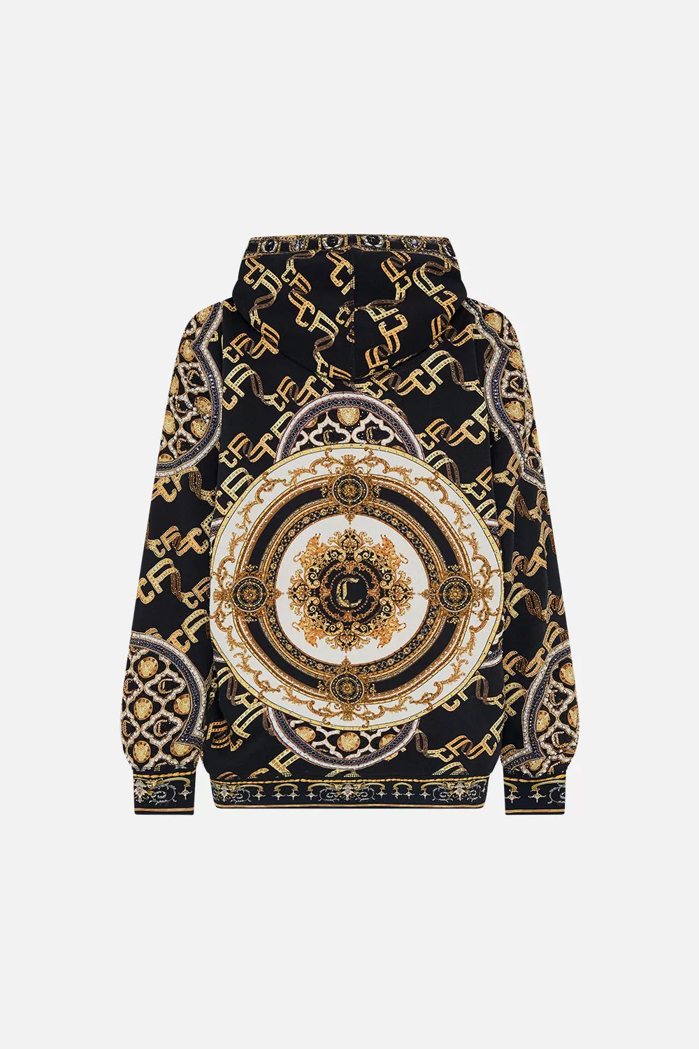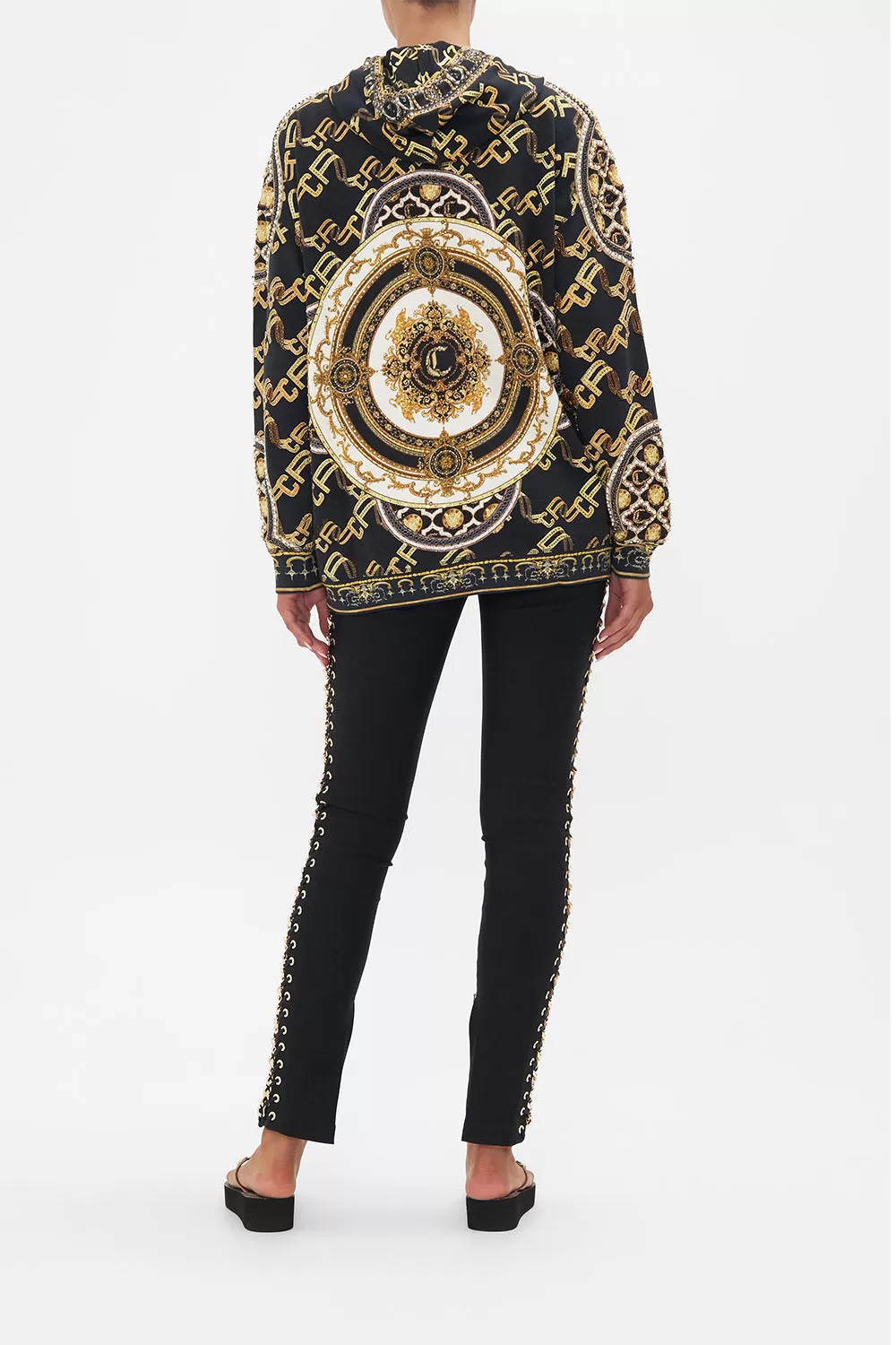 The Tether Me Not Hoody With Pockets is an immersion into an opulent world of sleek palatial curves, offset with sharp monogram mosaics. Gilded baroque adornments and chains glimmer against graphically bold onyx and ivory contrasts. Crafted from breathable cotton, this luxury hoodie is home to silk lining within the hood and pockets, an oversized silhouette, ribbed details, drawstring adjustability, tassel accents and hand-embellished CAMILLA crystals. Lovingly handcrafted and designed in Australia, explore more from The Moral Of The Story: Act II collection.