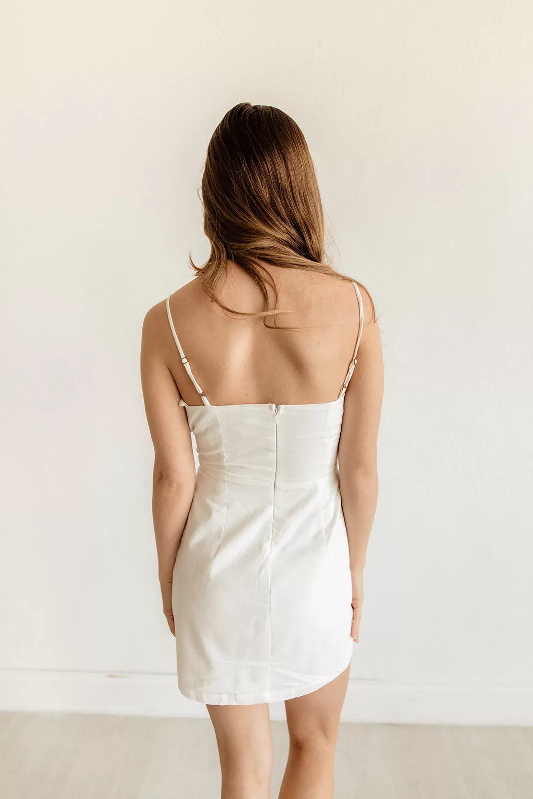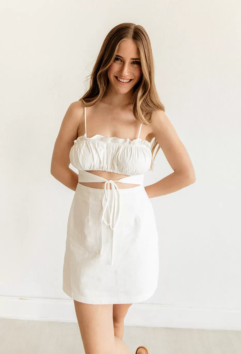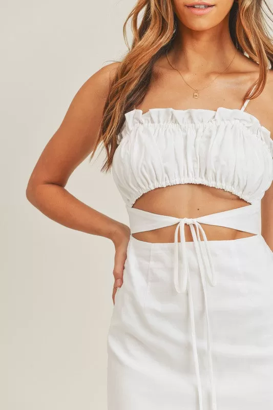 Designed for all of your brunch plans, the Springsteen Cutout Mini Dress in ivory is detailed with a smocked upper and a fitted silhouette.
