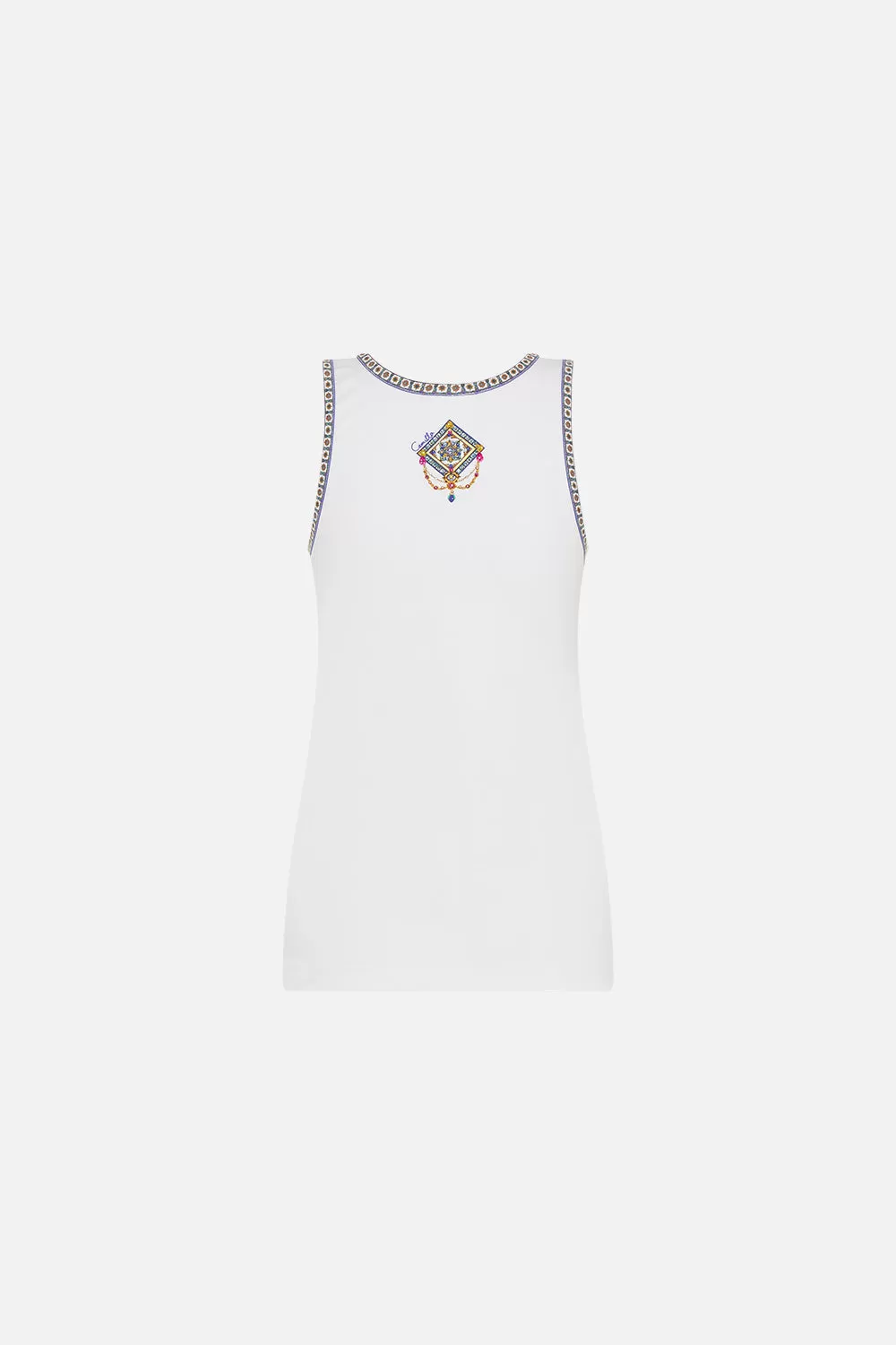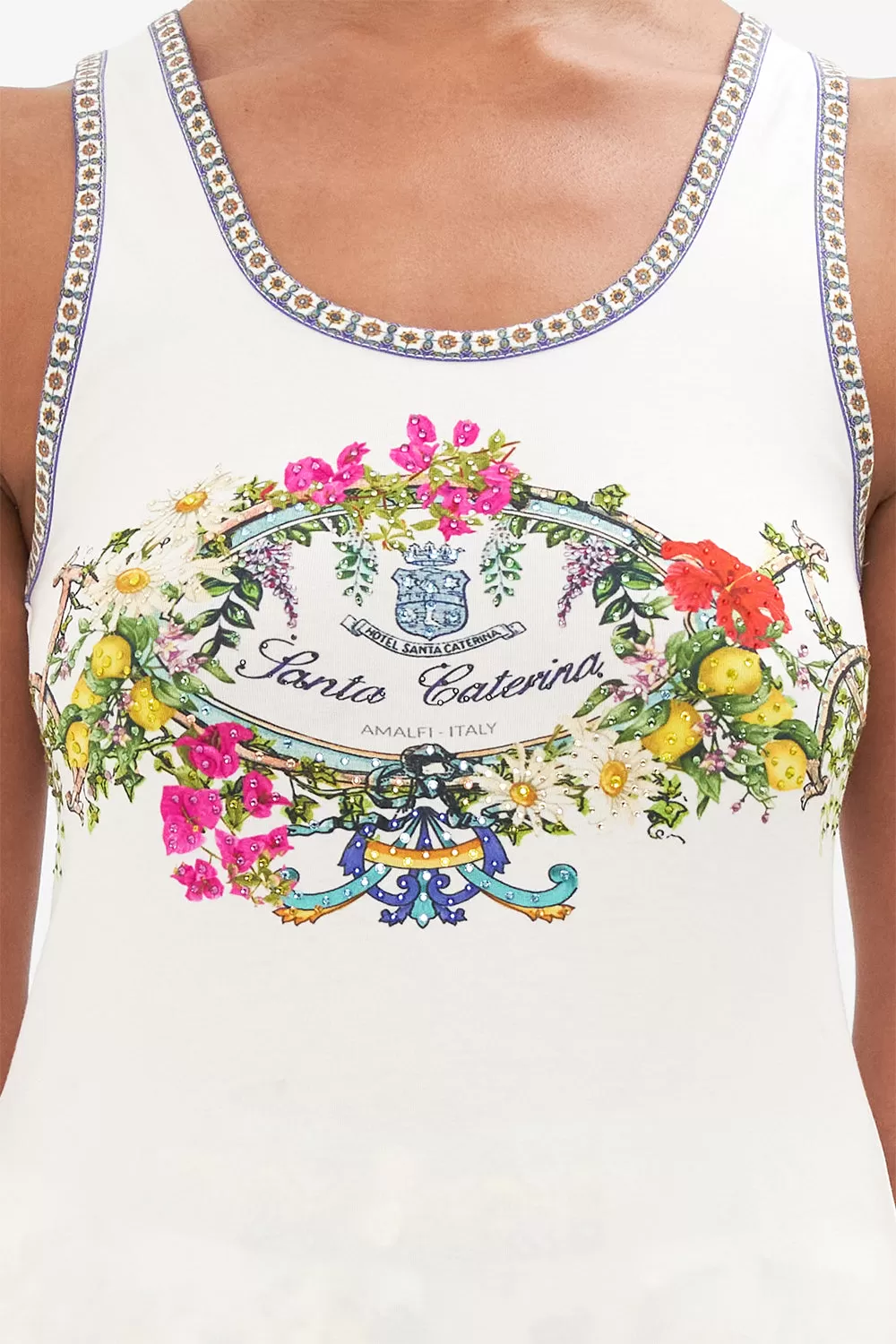 The Amalfi Amore Jersey Scoop Neck Tank Top celebrates the vista views through iconic archways lined with fragrant florals at the Hotel Santa Caterina Crafted from organic pima cotton, this luxury CAMILLA tank top dons a chic scoop neckline, a sleek fitted silhouette that is finished with crystal embellishments. Lovingly handcrafted, designed in Australia. Explore more from the Amore Mio collection.