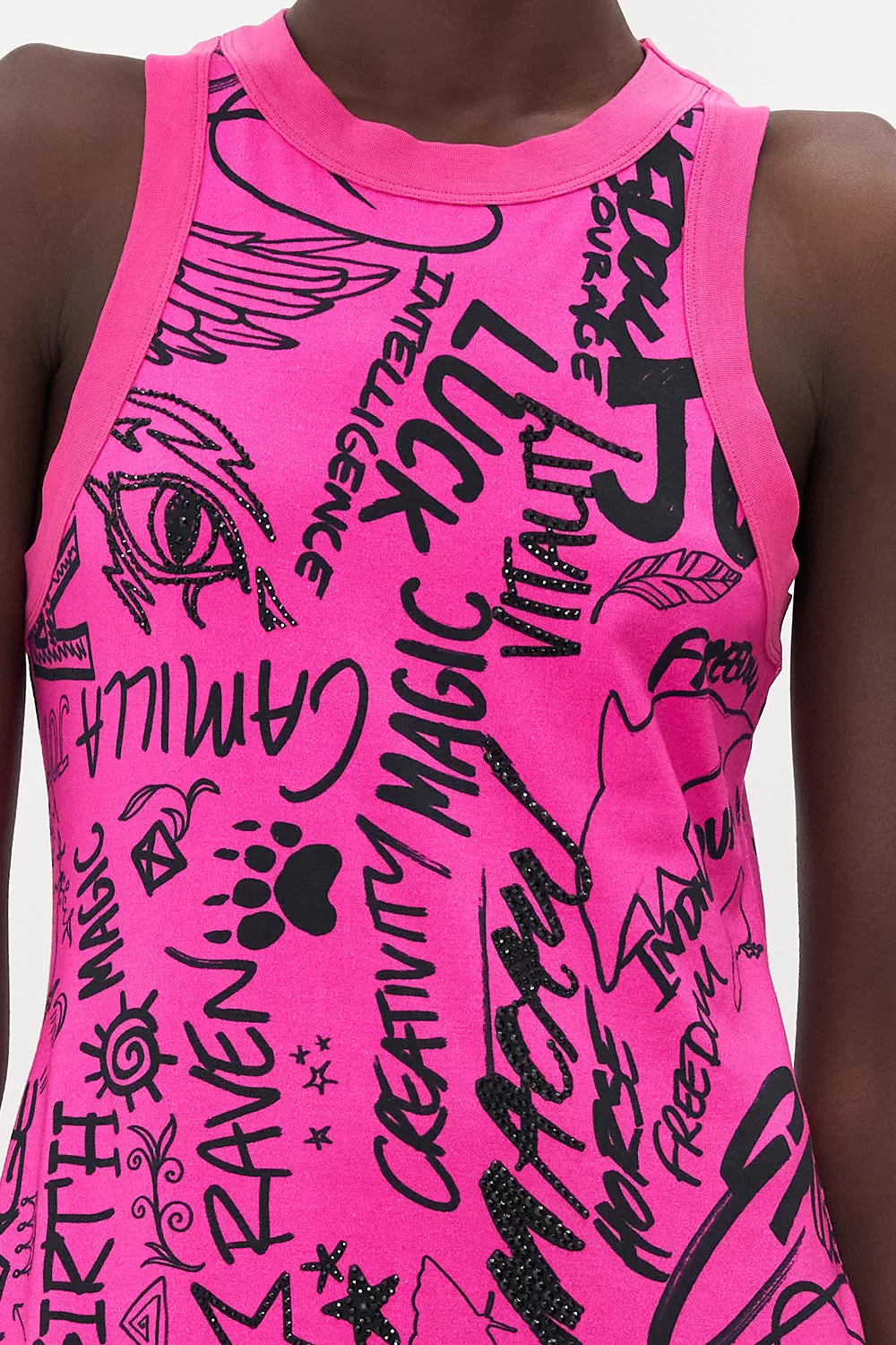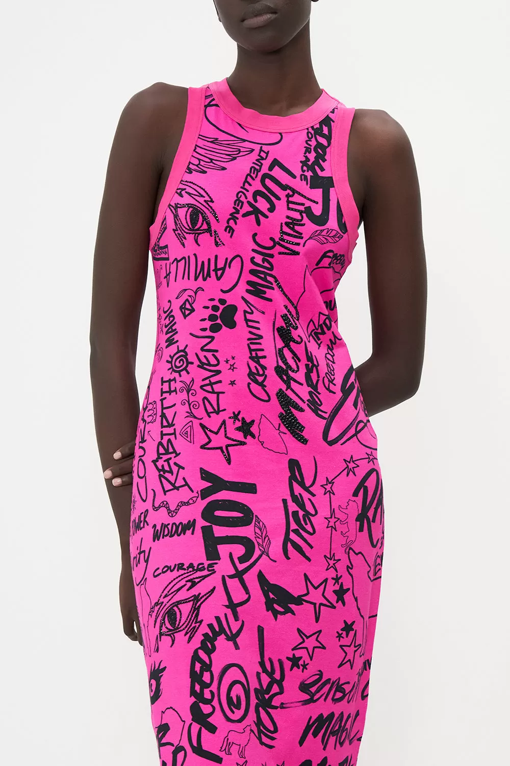 The Graffiti The World Jersey Tank Dress is encapsulated by a jaw-dropping hot pink graffiti print complete with swirls of black star detailing, slogan splashes and fiery illustrations of Mother Earth’s creations. Crafted from a breathable cotton blend, this statement summer dress is home to a fitted maxi silhouette that adorns a sleeveless cut and signature hand-placed crystal embellishment.