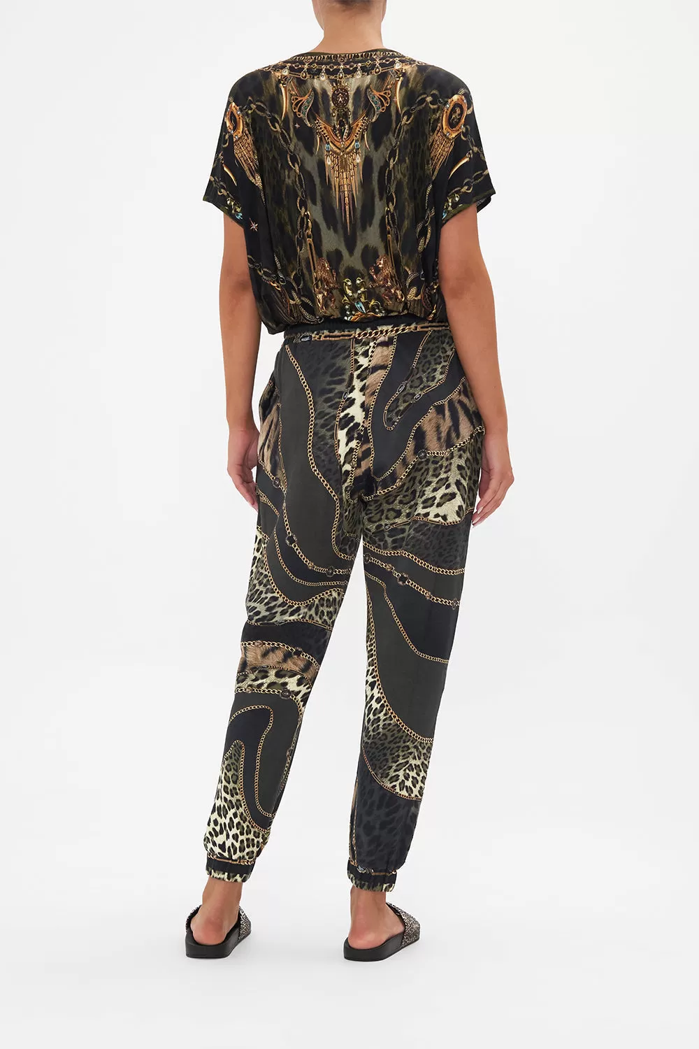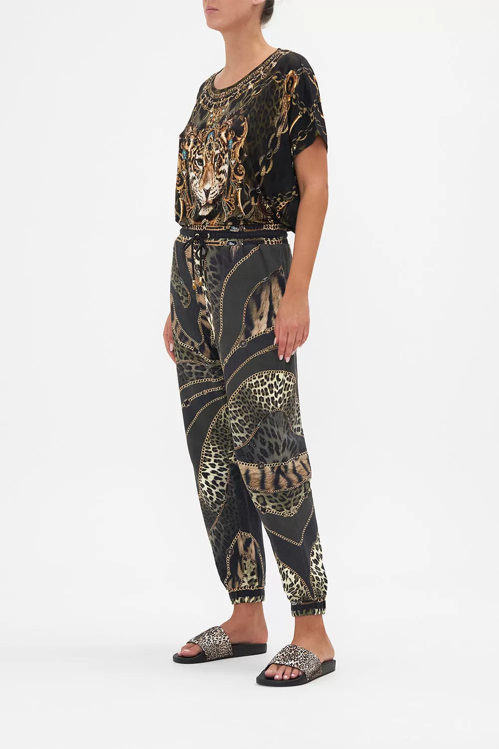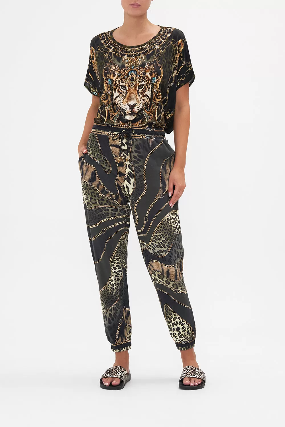 The Lions Mane Jersey Track Pant With Pocket encapsulates a dynamic dance between organic animal print with delicate tribalistic woodcut enmeshed with delicate chains and sparkling jewels. Adorning hand-embellished CAMILLA crystals, these luxury cotton track pants feature a relaxed silhouette, a contrasting waistband that features elastication, a tapered hem and drawstring accents for your most perfect fit. Lovingly handcrafted and designed in Australia, explore more from The Moral Of The Story: Act II collection.