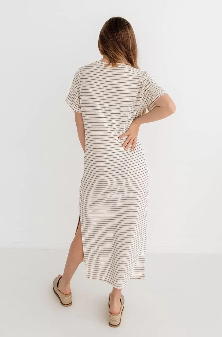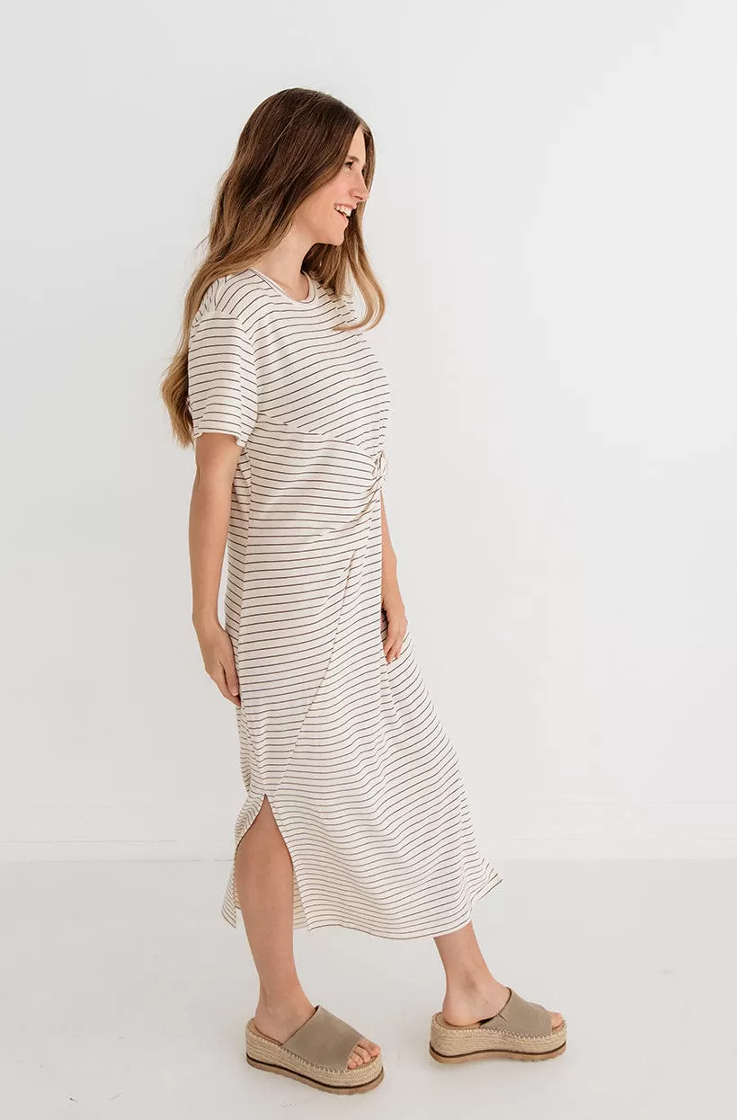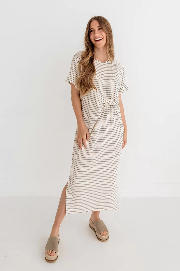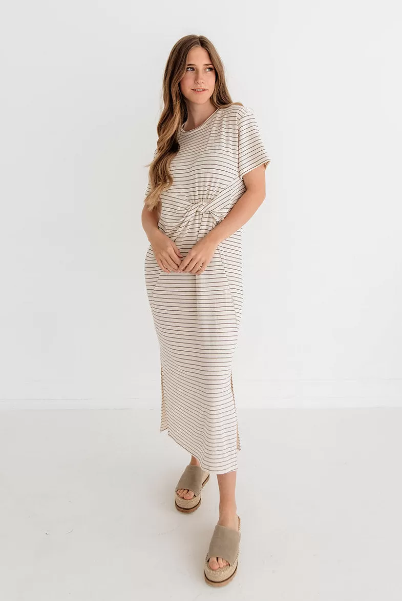 Don’t get it twisted, the stripes is still in! Our Jiya Jersey Striped Twist Front Midi Dress in cream & black stripes with a twist front hemline. Such an effortless look!