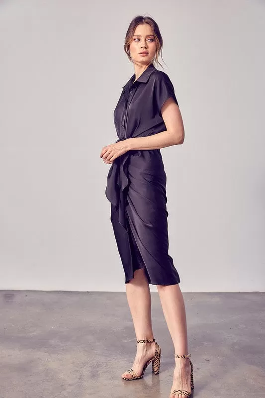 //Best Seller// New Color// For any dressier affair or work event, adorn the Just A Dream Satin Tie Front Midi Dress in a luxe black satin with a chic and sophisticated tie front.