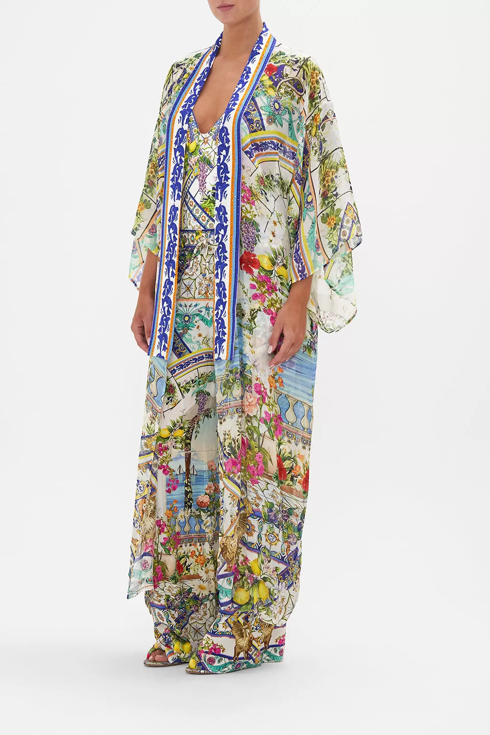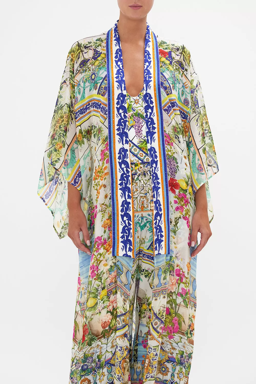 The Amalfi Amore Kimono Layer With Collar celebrates the vista views through iconic archways lined with fragrant florals at the Hotel Santa Caterina. Crafted from luxurious CAMILLA silk, this statement outerwear layer plays host to crystal embellishments, a longline hem that drapes upon the leg, contrasting neck bands and an effortlessly relaxed silhouette. Wear as a luxe lightweight outer layer over dresses or as decadent resortwear over CAMILLA swimwear. Lovingly handcrafted, designed in Australia. Explore more from the Amore Mio collection.