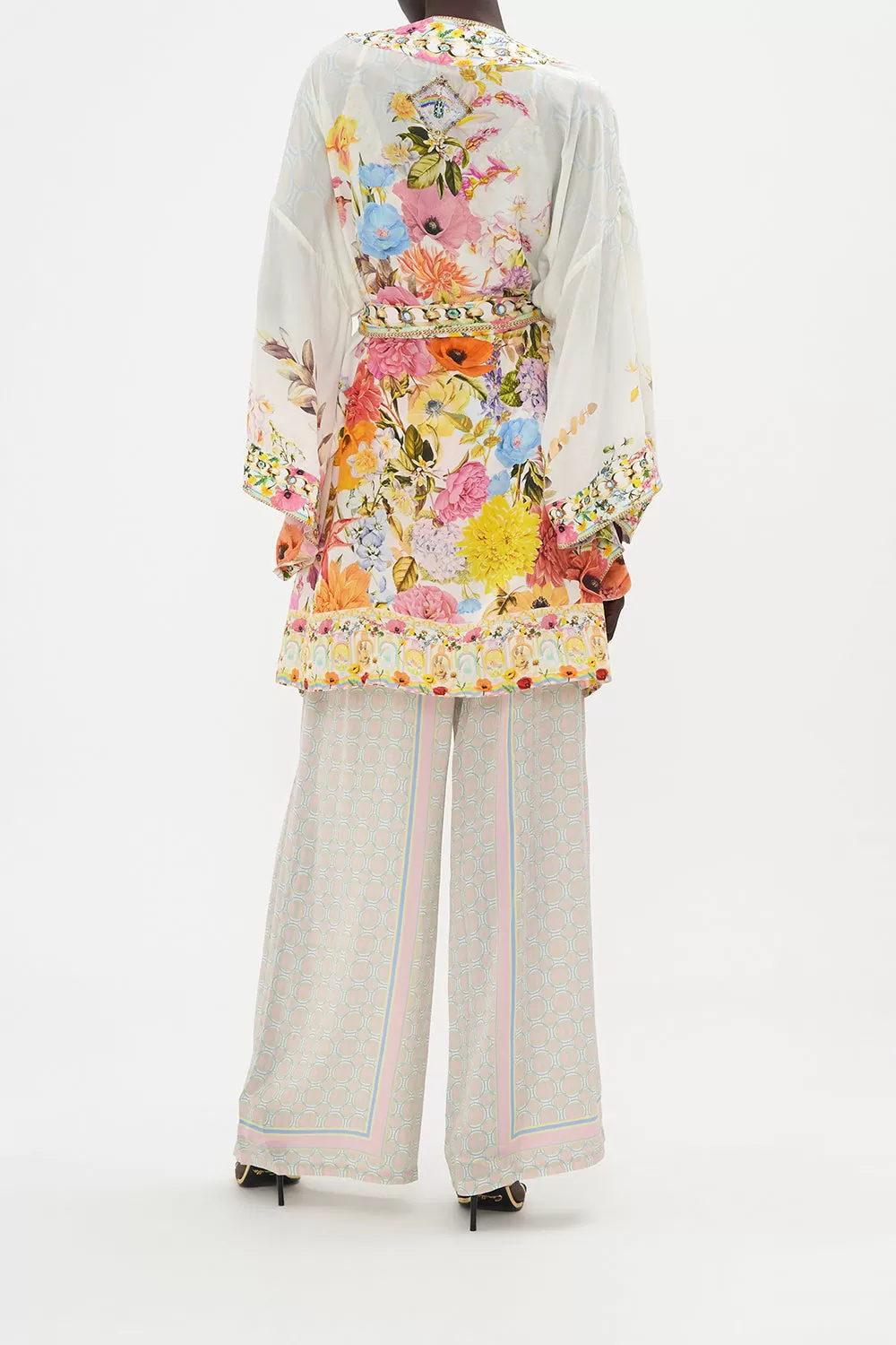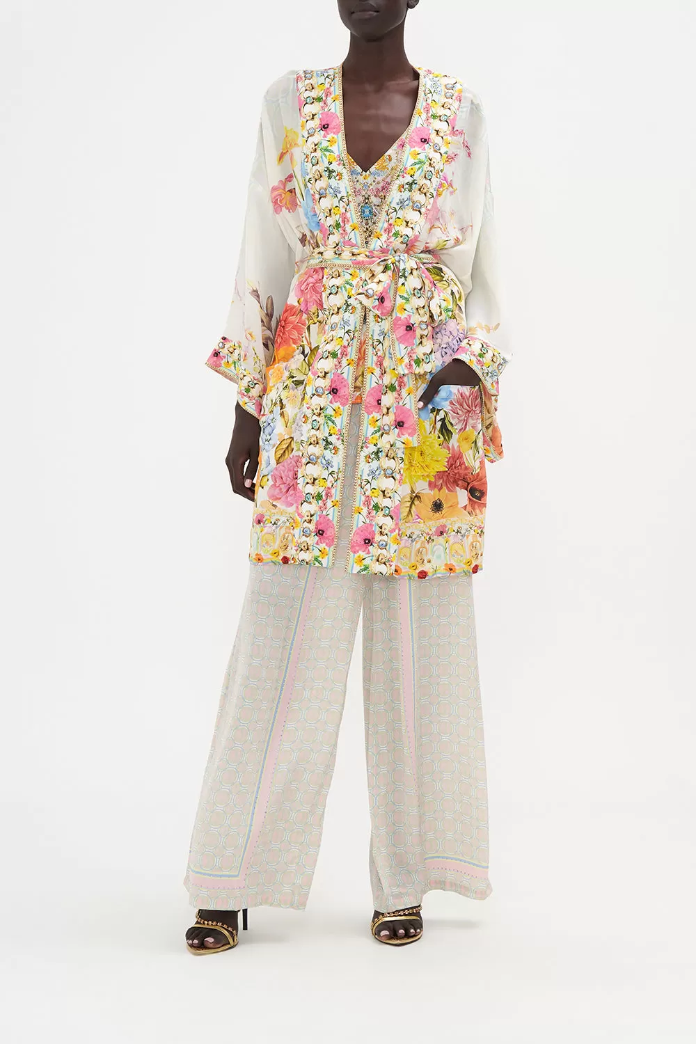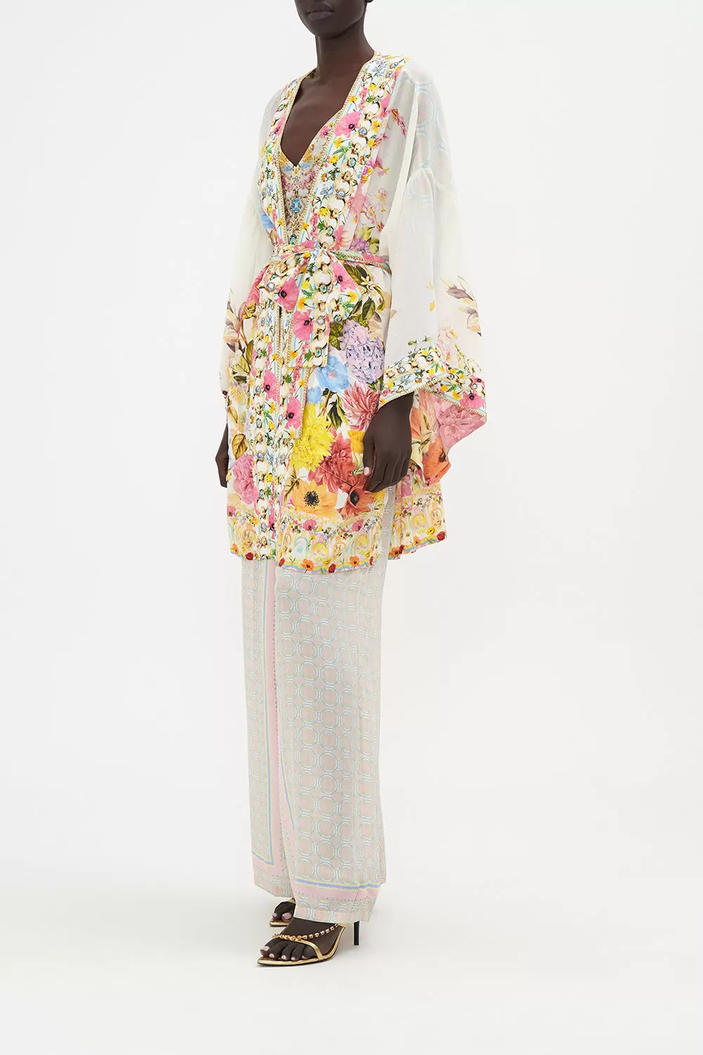 The Sunlight Symphony Kimono With Tie Belt captivates the eye with a soft pink hue finished with poppies wrapped in gentle blues, carnations in blushing tones and the delicate cascade of leafy vines. Crafted with signature CAMILLA silk, this luxury kimono features statement wide sleeves, a waist-tie to cinch and shape, hand-embellished crystals and a relaxed cropped silhouette.