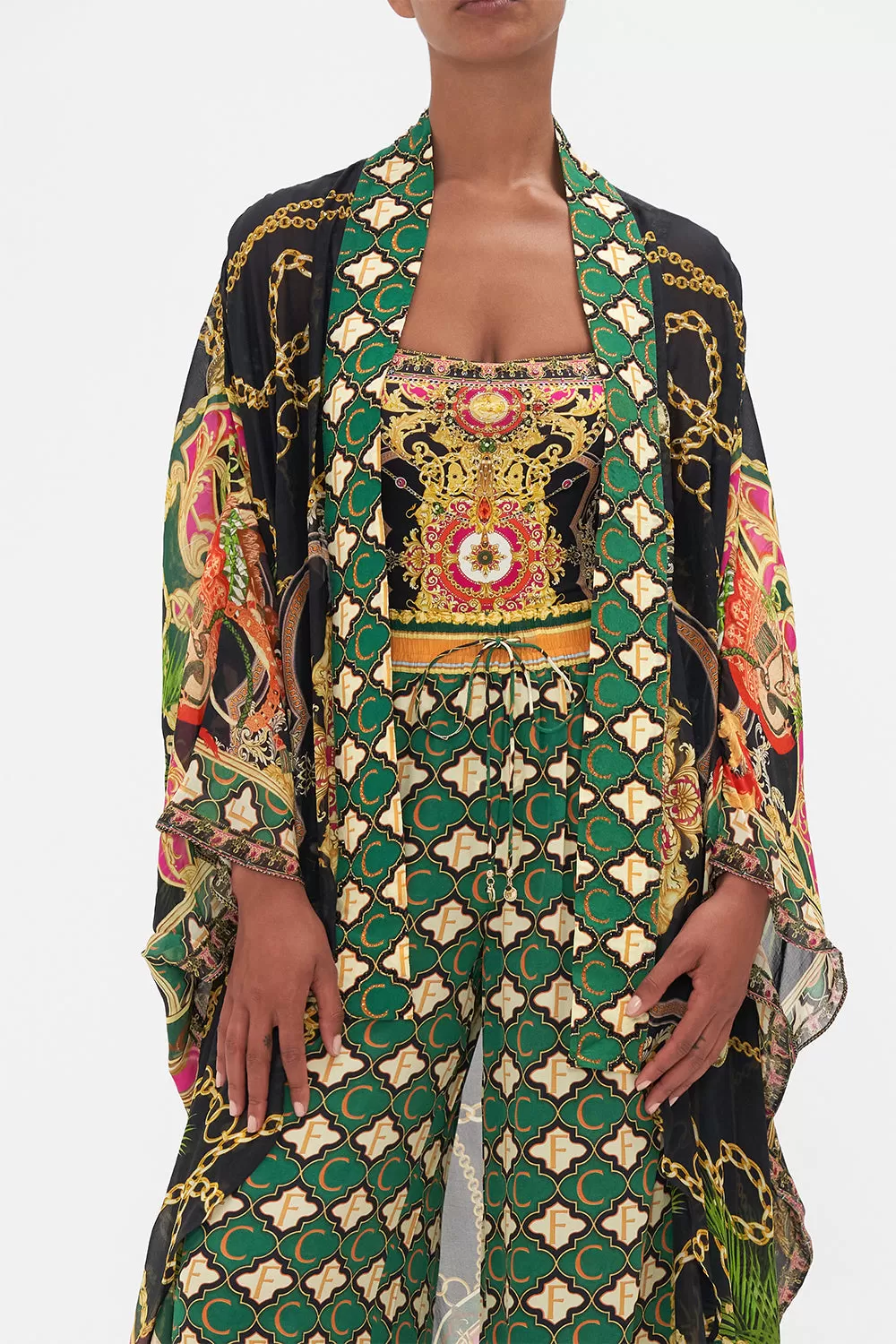 The Jealousy & Jewels Layer With Kimono Collar commands a rhapsody of elegantly curved formations framed with geometric mosaics. Gilded regal crests and equestrian motifs delicately intertwine with a net of gold chains and vibrant emerald green foliage. Crafted from luxurious CAMILLA silk, this statement layer features crystal hand-embellishment, a handkerchief-style hem that drapes upon the leg, contrasting neck bands and a lavishly relaxed silhouette. Lovingly handcrafted and designed in Australia, explore more from The Moral Of The Story: Act II collection.