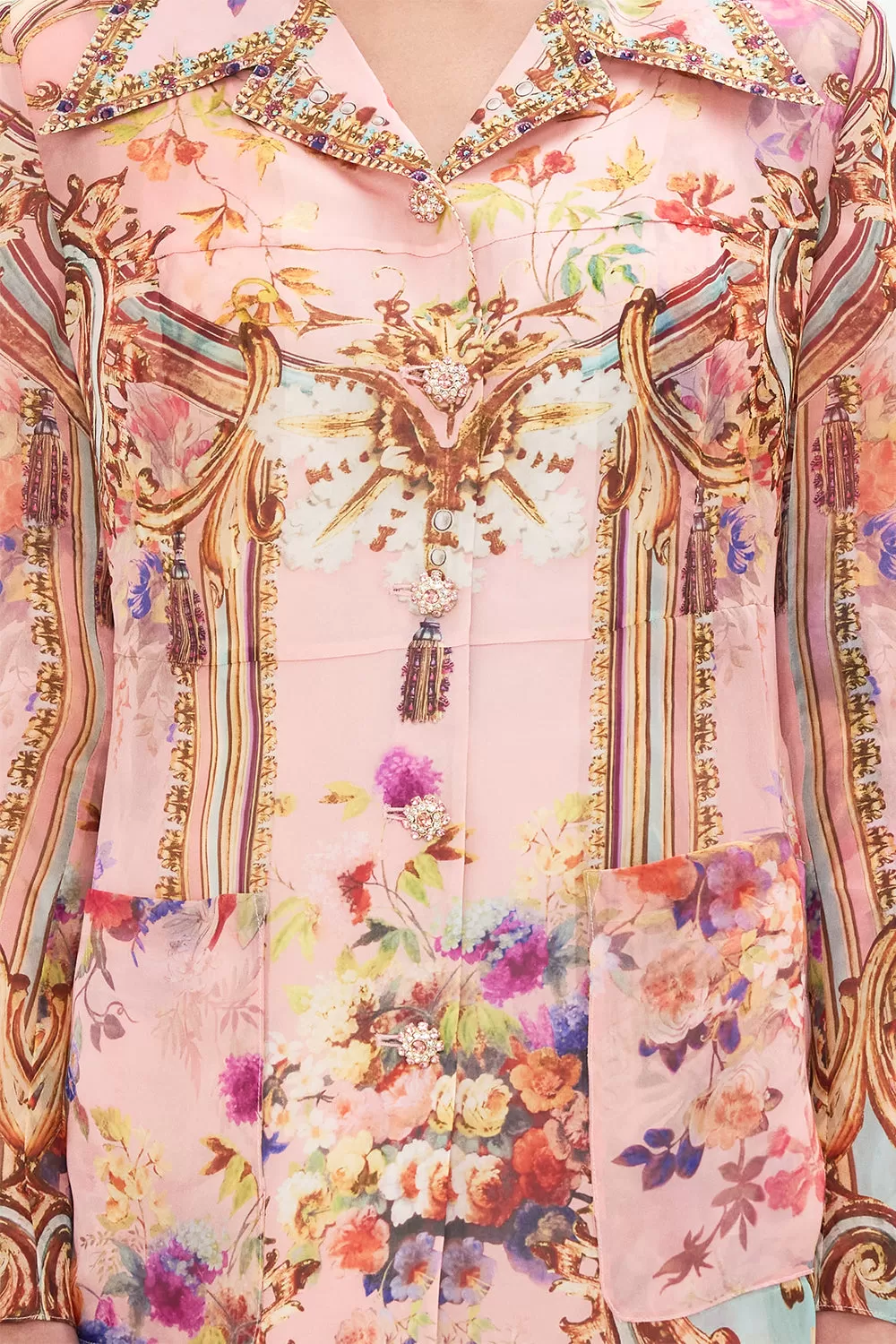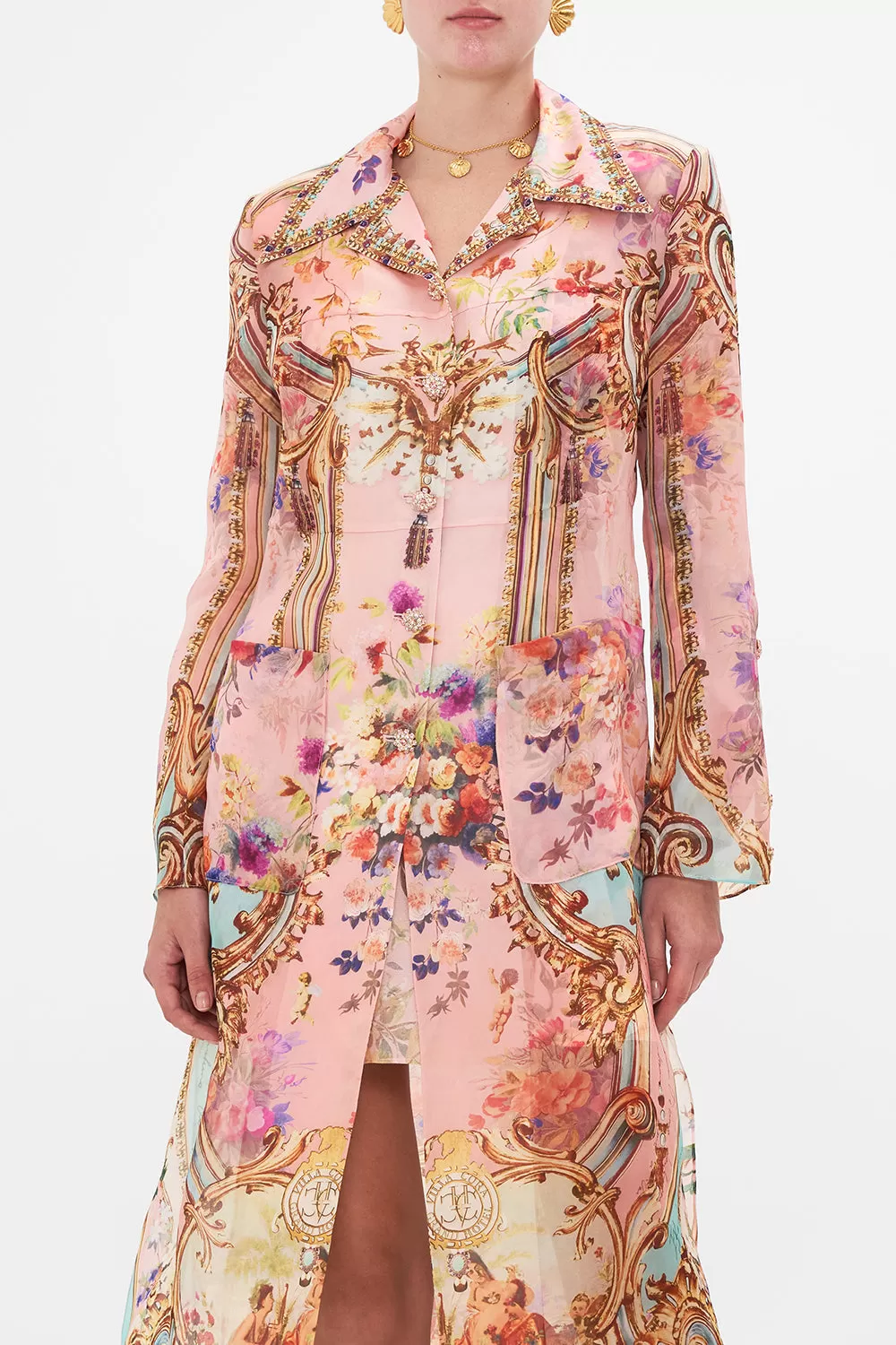 The Letters From The Pink Room Long Button Front Coat depicts an atmosphere of soft pink with turquoise highlights amongst a world of pretty blooms and golden filigree. Make a bold statement with this luscious longline printed coat featuring a single breasted button enclosure, fully lined, contrasting front patch pockets and sculpted lapels to elevate and accentuate the structured silhouette. The ultimate in luxe layering, an opulent outerwear piece to wear back with Letters From The Pink Room V-Neck Slip Dress. Lovingly handcrafted, designed in Australia. Explore more from the Amore Mio collection.