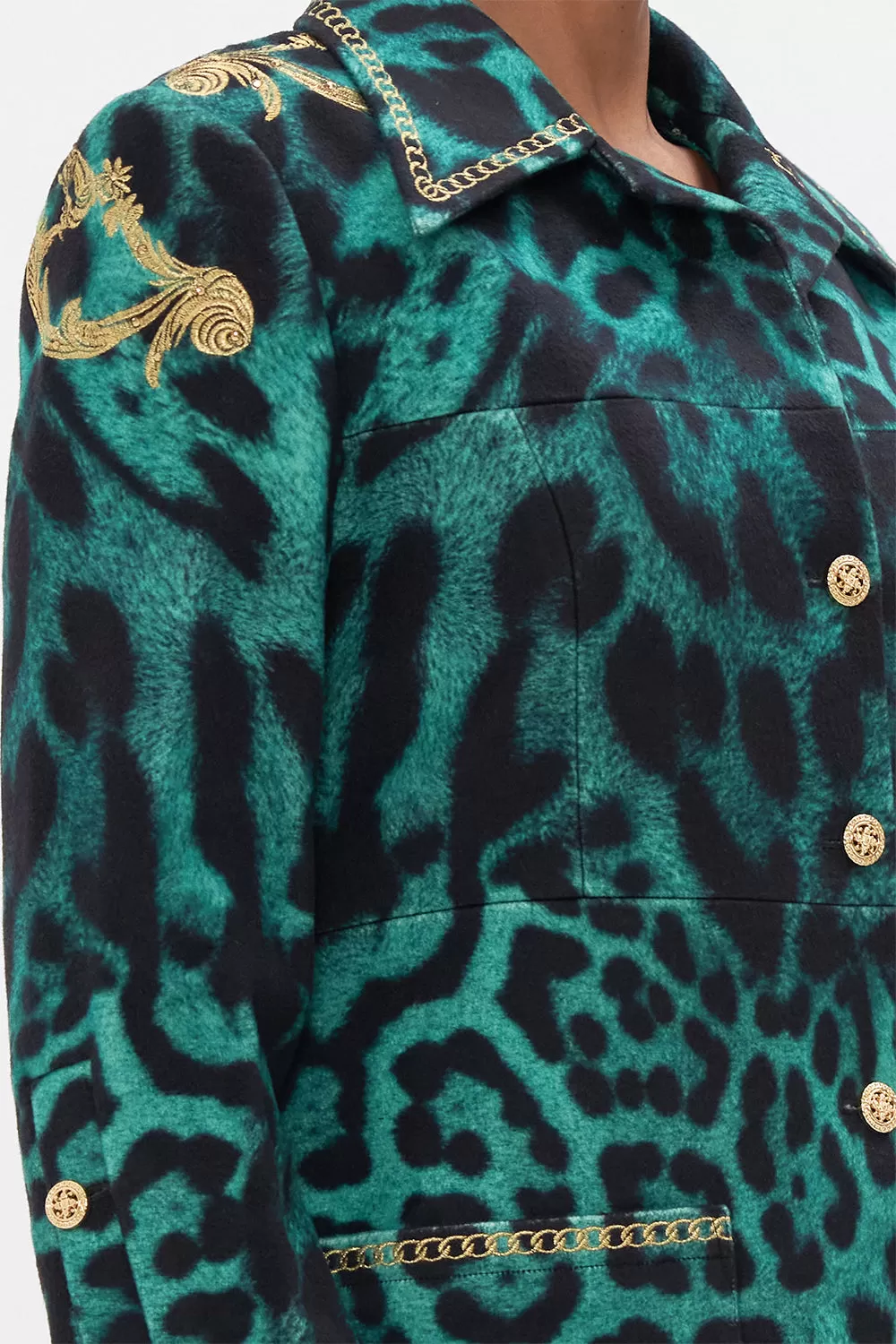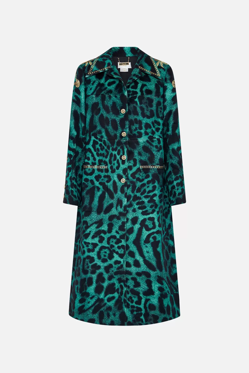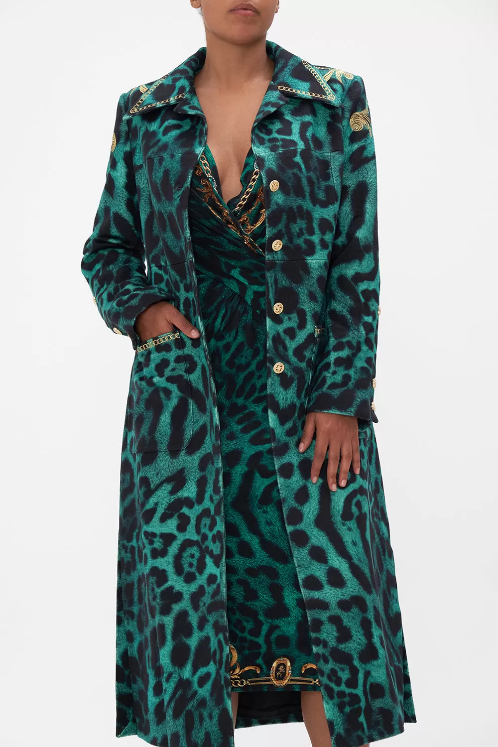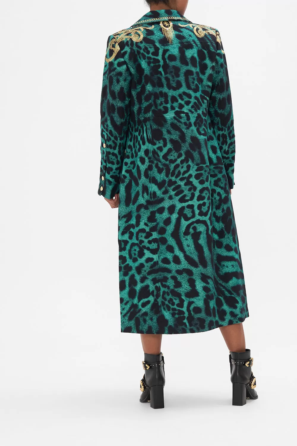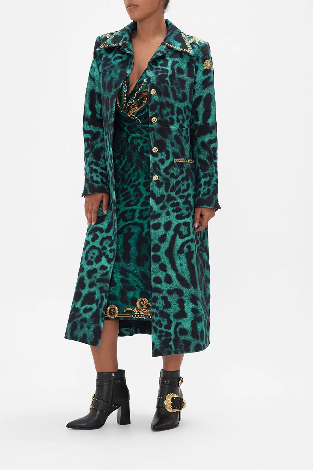 The Sing My Song Long Button Front Coat explores lush jungle green hues of sleek feline fauna guarding fine strands of sparkling amulets and winding vines of golden sprigs. This sleek tailored longline coat features a classic single breasted button enclosure, is fully lined, with functional outer patch pockets and sharp lapels to elevate and accentuate the structured silhouette. Lovingly handcrafted and designed in Australia, explore more from The Moral Of The Story: Act II collection.