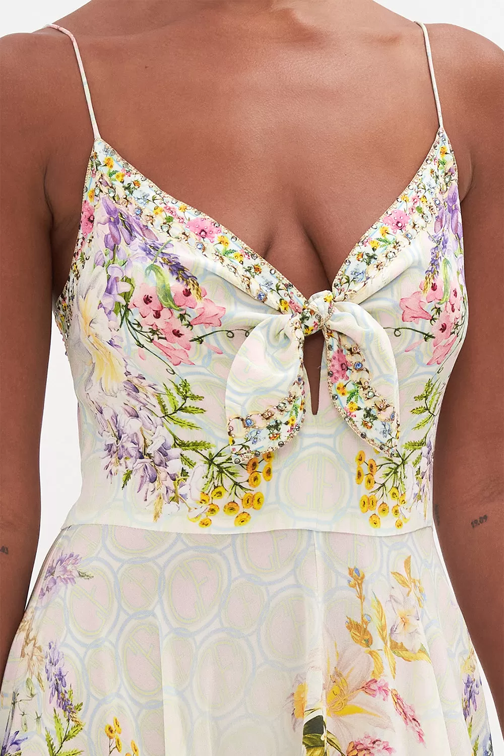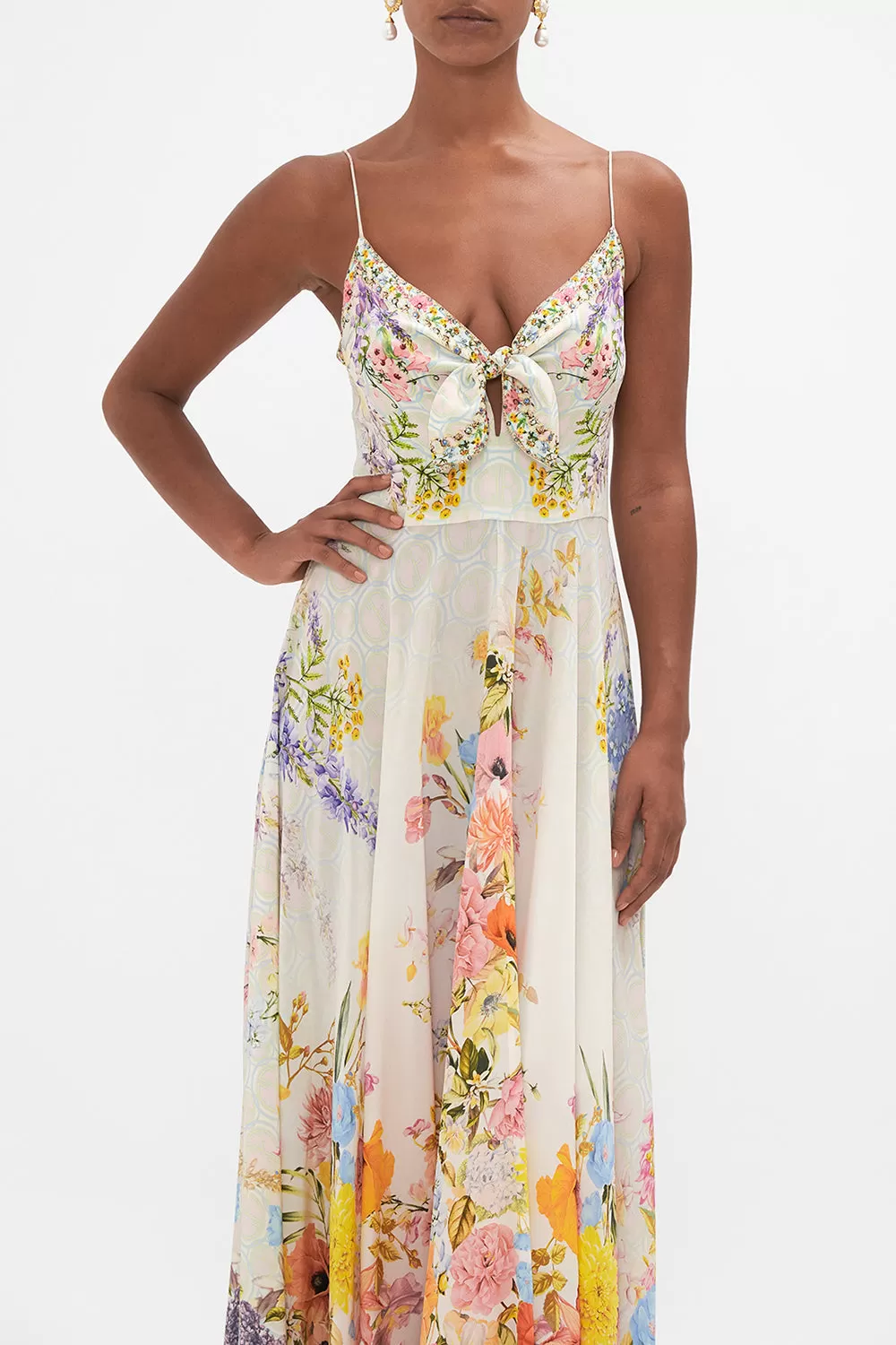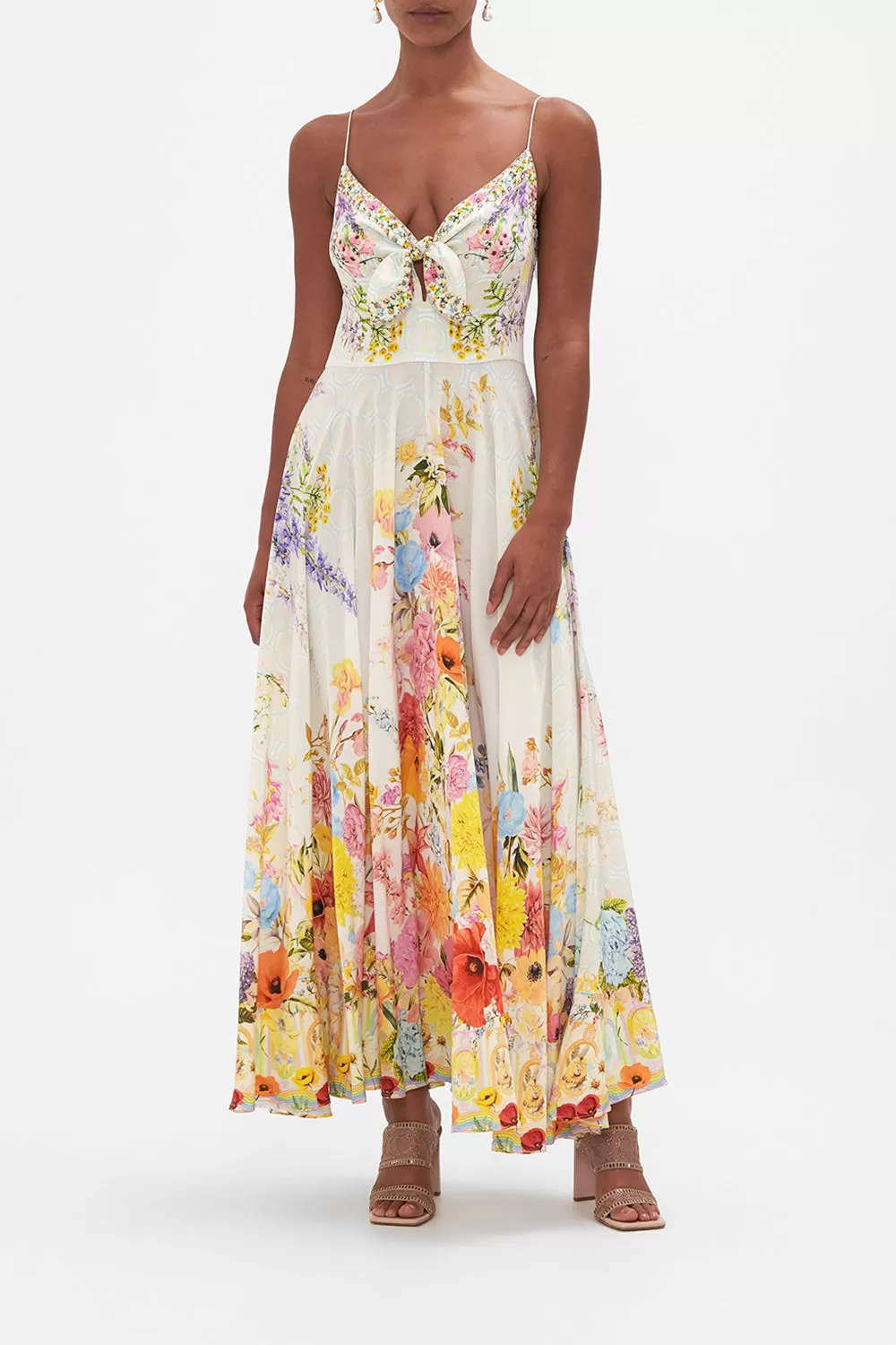 The Sunlight Symphony Long Dress With Tie Front captivates the eye with a soft pink hue finished with poppies wrapped in gentle blues, carnations in blushing tones and the delicate cascade of leafy vines. Adorning hand-embellished CAMILLA crystals, this luxury silk dress plays host to tie detailing at the sweetheart neckline, a fitted waist to cinch and shape, dainty shoestring straps and a relaxed silhouette that falls into a flared hemline.