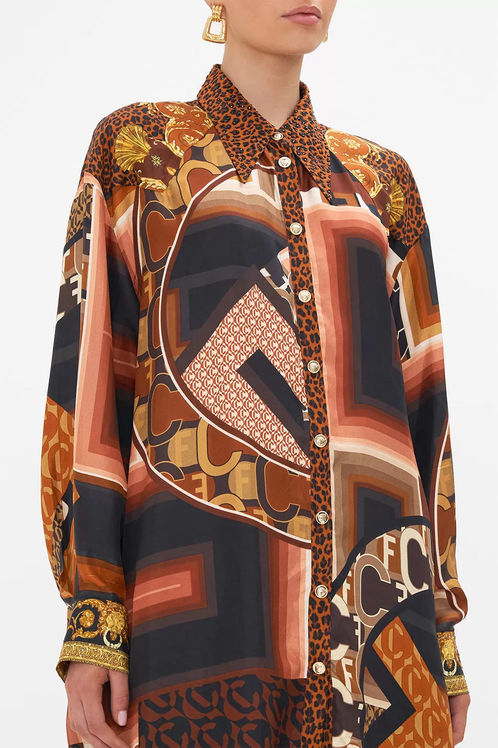 The Feeling Fresco Longline Shirt With Yoke And Button Detail explores the soft curves lined with monogrammed moments paying homage to vintage scarf motifs. Immaculately crafted, this luxe silk tunic shirt features front and back yoke panels, softly tailored cuffs, collar and front placket with press button enclosure, CAMILLA crystal embellishments and box pleat detail at the back body for an accentuated oversized silhouette. Versatile as a tunic length shirt dress or a button down tunic layered with matching Feeling Fresco Straight Leg Pant. Lovingly handcrafted, designed in Australia. Explore more from the Amore Mio collection.
