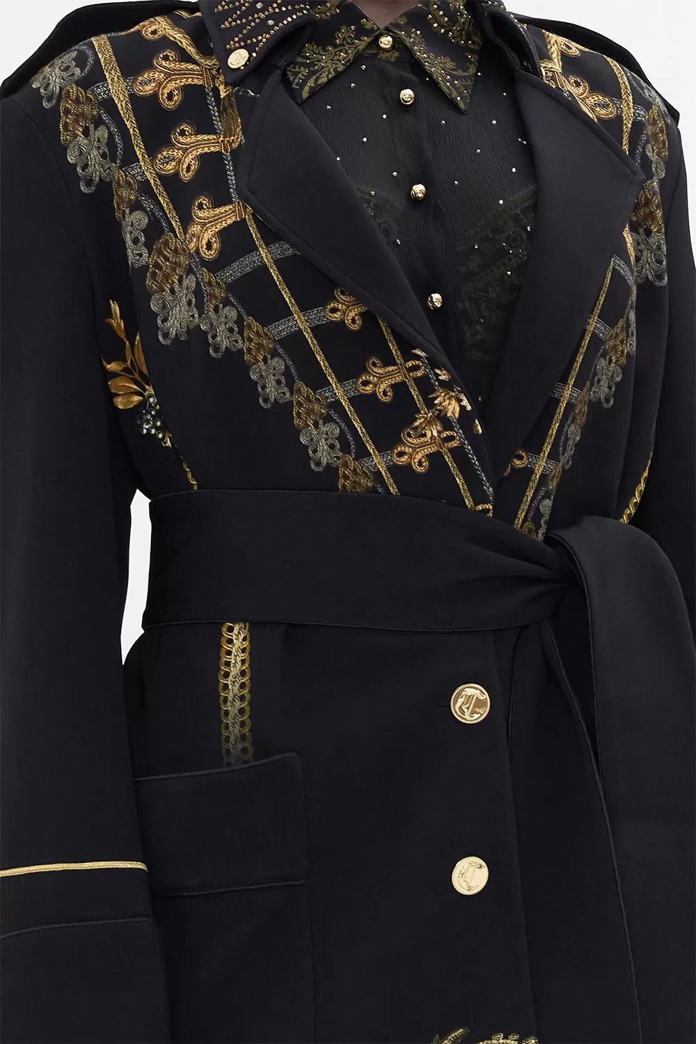 The Night is Noir Long Military Coat explores a mesmorising sea of midnight hues finished with ornate golden swirls that dance alongside decadent botanical details and exquisite chain cascades. A collector’s treasure made to last a lifetime, this luxury coat is home to a relaxed longline silhouette that adorns classic military-style epaulettes upon the shoulders, a waist-tie to cinch and shape as well as intricate trim detailing.