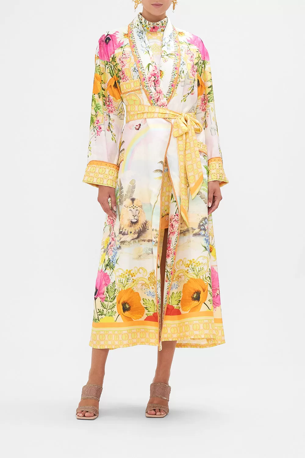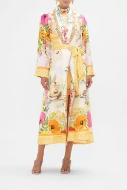 The Sunlight Symphony Long Robe With Tie captivates the eye with a soft pink hue finished with poppies wrapped in gentle blues, carnations in blushing tones and the delicate cascade of leafy vines. Crafted from the softness of silk, this luxury robe is home to a maxi length that wraps around your silhouette with tie fastening, hand-embellished crystals and an effortlessly relaxed fit.