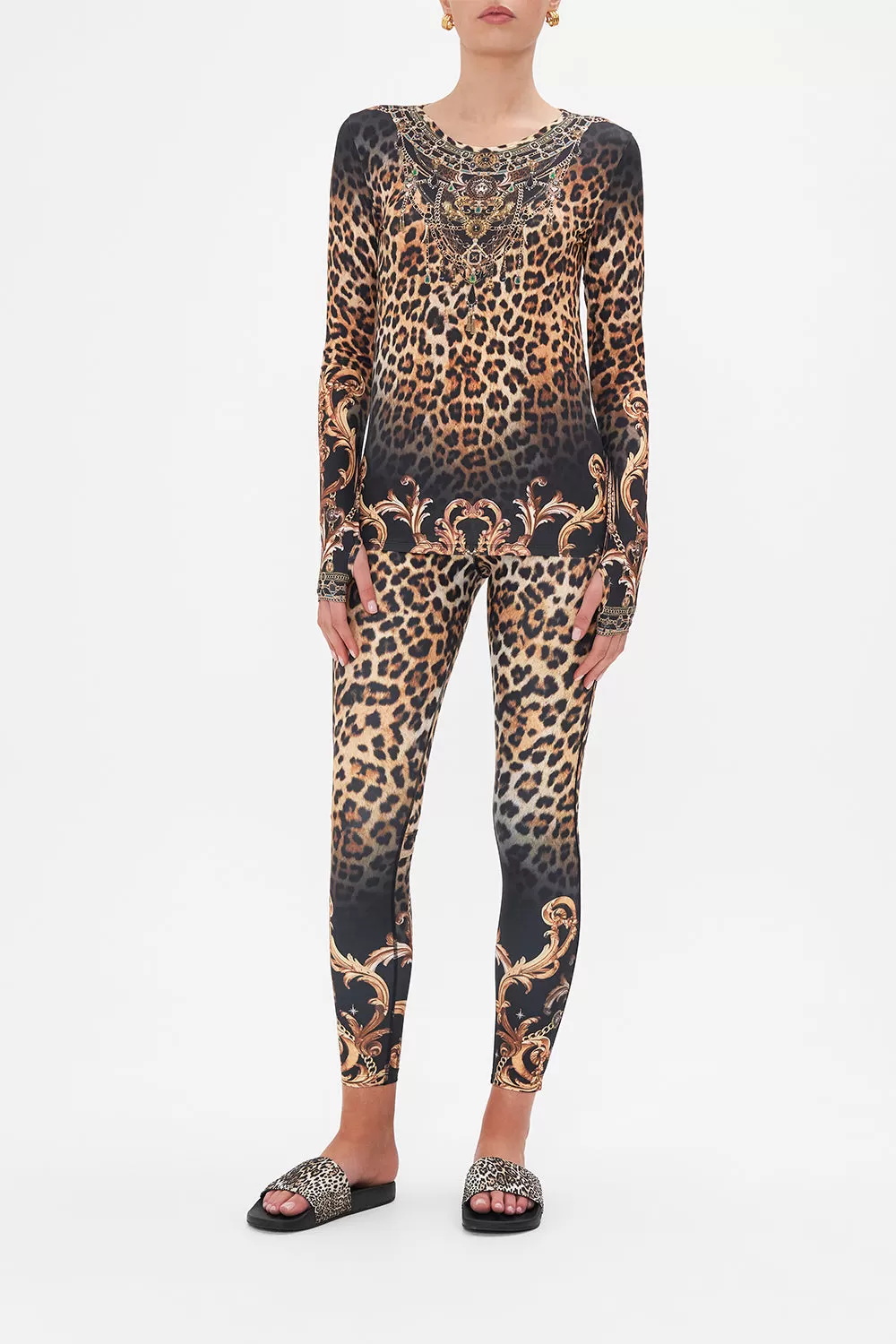 The Running In The Wild Long Sleeve Thumbhole Top embodies a classic leopard print highlighted by golden baroque flourishes intertwined with fine chain and precious charms. Crafted for sleek and elevated everyday wear, this luxury long sleeve top features a fitted silhouette, rounded contrast neckline, thumb hole details and a hip-length hemline. Lovingly crafted and designed in Australia, explore more from The Moral Of The Story: Act II collection.