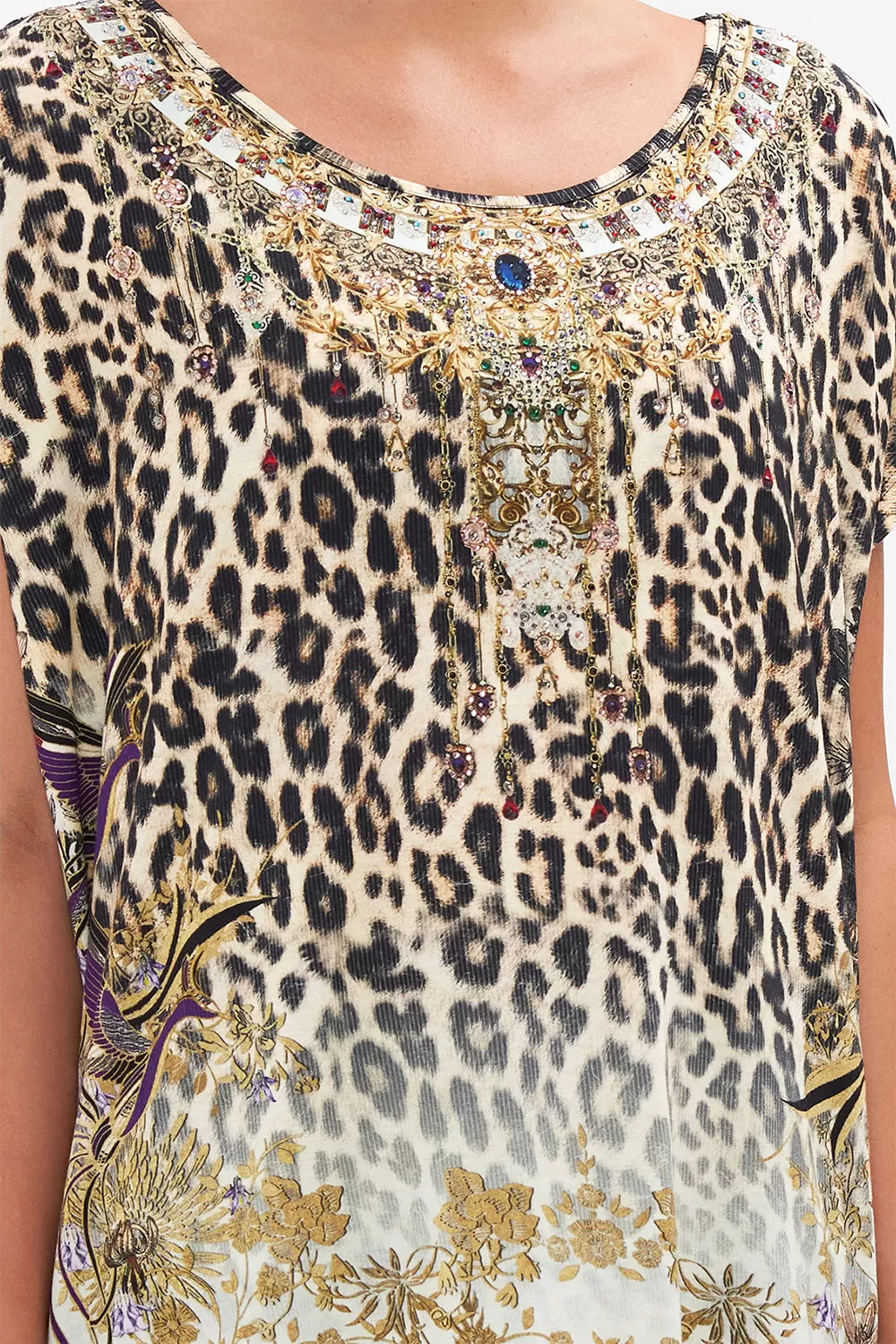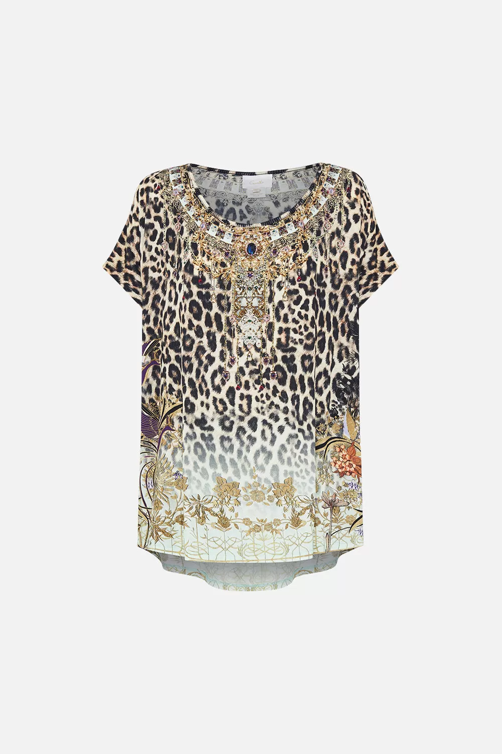 The Nomadic Nymph Loose Fit Tee is enwrapped in a sandy leopard print finished with soft blends of icy blues, vines of golden foliage and birds of ethereality that dance amidst breathtakingly decadent nymphs. Adorning hand-embellished CAMILLA crystals, this luxury tee plays host to soft cropped sleeves, a relaxed silhouette that dances into a shaped high-low hemline and a classic rounded neckline.