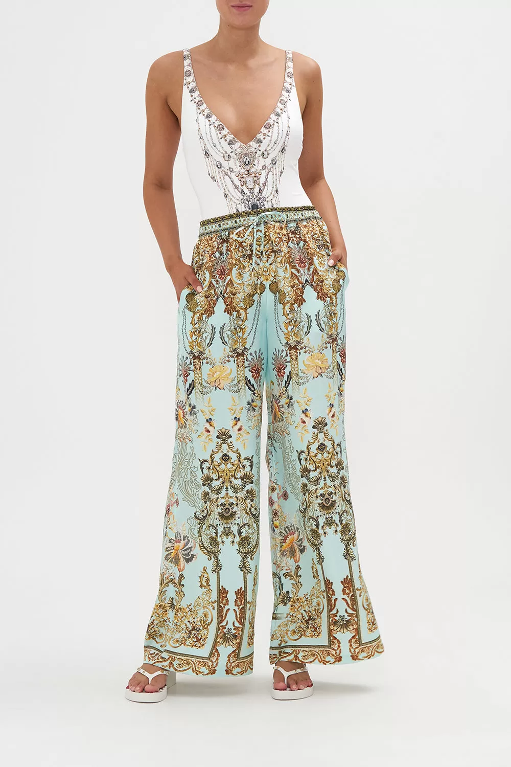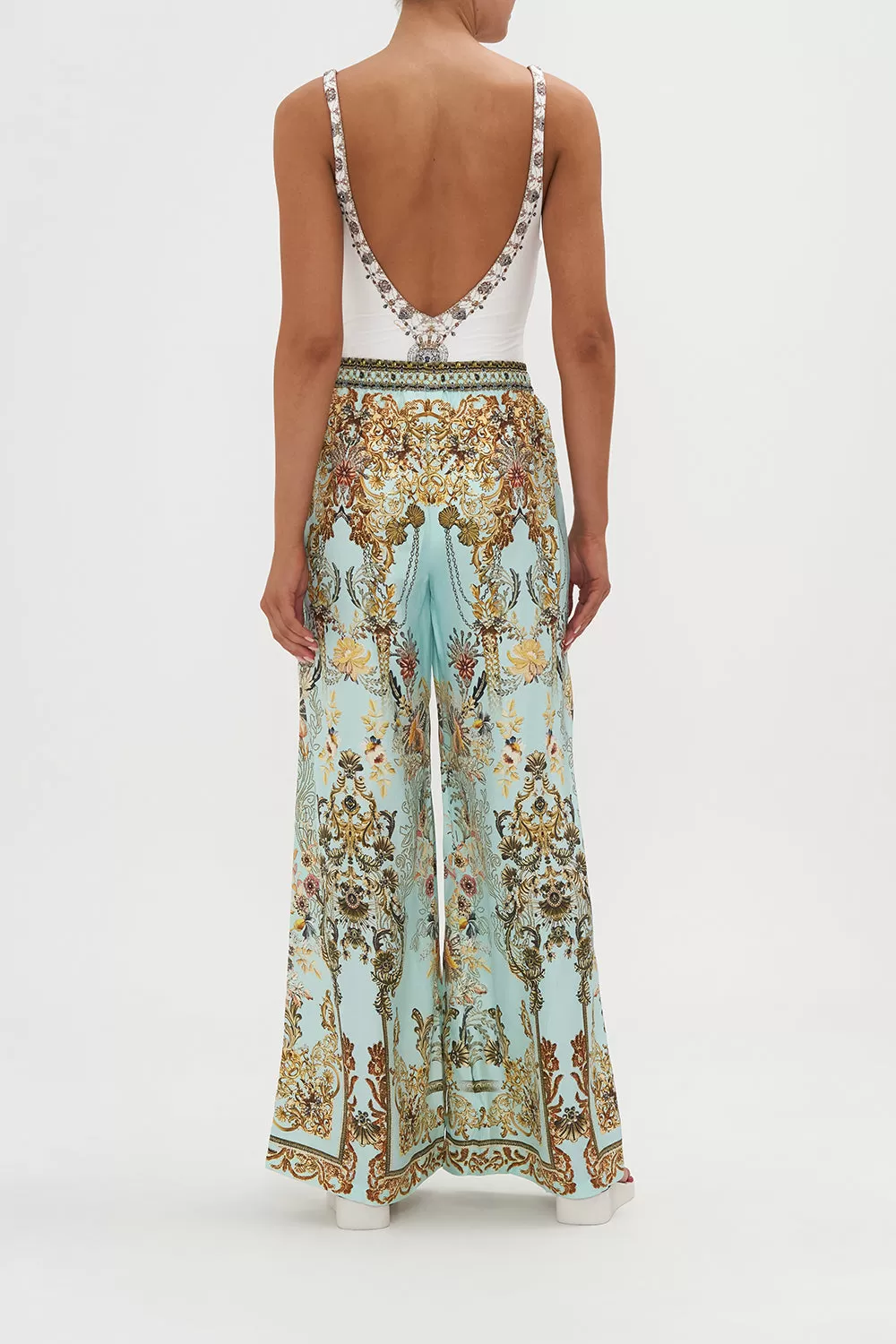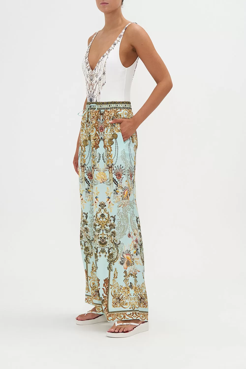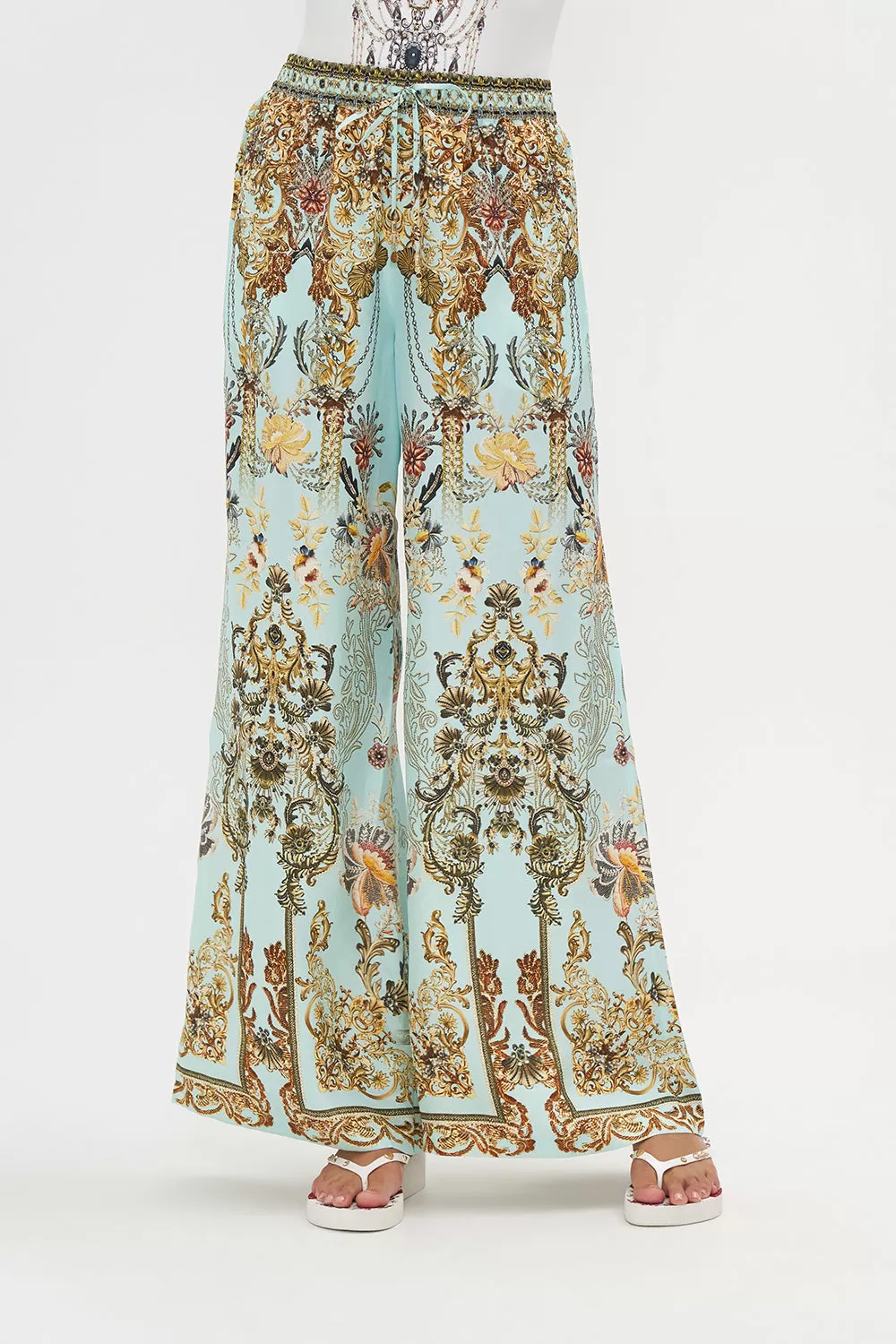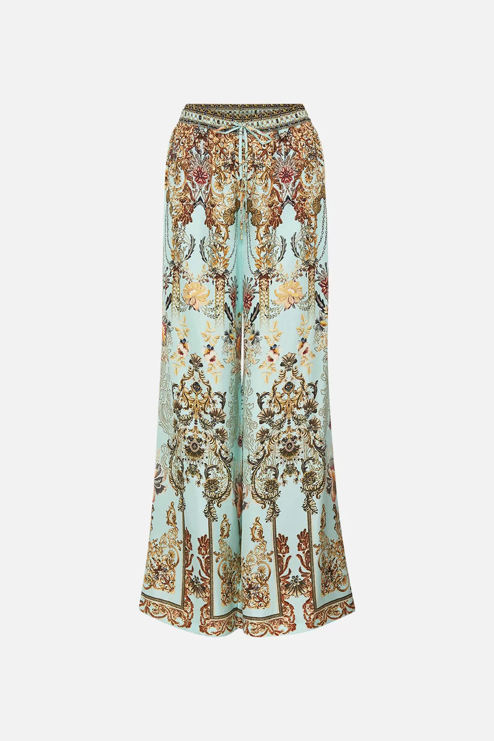 The Adieu Yesterday Lounge Pant explores a mesmorising sea of celestial blue hues finished with ornate golden swirls that dance alongside decadent botanical details and exquisite chain cascades. Crafted from lavishly soft silk, this luxury palazzo pant plays host to an elasticated drawstring waist to cinch and shape, gold hardware accents, pocket functionality and a relaxed wide leg pant.