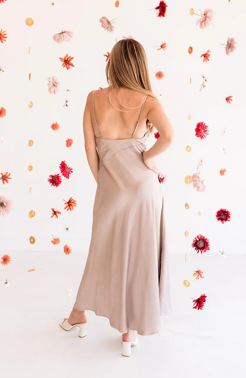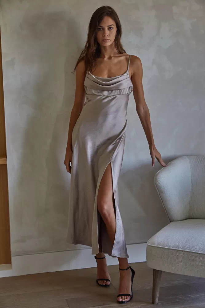 Our Lucia Satin Cowl Neck Maxi Dress is perfect for a spring wedding or any holiday party! Designed with a cowl neckline and a zipper back closure.