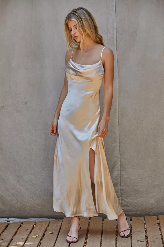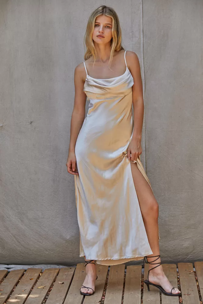 Our LuciaΒ Satin Cowl Neck Maxi Dress is perfect for a spring wedding or any holiday party! Designed with a cowl neckline and aΒ zipper back closure.