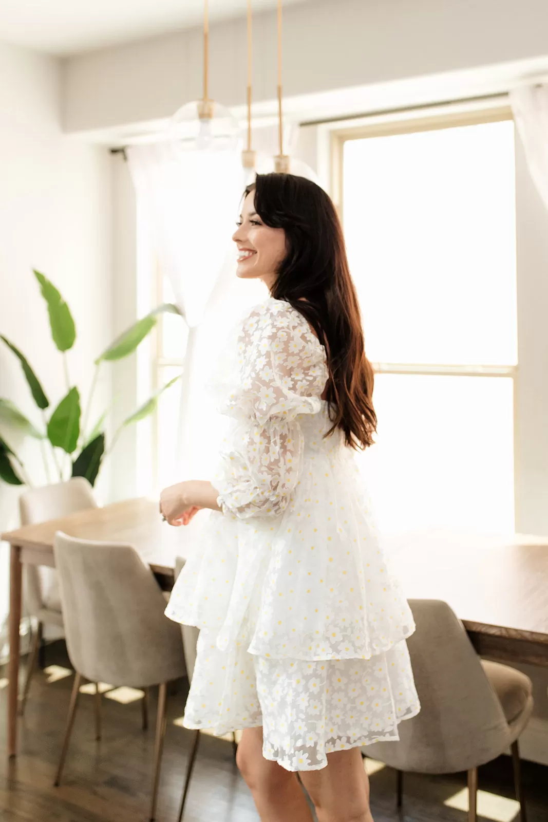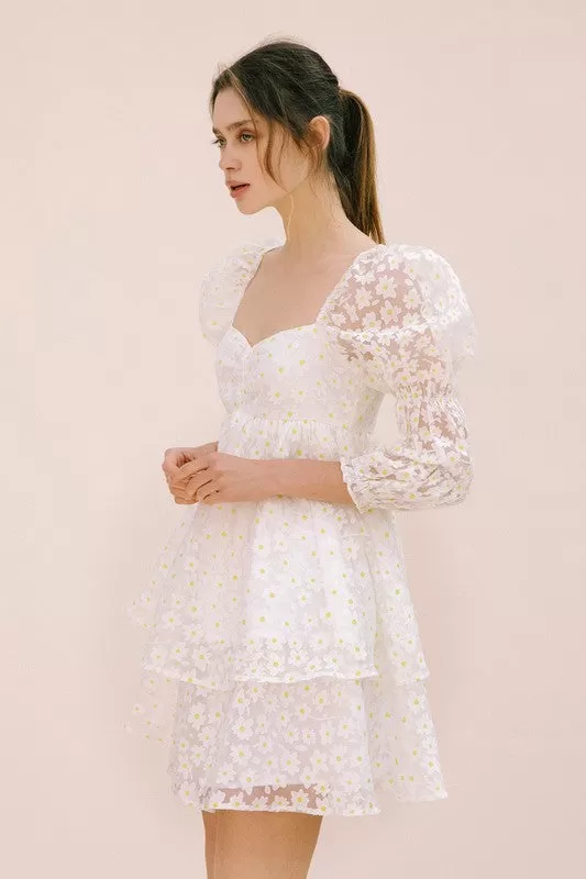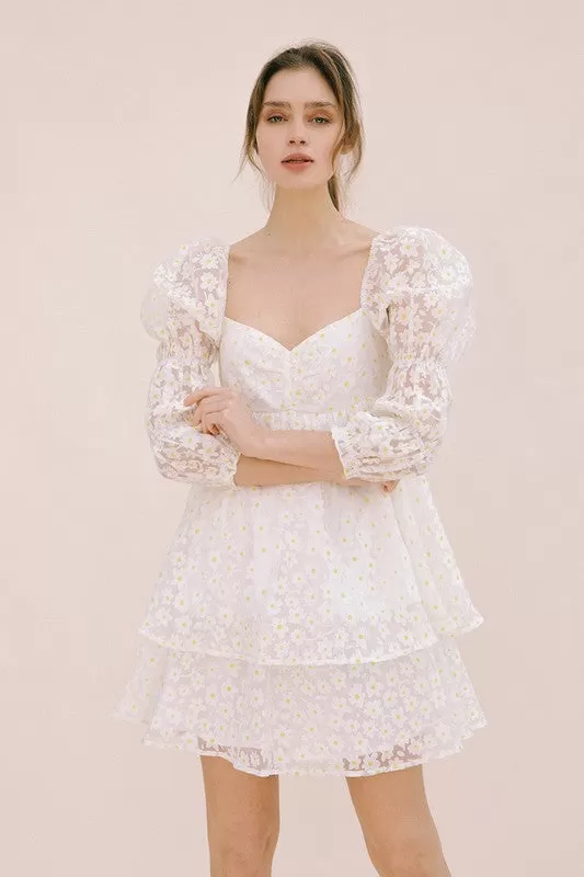 //Best Seller// Our Marly Daisy Applique Floral Babydoll Dress comes in the cutest print! This white daisy floral high sheen dress has puff sleeves and a concealed back zip closure. The embroidered daisy give it that much detail!