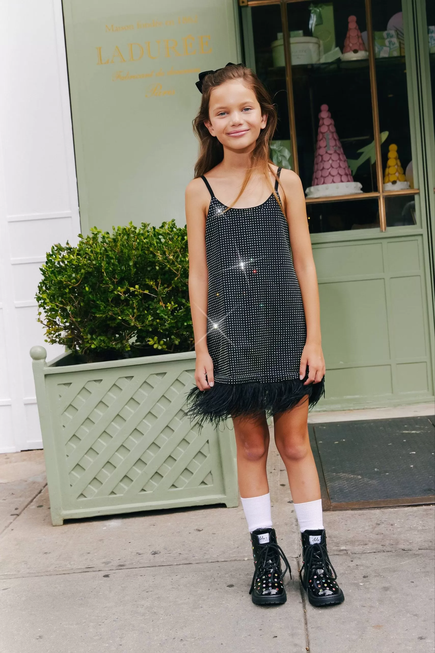 - Styled with feather trimsÂ