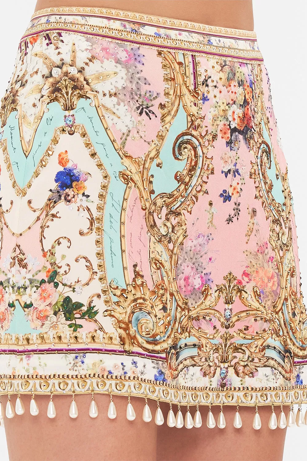 The Letters Front The Pink Room Mini Skirt depicts an atmosphere of soft pink with turquoise highlights amongst a world of pretty blooms and golden filigree. Adorned with CAMILLA crystals, this luxury mini skirt plays host to a high-rise cut that elongates the legs, invisible zip fastening, a cropped length and back dart detailing. Pair with the Letters From The Pink Room Curved Collar Blouse for luxe co-ord styling. Lovingly handcrafted, designed in Australia. Explore more from the Amore Mio collection.