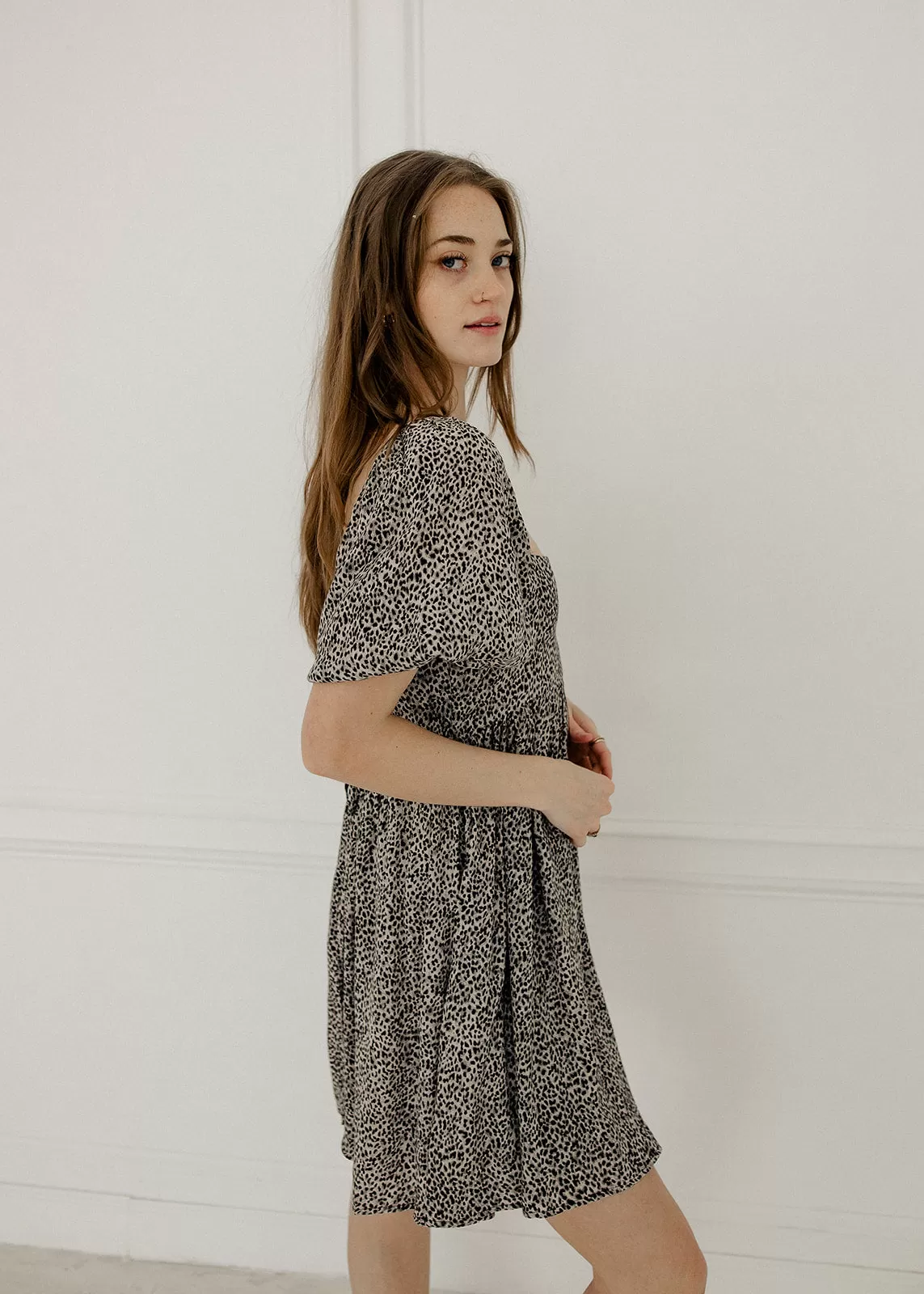 We love a puff sleeve babydoll dress! Our Murphy Leopard Puff Sleeve Babydoll Dress is the essence of spring with its charcoal base and leopard print throughout. This square neck dress has a tiered body and a back tie closure.