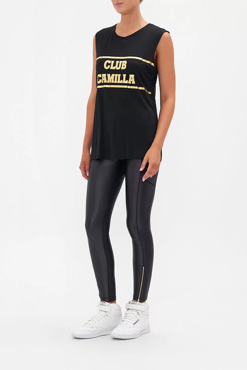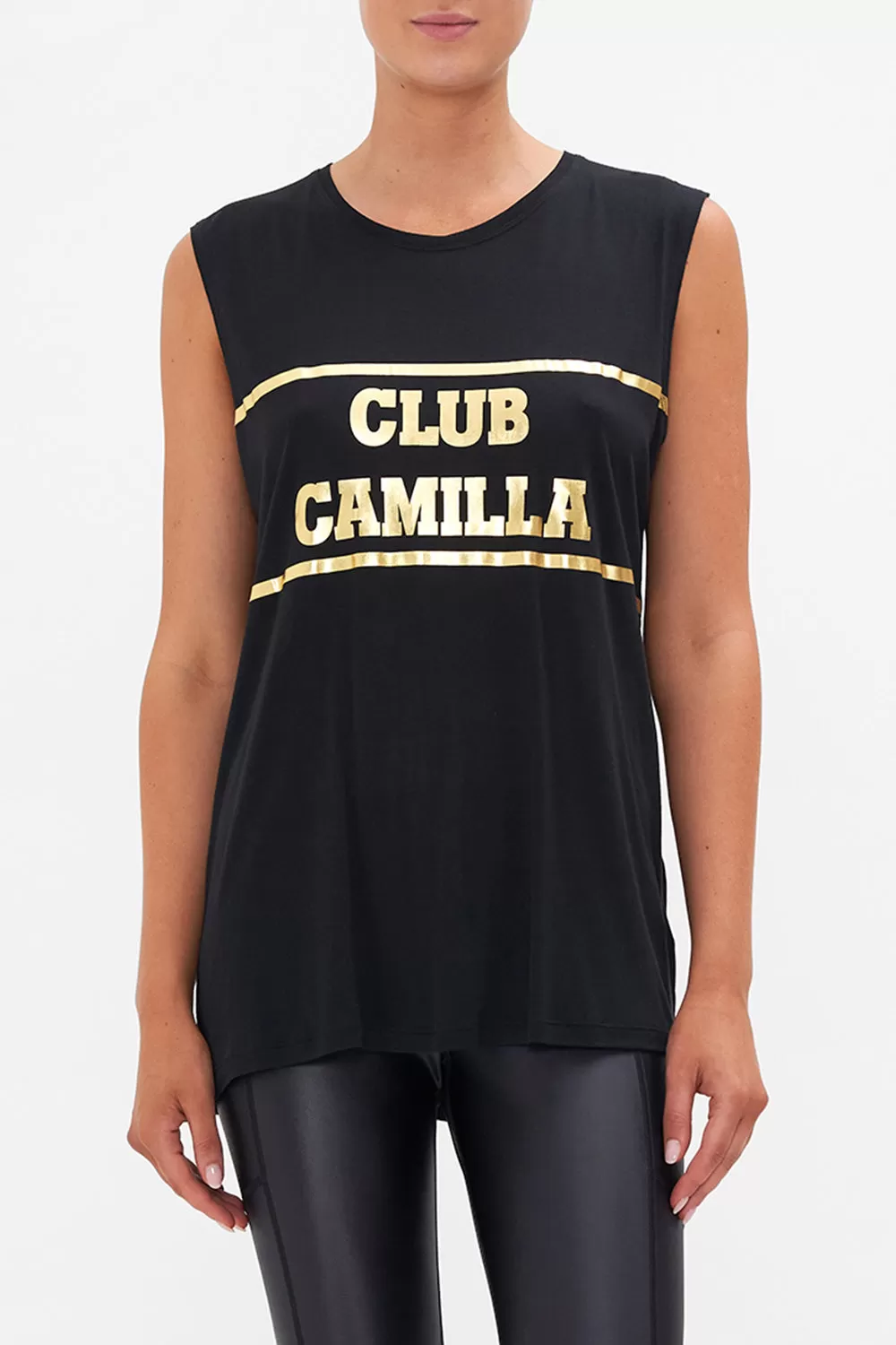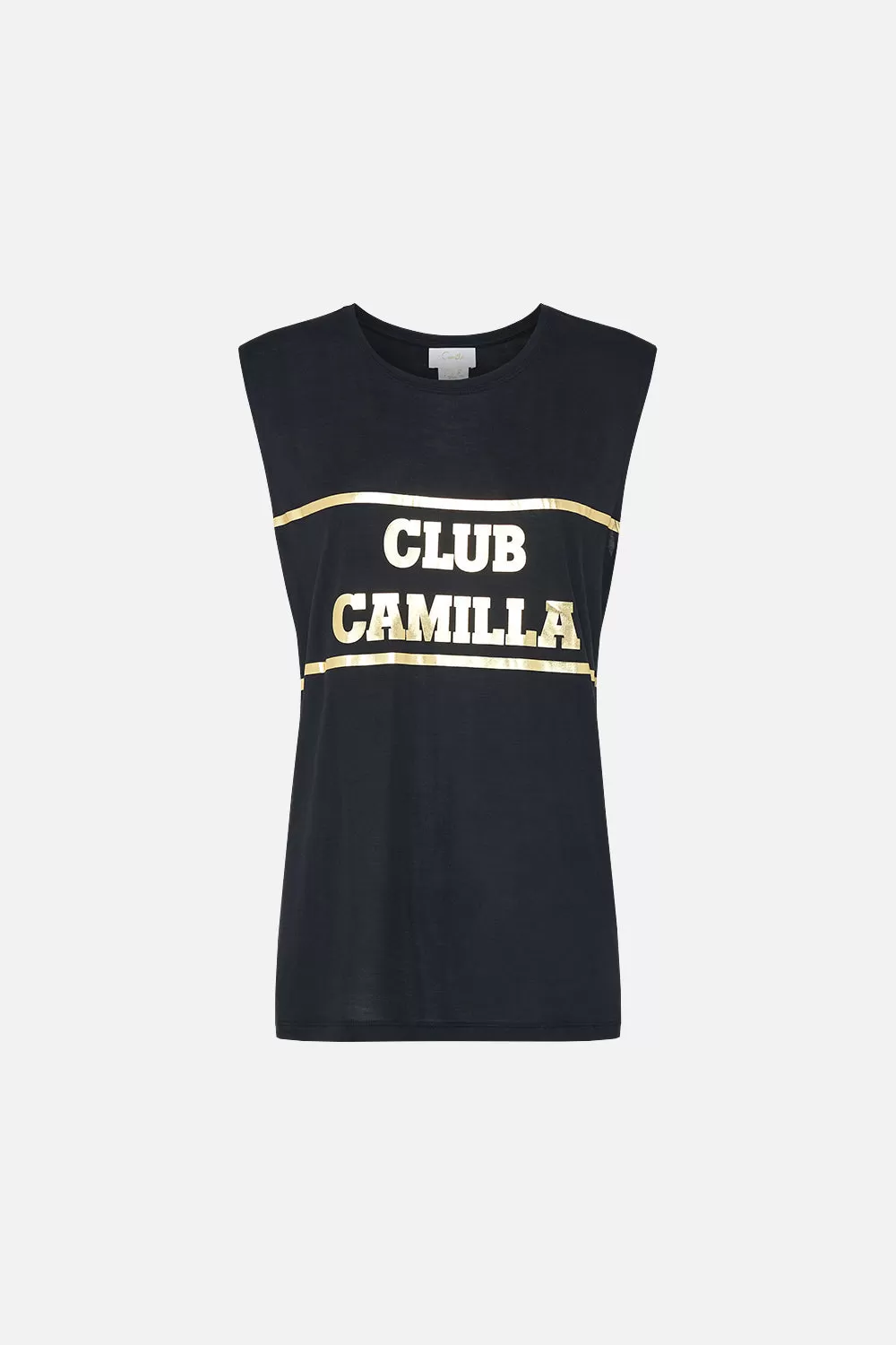 The Under The Neon Sun Muscle Tank explores a realm of midnight hues finished with our CLUB CAMILLA namesake in shades of decadent gold metallics. Crafted from breathable modal, this luxury muscle tank sports a classic rounded neckline that falls into a relaxed silhouette, our signature logo adornment and a sleeveless cut.