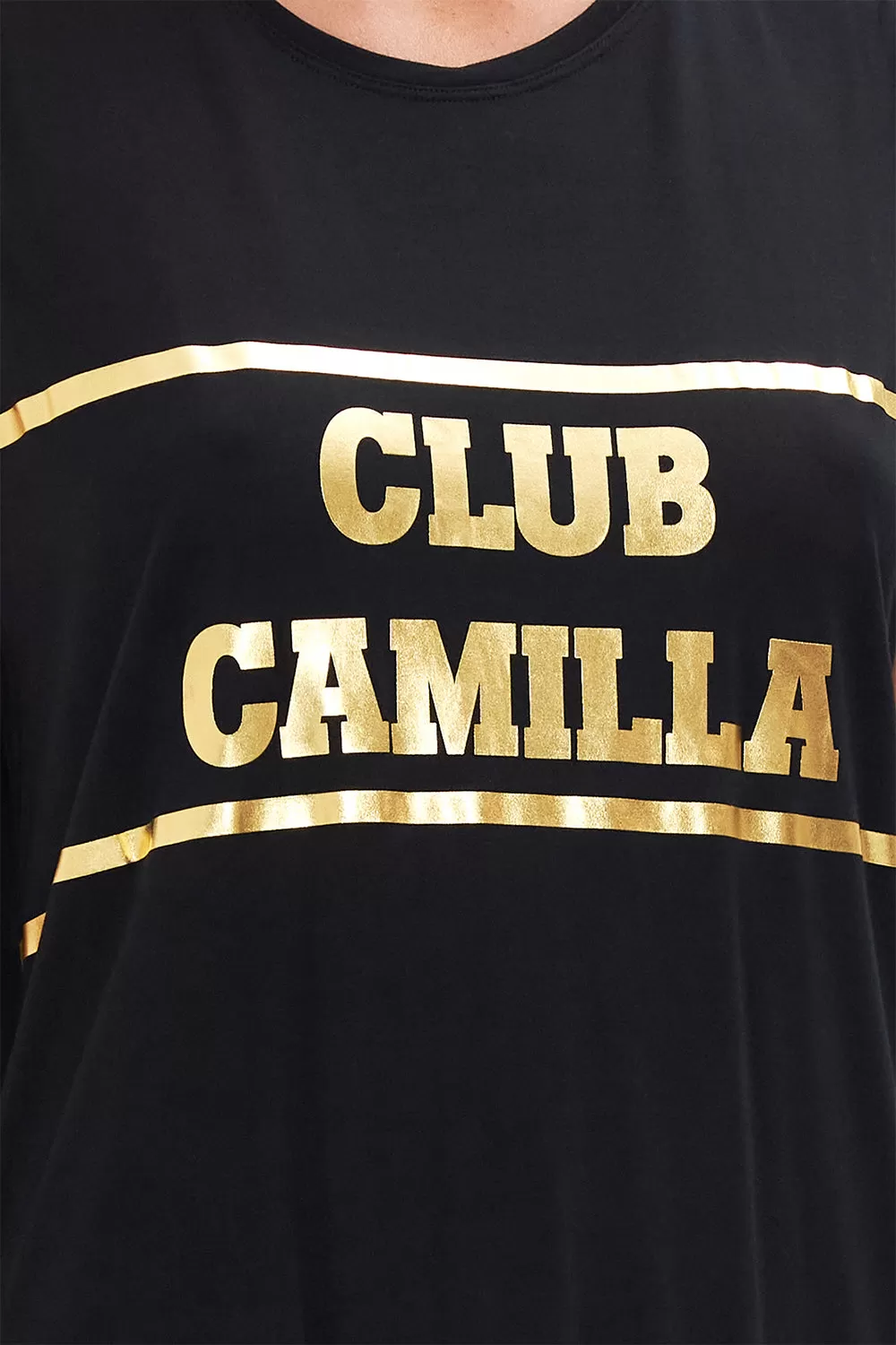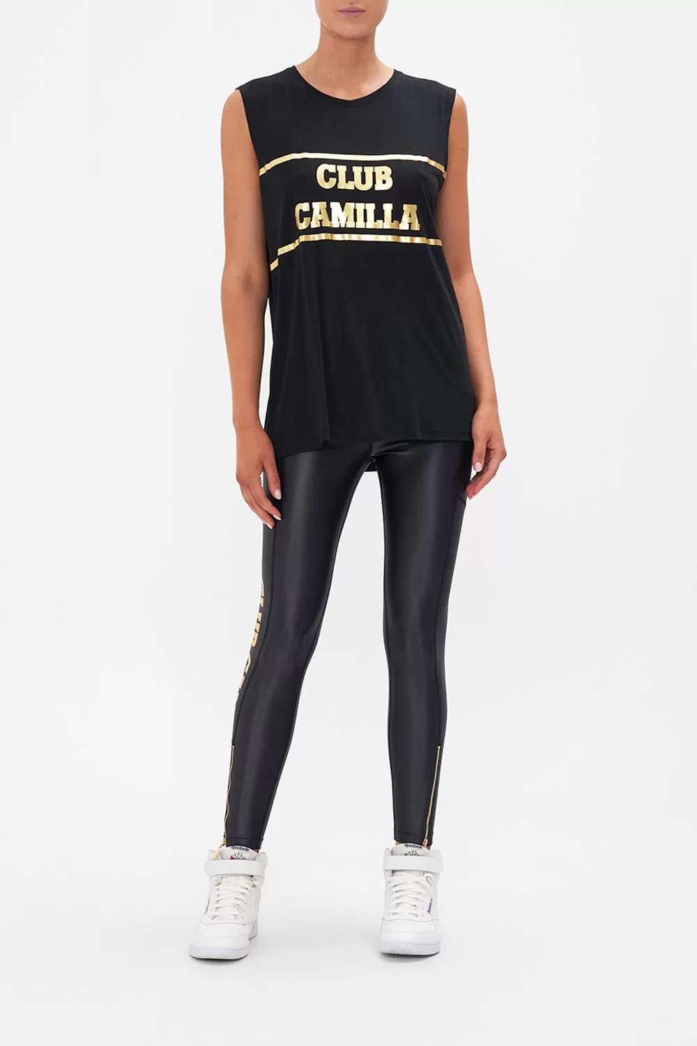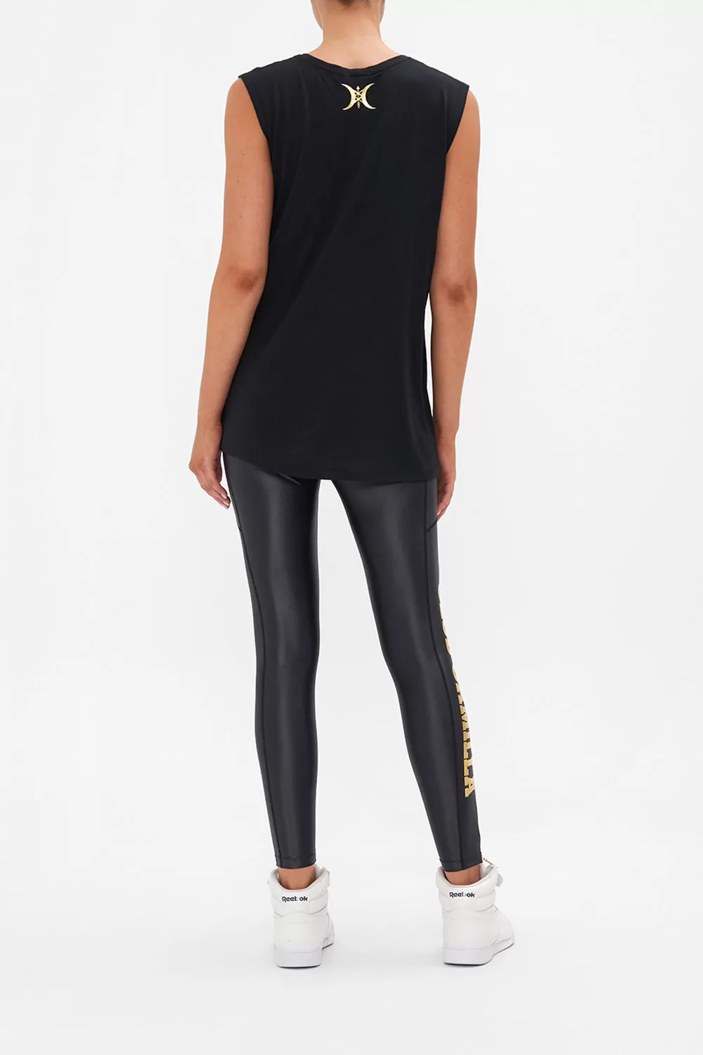 The Under The Neon Sun Muscle Tank explores a realm of midnight hues finished with our CLUB CAMILLA namesake in shades of decadent gold metallics. Crafted from breathable modal, this luxury muscle tank sports a classic rounded neckline that falls into a relaxed silhouette, our signature logo adornment and a sleeveless cut.