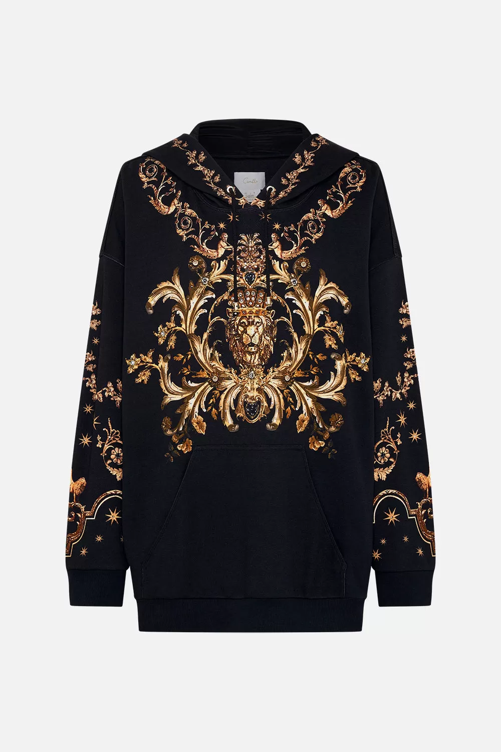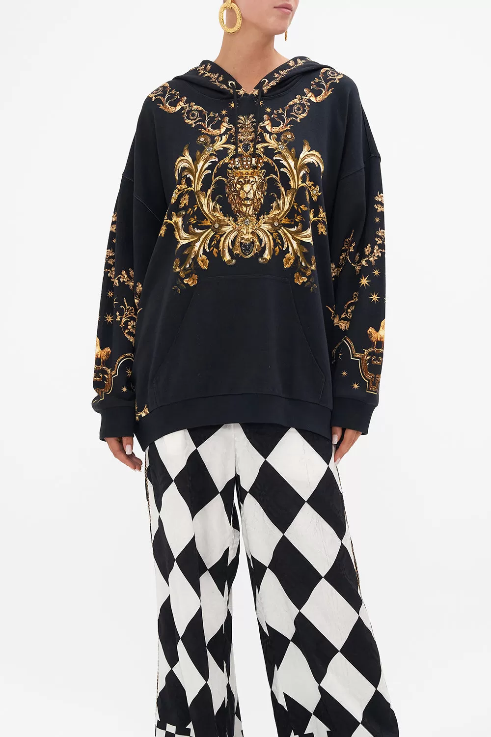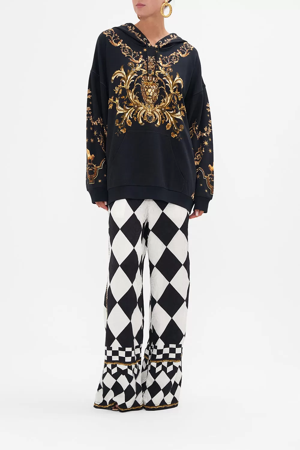 The Duomo Dynasty Oversized Boyfriend Hoodie is a symphony of sculptural palatial curves. A striking mosaic of onyx and gold highlights the glimmering gold charms and royal crests imbued in myth and magic. Adorned with shimmering crystals, this luxury oversized hoodie features a drawstring hood with gold hardware tassels, relaxed fit, and ribbed details at the cuffs and hem. Create a luxe lounge look with the Duomo Dynasty Leggings .Lovingly handcrafted, designed in Australia. Explore more from the Amore Mio collection.