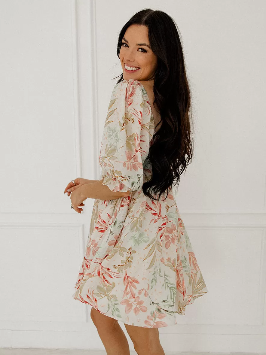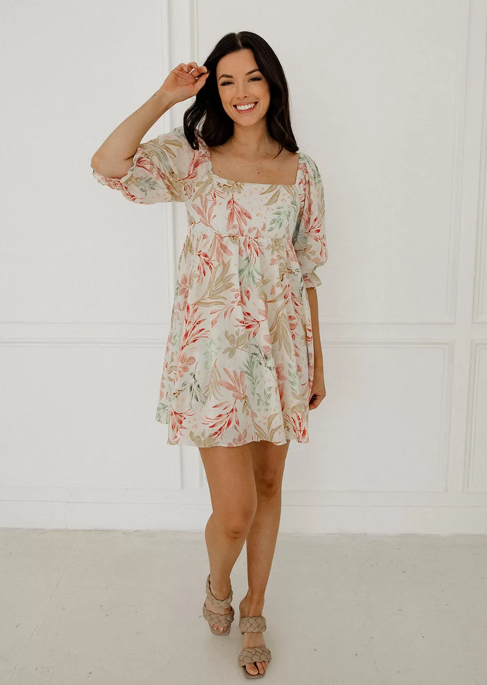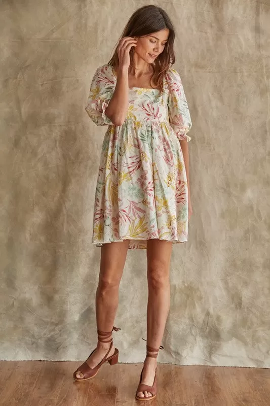 We love a dress that’s equally as cute as it is comfortable! Our Paradiso Puff Sleeve Babydoll Dress is a cream base with florals in mint, pink and mustard. The babydoll silhouette and square neckline make this dress so cute & fun!
