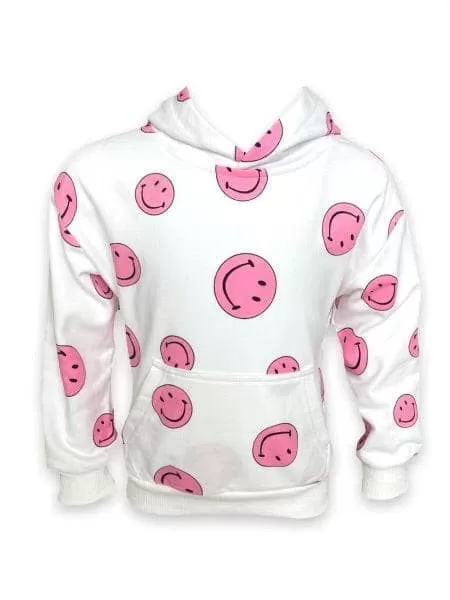 - White soft fleece hoodie covered in hot pink smiley emojis