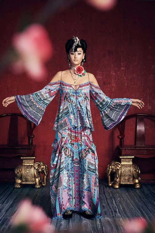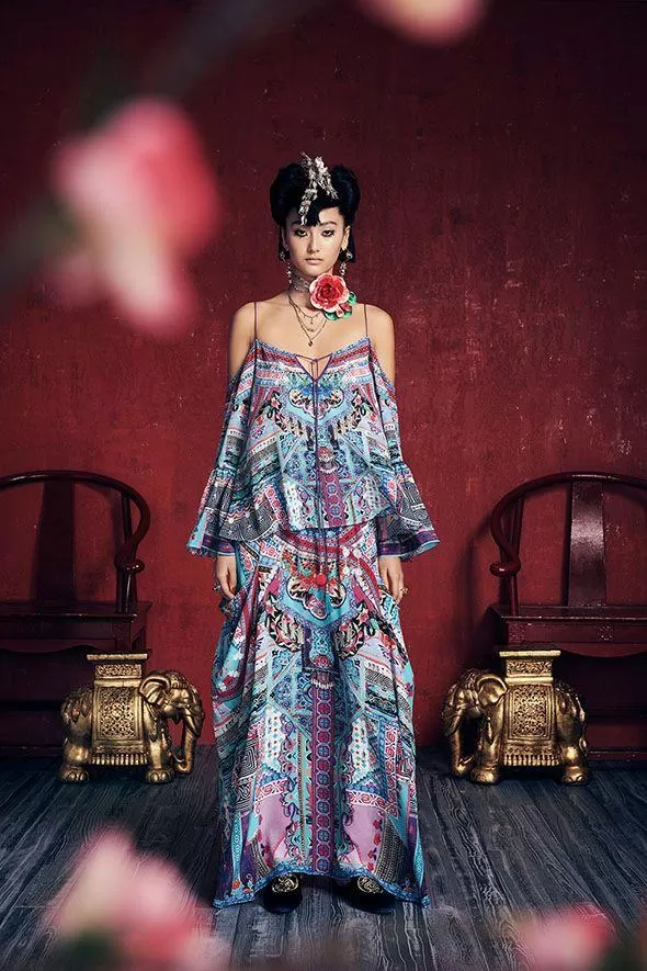 Intricate and vibrant patterning inspired by the costumes of Chinese Miao women decorates the Pocket Skirt Dress. Featuring crystal embellishment to waistline and pockets, an elasticised waist and relaxed, full fit, this luxury wear piece is perfect for wearing with a styled as a bodysuit or with a shoestring strap top. Accessorise with a , and soft for a free-spirited look.