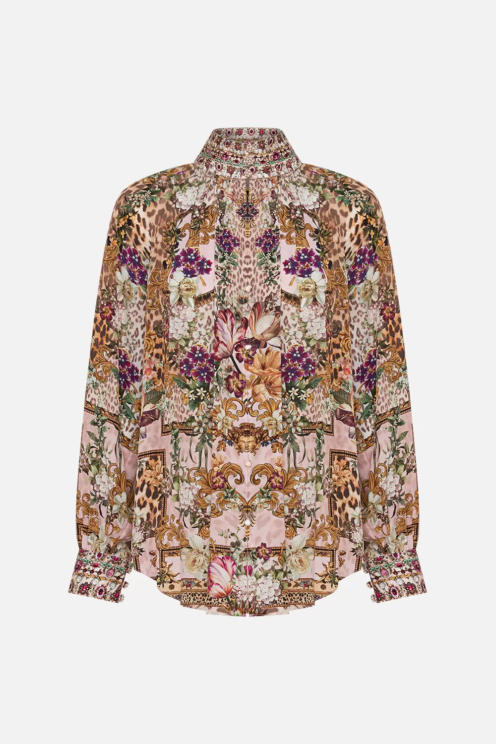The Bambino Bliss Raglan Button Up Shirt echoes the sweet symphony pastel pinks awashed in opulent florals and leopard print dancing beneath gilded archways. Crafted with crystal adornments, this luxury silk blouse plays host to an embellished collar that melts into billowy blouson sleeves, tapered cuffs echoing golden hardware and a softly relaxed silhouette that falls into flared hemline. Create a sleek matching set outfit with the Bambino Bliss Straight Leg Pant. Lovingly handcrafted, designed in Australia. Explore more from the Amore Mio collection.