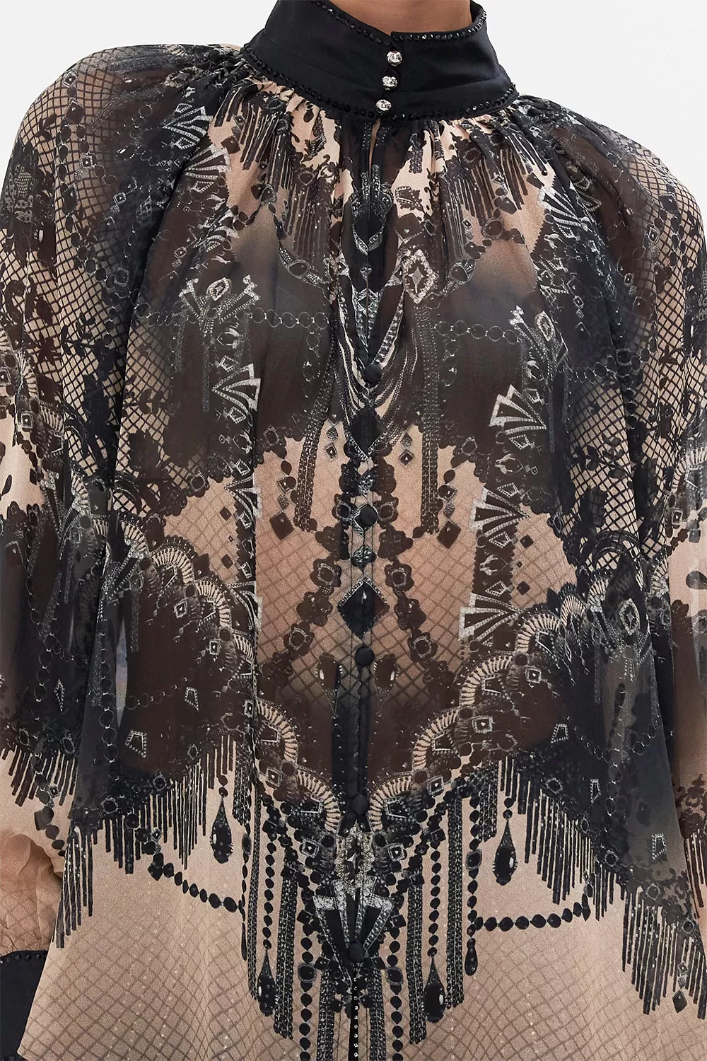 The Curtain Call Chaos Raglan Button Up Shirt interweaves the fine lines of netting and french lace, draped chains, dripping in black diamond gemstone motifs. Crafted with crystal adornments, this luxury silk chiffon blouse plays host to a hand-embellished collar that melts into billowy blouson sleeves, tapered cuffs echoing golden hardware and a softly relaxed silhouette that falls into flared hemline. Lovingly handcrafted and designed in Australia, explore more from The Moral Of The Story: Act II collection.