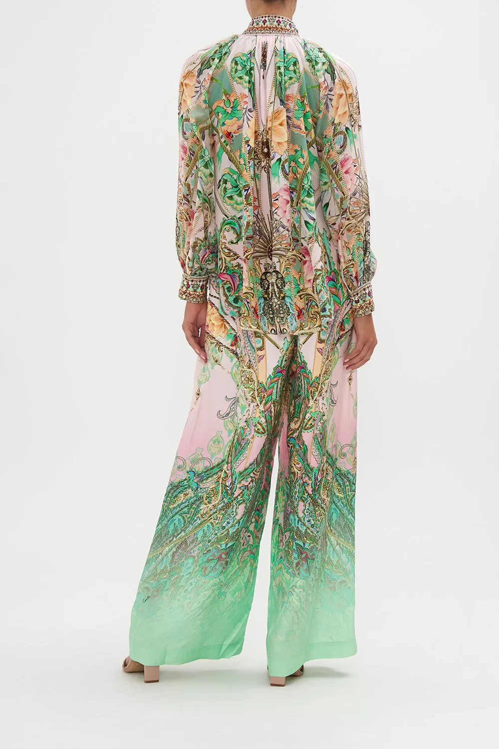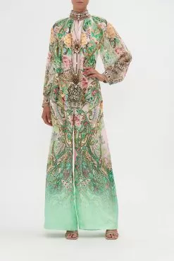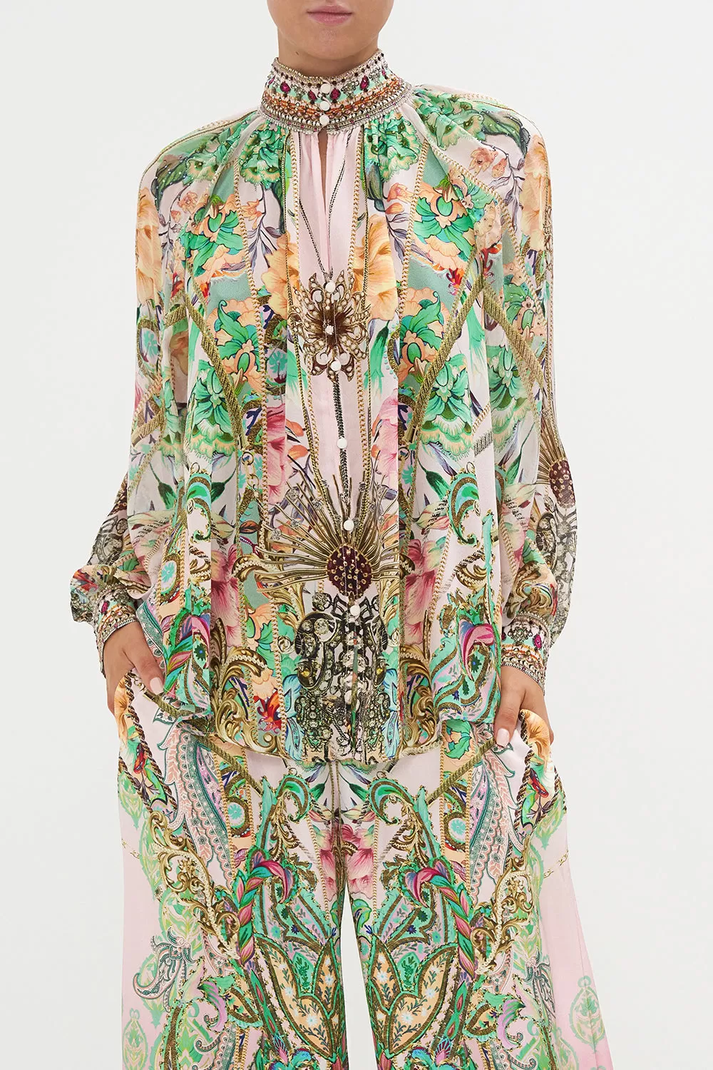 The Lost City Raglan Button Up Shirt enwraps our gaze with a kaleidoscope of minty greens and gentle pinks as baroque details dipped in gold intertwine with paisley patterns. Crafted with crystal adornments, this luxury silk chiffon blouse plays host to a hand-embellished collar that melts into billowy blouson sleeves, tapered cuffs echoing golden hardware and a softly relaxed silhouette that falls into flared hemline.