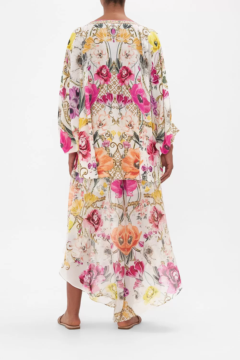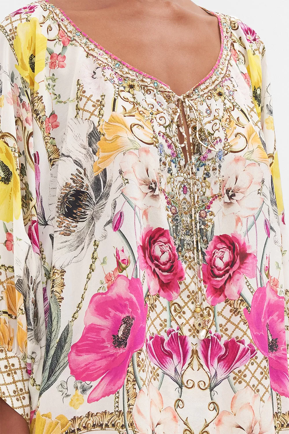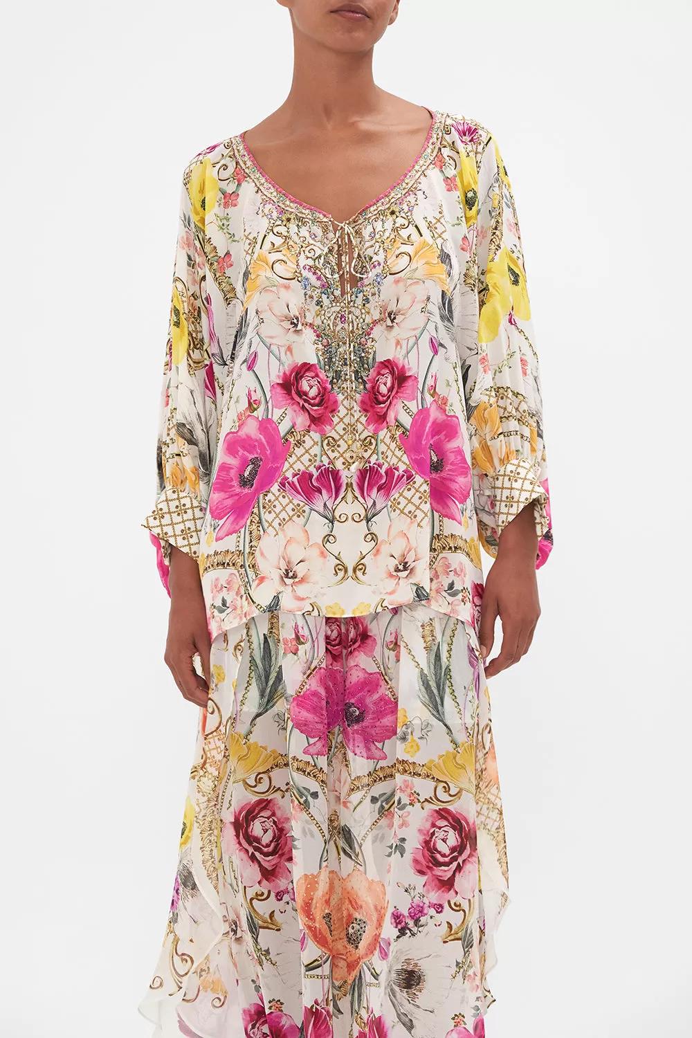 The Destiny Calling Raglan Sleeve Blouse With Cuff is a sweet sonnet of bright feminine florals cascading across a gate of fine golden lattice and baroque flourishes. Crafted from luxury CAMILLA silk, this statement blouse features a drapey raglan sleeve that falls into a buttoned cuff, a classic rounded neckline with split and soft ties, and a flared hem that falls gently to the hips perfect for french tucks , finsihed off with signature CAMILLA hand-embellished crystals. Lovingly handcrafted and designed in Australia, explore more from The Moral Of The Story: Act II collection.
