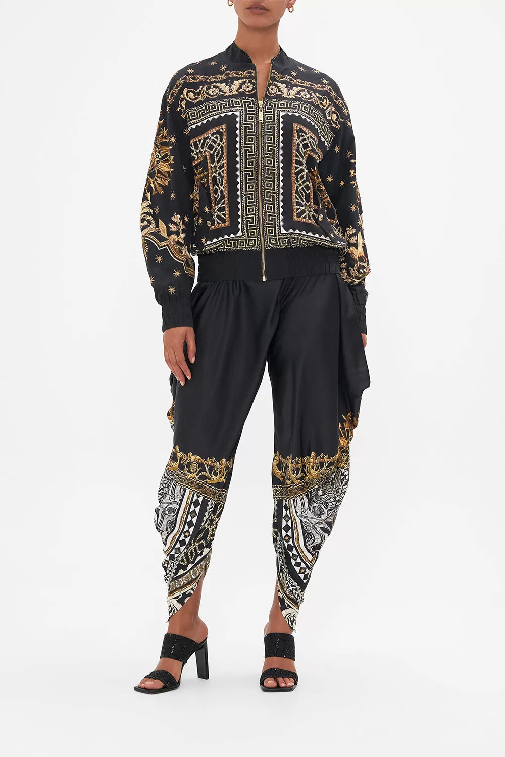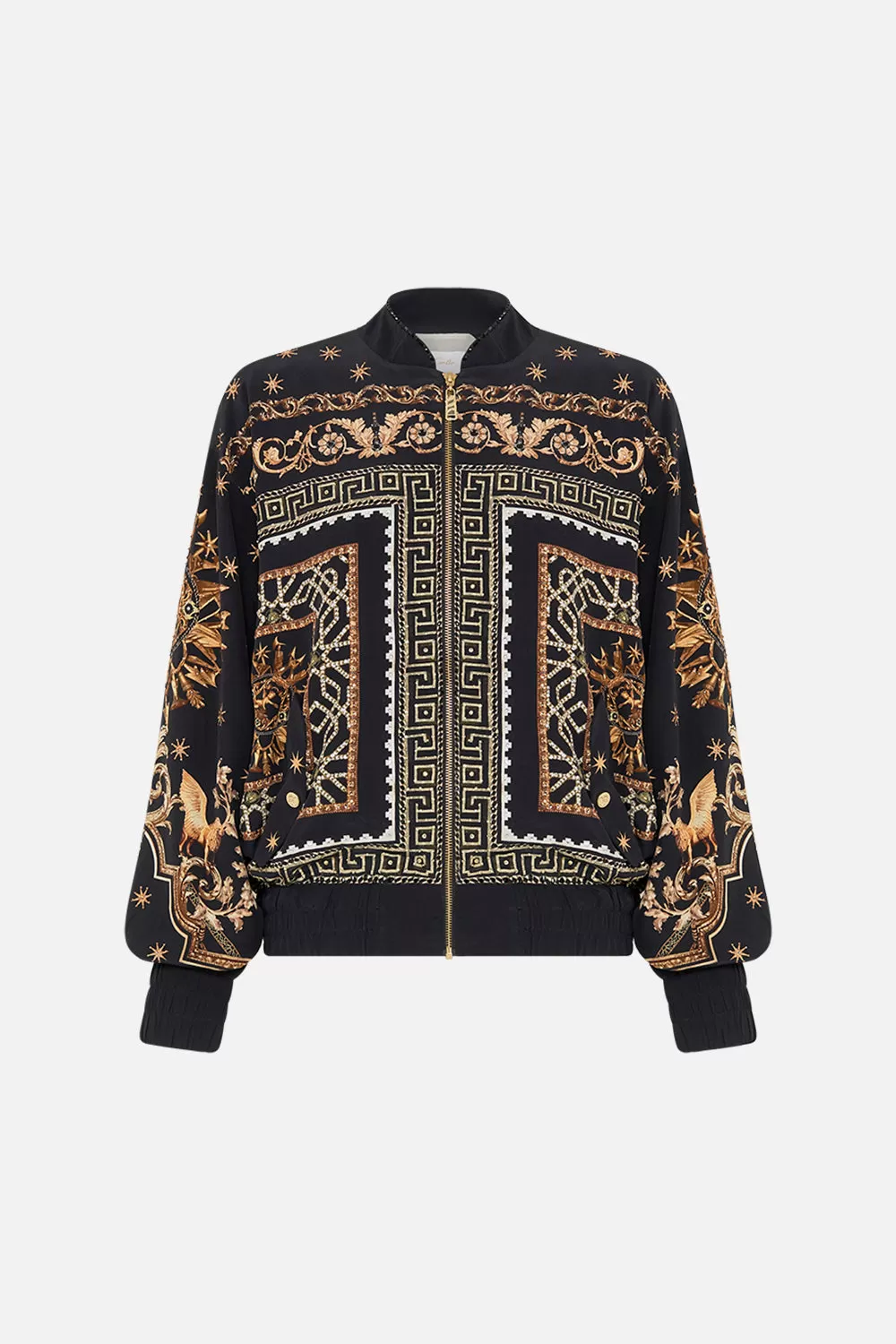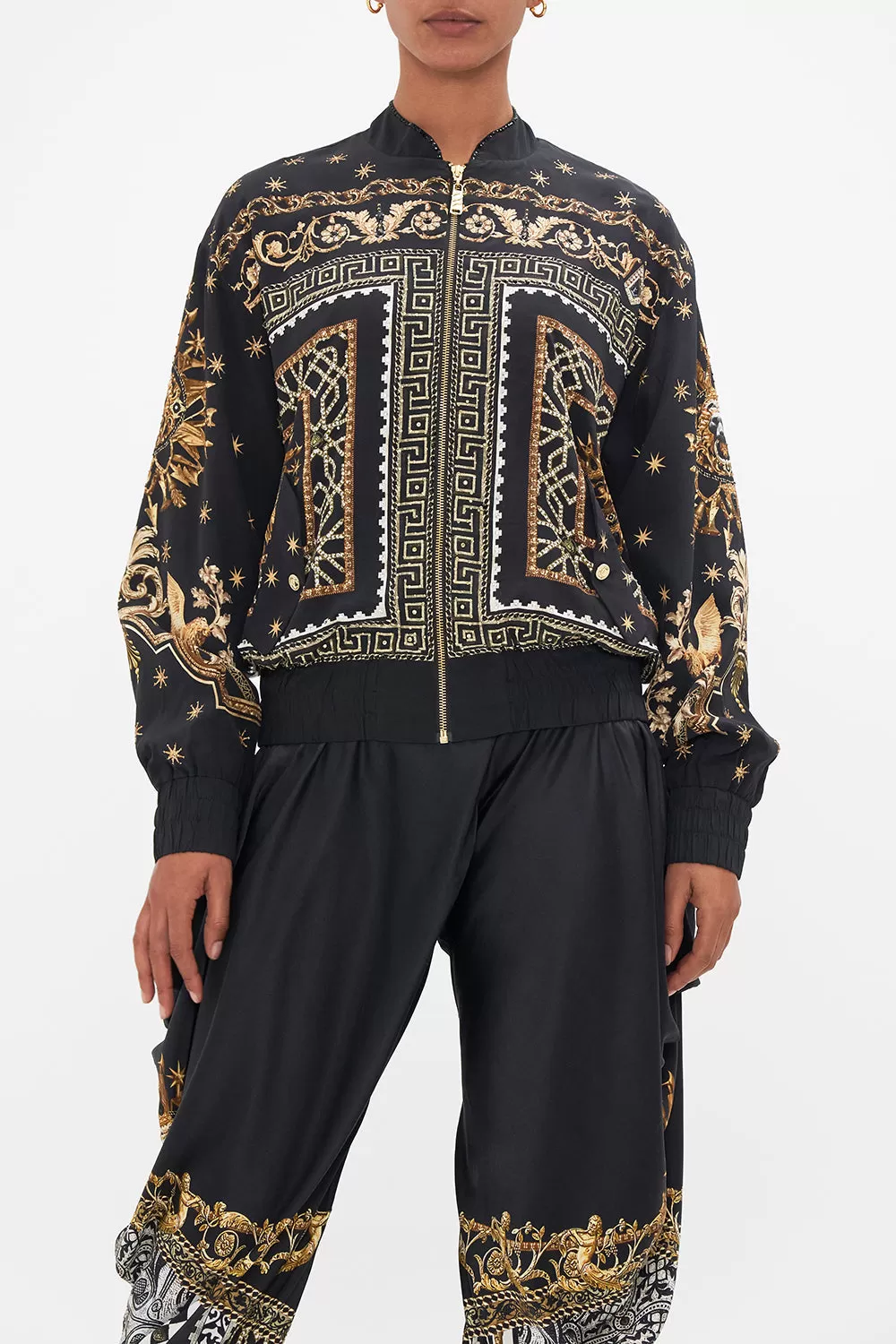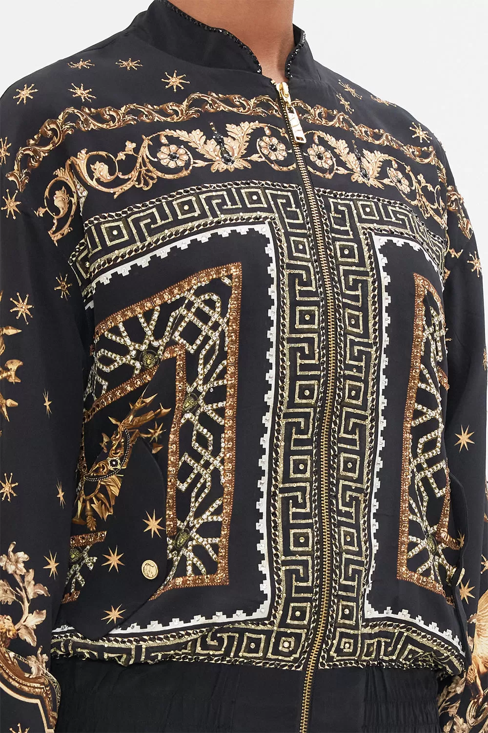 The Duomo Dynasty Relaxed Bomber Jacket is a symphony of sculptural palatial curves. A striking mosaic of onyx and gold highlights the glimmering gold charms and royal crests imbued in myth and magic. Boldly detailed with heavy embellishments, this luxury silk bomber jacket features a relaxed silhouette, pocket functionality with pocket flap detailing, is fully lined with a zip front enclosure, lush ribbed cuffs and hemline for utter comfort and immaculate fit. Wear with the matching Duomo Dynasty Wide Leg Trouser With Front Pockets. Lovingly handcrafted, designed in Australia. Explore more from the Amore Mio collection.