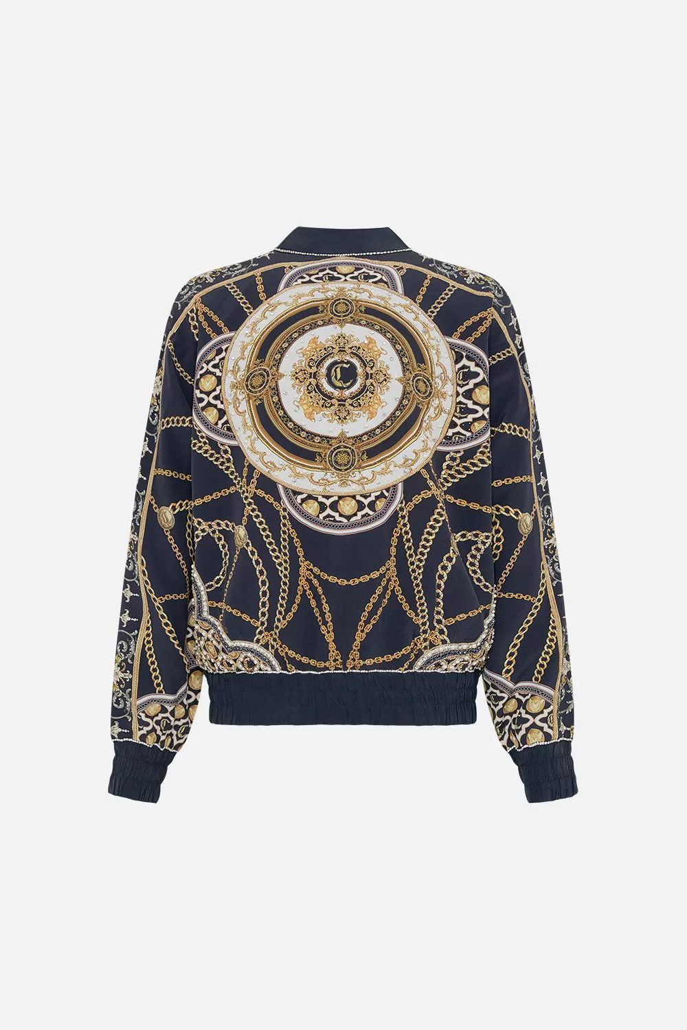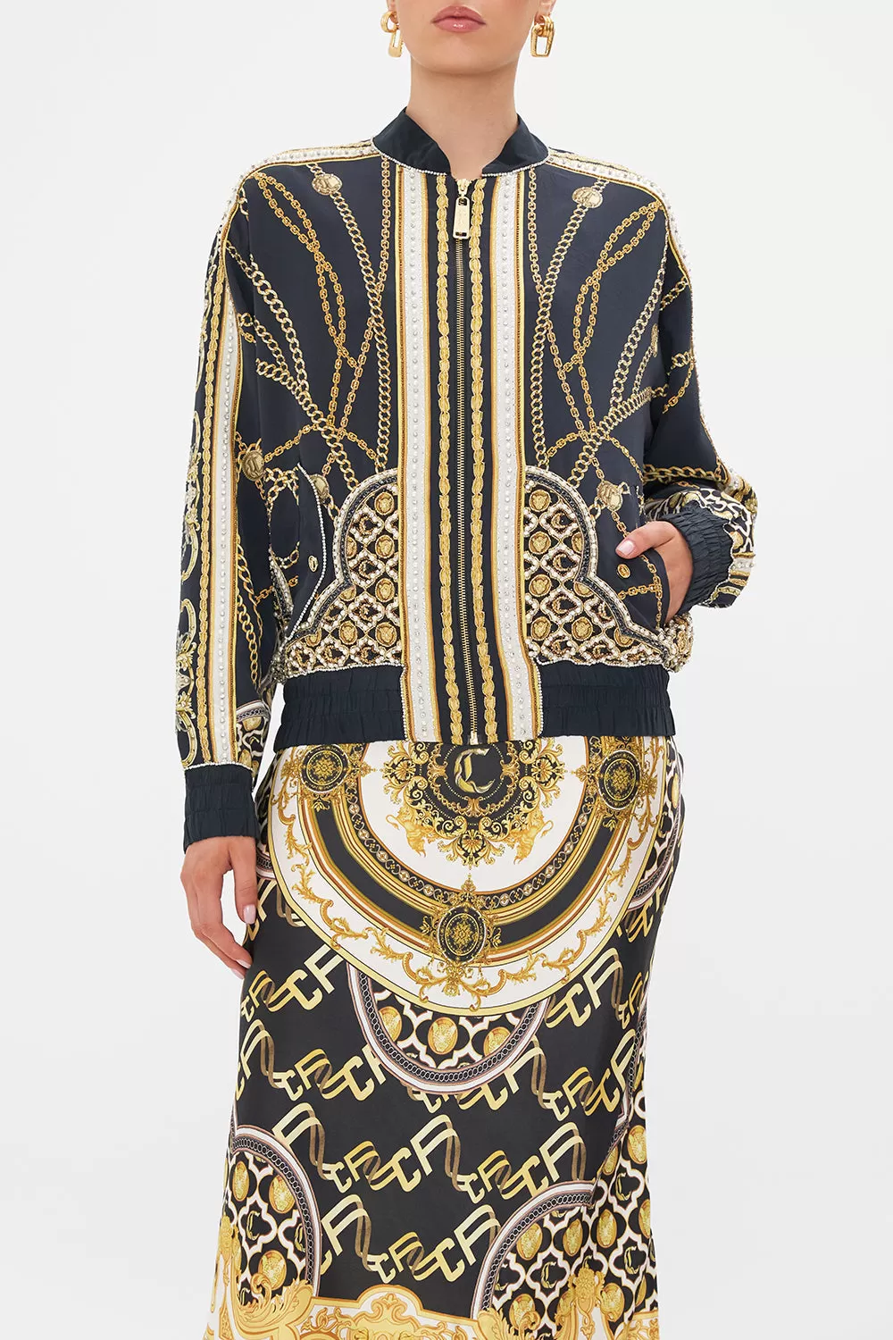 The Tether Me Not Relaxed Bomber Jacket is an immersion into an opulent world of sleek palatial curves, offset with sharp monogram mosaics. Gilded baroque adornments and chains glimmer against graphically bold onyx and ivory contrasts. Boldly detailed with heavy hand-embellishments, this luxury statement silk bomber jacket features a relaxed silhouette that homes pocket functionality with pocket flap detailing, fully lined, zip front enclosure, alongside lush ribbed cuffs and hemline for utter comfort and immaculate fit. Lovingly handcrafted and designed in Australia, explore more from The Moral Of The Story: Act II collection.