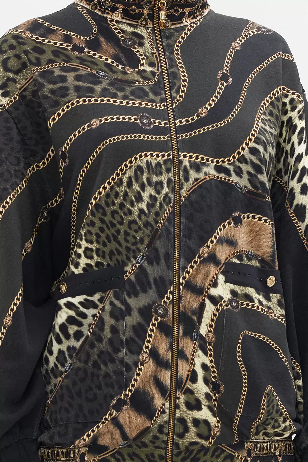 The Lions Mane Retro Lounge Jacket encapsulates a dynamic dance between organic animal print with delicate tribalistic woodcuts enmeshed with delicate chains and sparkling jewels. Featuring silk sleeves and tabs, this luxurious relax fit jacket adorns a front zip enclosure, button details, ribbing on cuffs and a sleek stand collar neckline. Lovingly handcrafted and designed in Australia, explore more from The Moral Of The Story: Act II collection.