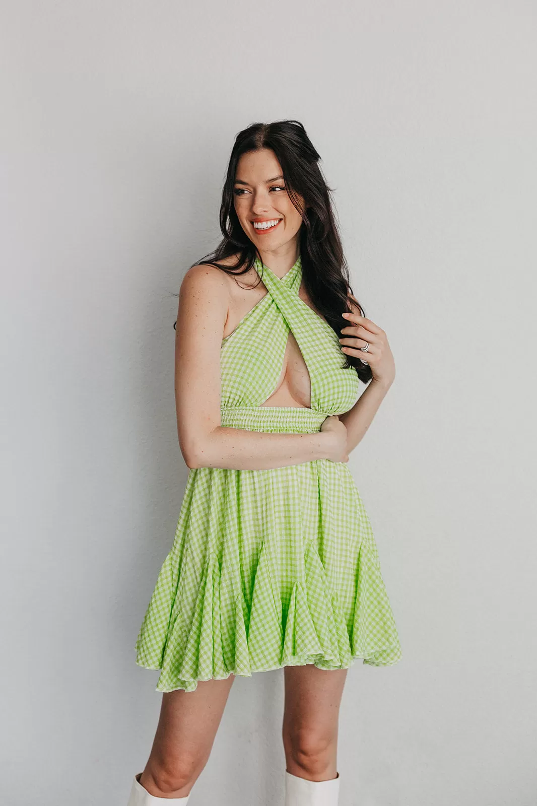 We love this gingham plaid print halter self tie cut out mini dress with smocked waistband detail. You can tie the neckline multiple ways and it is such a cute style to wear with sneakers for your next brunch or heels for your next night out.Â