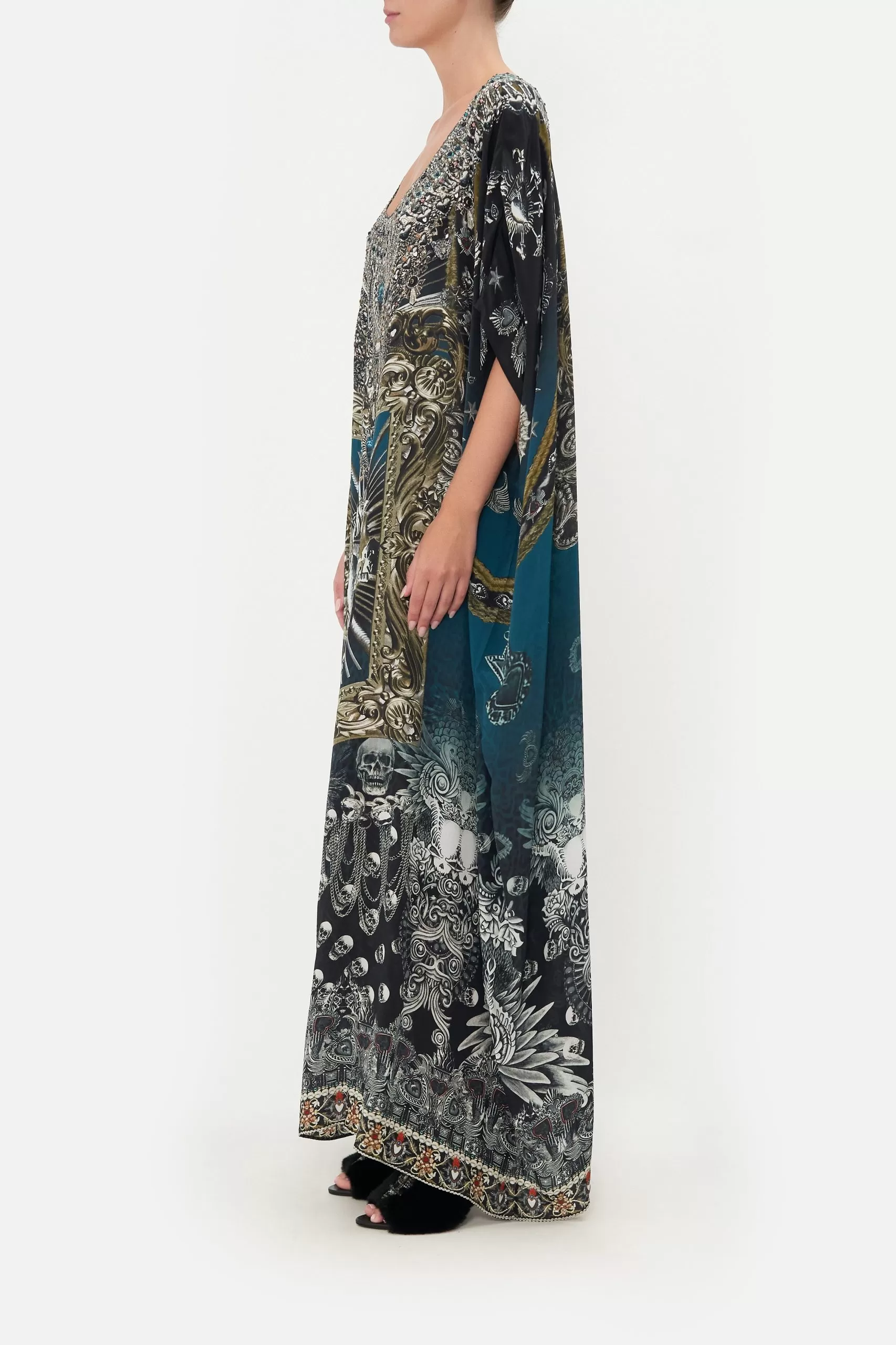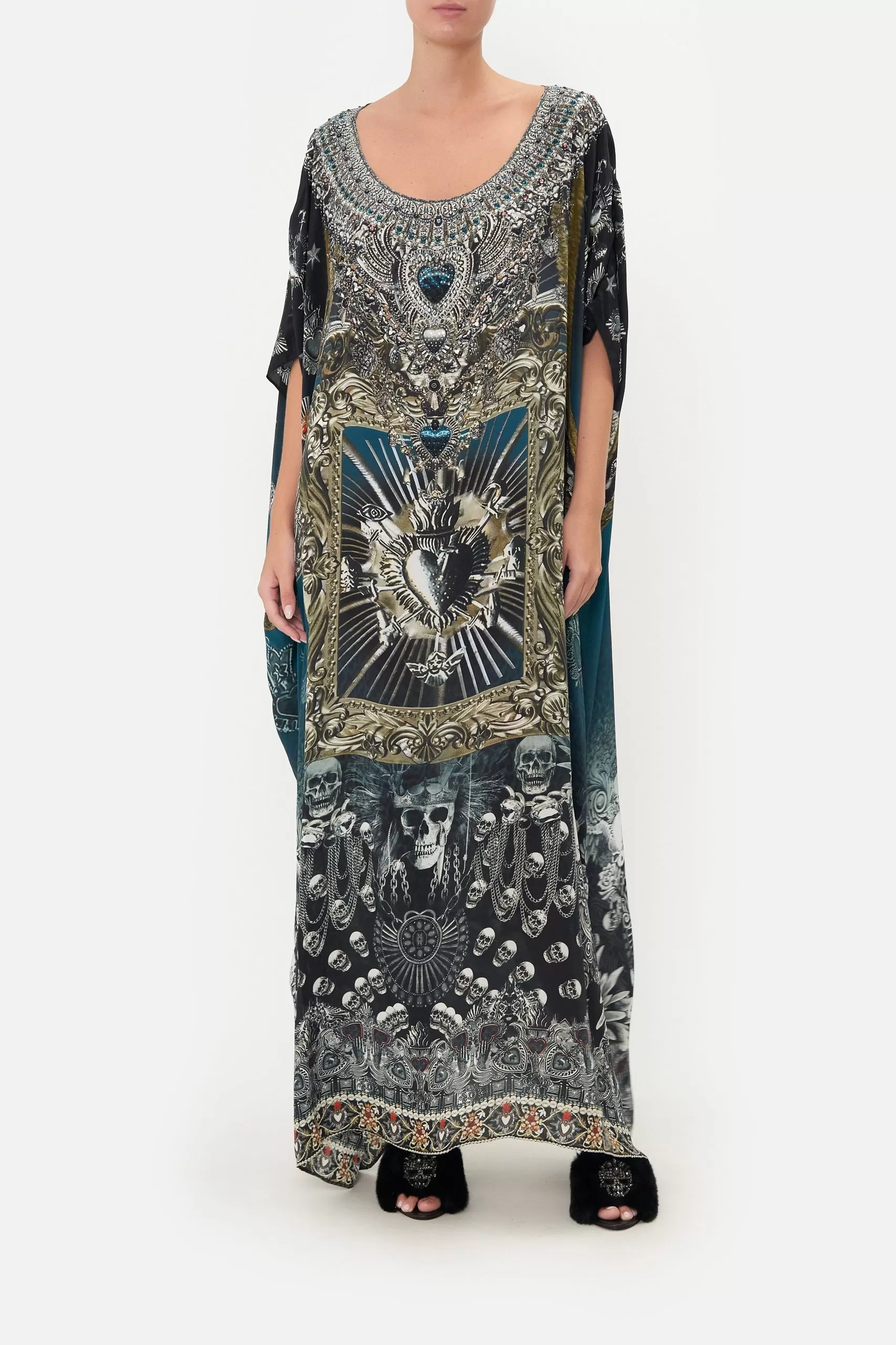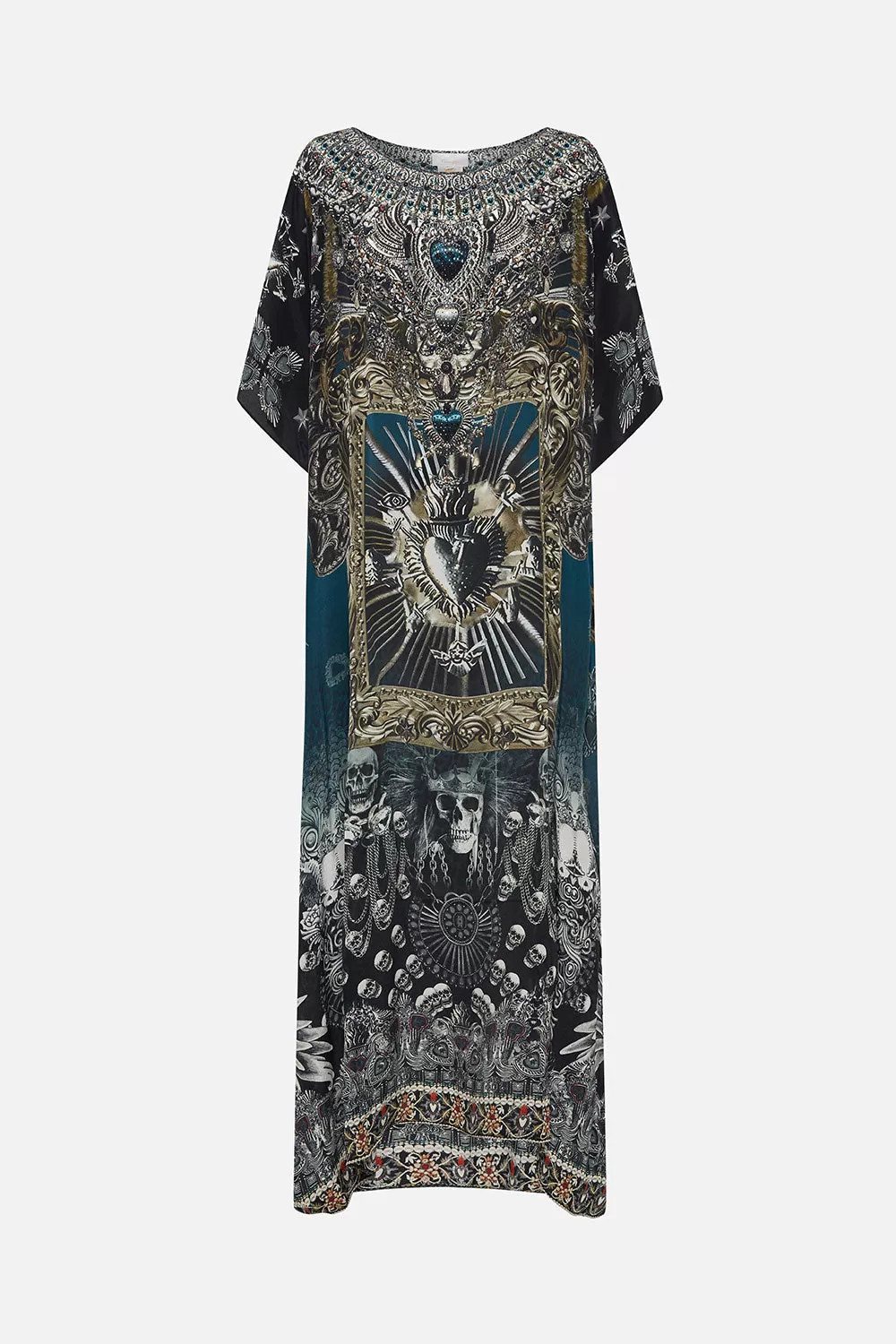 Signature resort wear encased in odes to Mexico, our Animal Anarchy Round Neck Kaftan is wrapped in a rich emerald leopard print adorning the intricacies of ivory skulls, metallic amulets and silver-dipped hearts. Complete with hand-embellished crystals, this luxury silk kaftan features a generous rounded neckline, cropped sleeves and a relaxed maxi silhouette. With so many , transform your kaftan into mini dresses, luxury layers, maxi skirts and shapes of Grecian proportions.