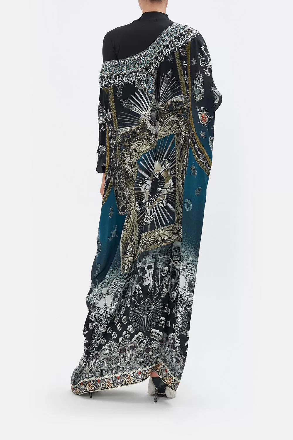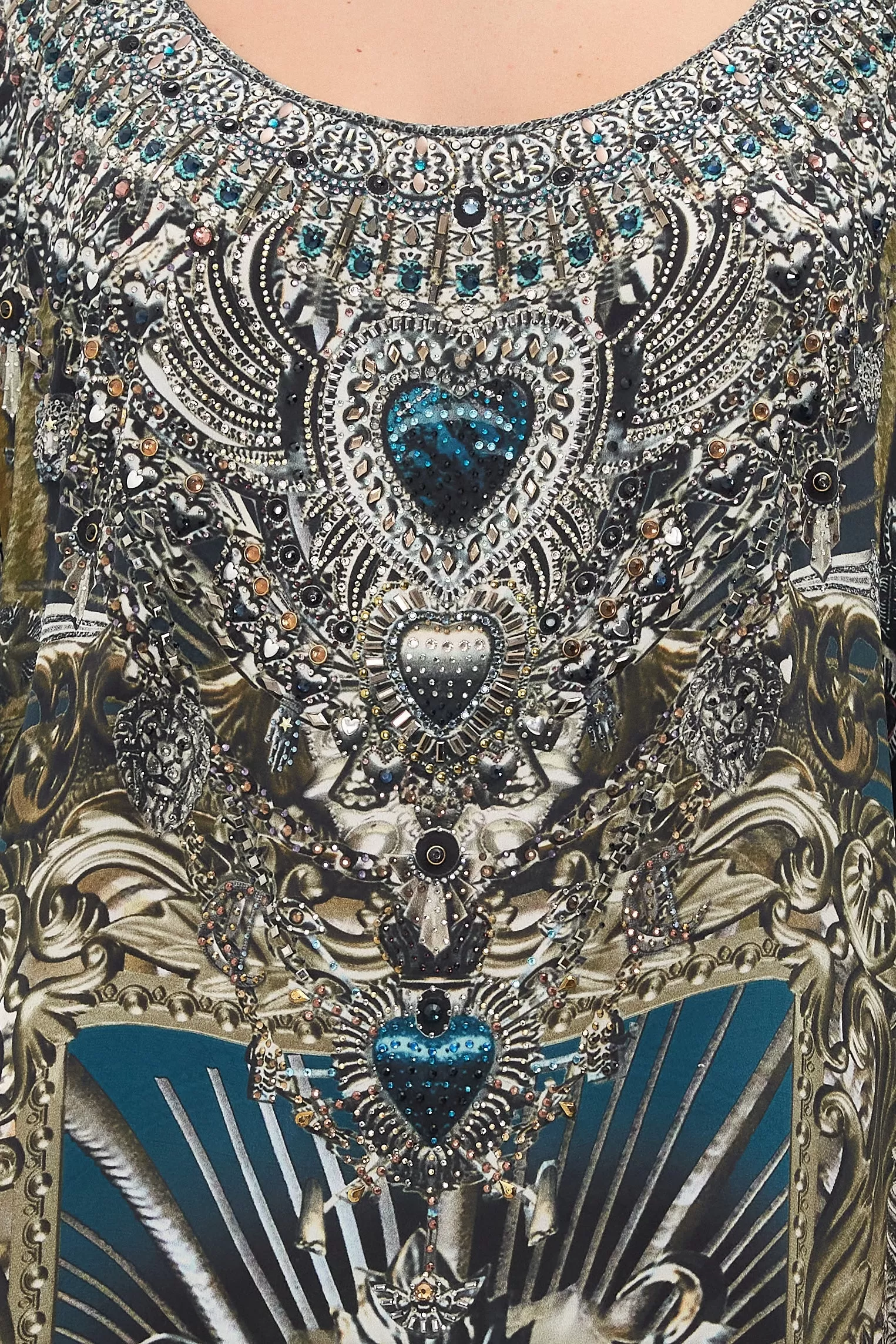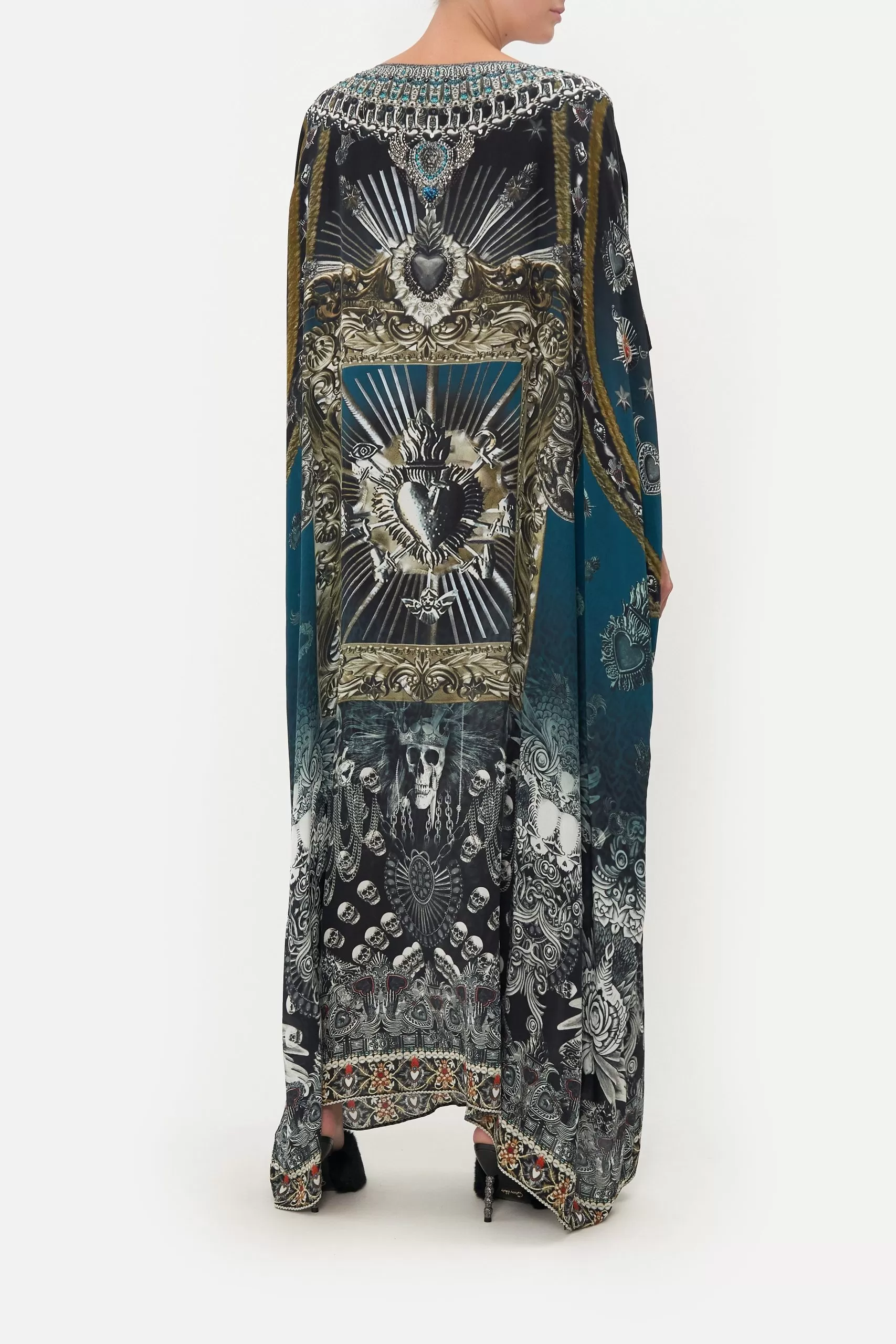 Signature resort wear encased in odes to Mexico, our Animal Anarchy Round Neck Kaftan is wrapped in a rich emerald leopard print adorning the intricacies of ivory skulls, metallic amulets and silver-dipped hearts. Complete with hand-embellished crystals, this luxury silk kaftan features a generous rounded neckline, cropped sleeves and a relaxed maxi silhouette. With so many , transform your kaftan into mini dresses, luxury layers, maxi skirts and shapes of Grecian proportions.