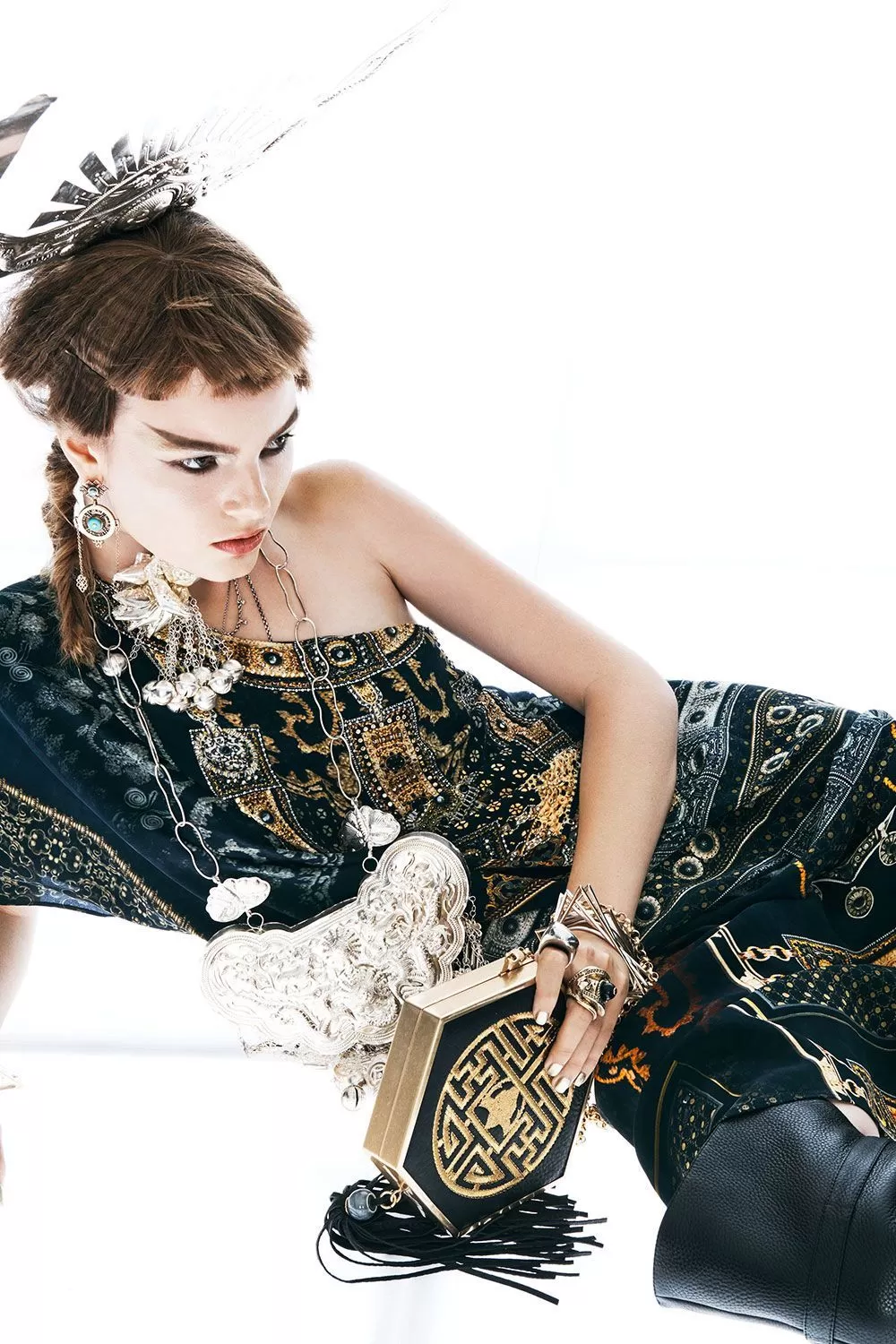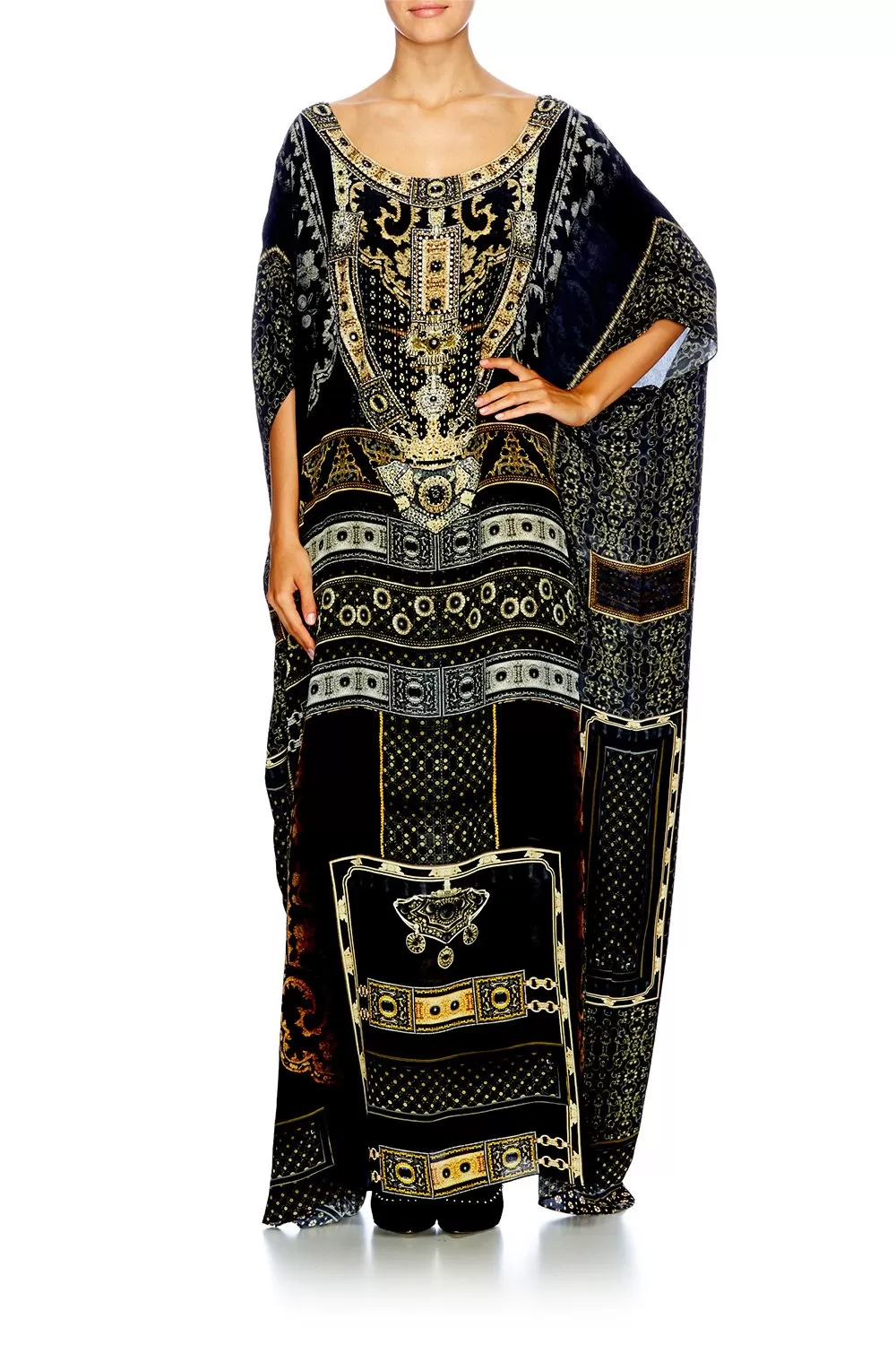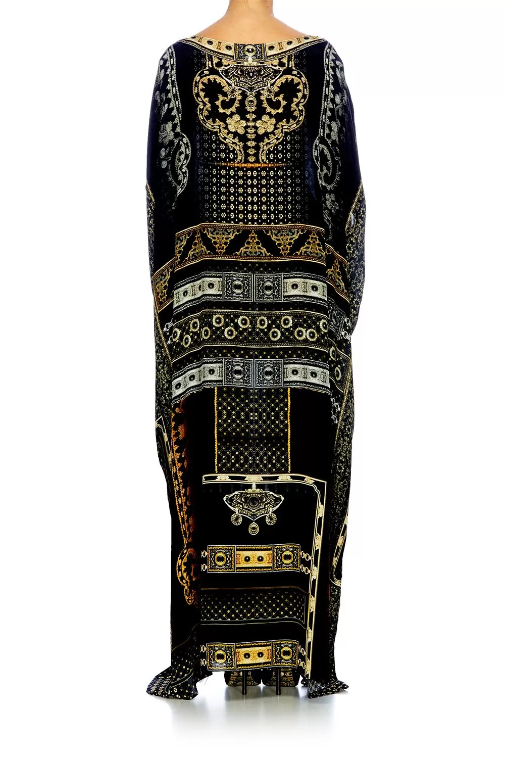 With patterning inspired by the spiritually-provocative landscapes of Tibet, the Round Neck Kaftan balances an intricate print with a relaxed silhouette. Featuring delicate, hand-applied crystals to neckline, a pure silk construction, short sleeves and an amulet to back with crystal detailing, this luxury resort wear piece can be styled in a multitude of ways. Wear yours as a cape, a halter neck dress, a maxi skirt and more, or style simply as a sarong over a for the ultimate bohemian, beachside look.