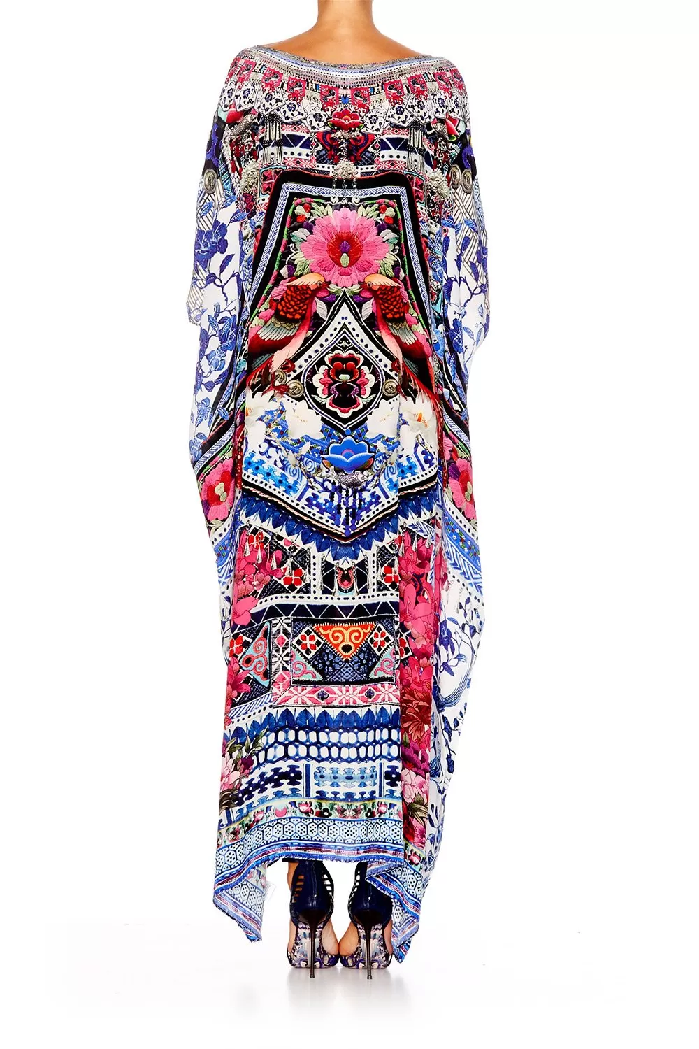 With patterning that draws its inspirations from the stunning scenery of rural China, the From Kaili With Love Round Neck Kaftan balances bold prints with a relaxed silhouette. Featuring delicate, hand-applied crystals to neckline, pure silk construction, 3/4 length sleeves and fullness to hemline, this luxury wear piece can be worn in a multitude of ways; including as a cape, a halter neck dress, a maxi skirt and more. Wear simply as a sarong over a or for the ultimate bohemian, beachside look.