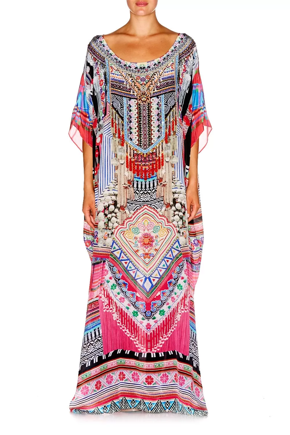 The Round Neck Kaftan in our exclusive Hani Heaven print is an elegant multi-wear option that is cut from premium silk for maximum softness throughout the silhouette and against the skin. Adorned with hand-applied crystal embellishments to neckline, this staple style is inspired by the abounding perfectionism and dedication that traditional artists show towards their craft, and is a signature CAMILLA style that will become a mainstay of your bohemian-inspired wardrobe. Take advantage of the multi-wear capabilities of this kaftan and style as a cape, teamed with harem pants and statement jewellery.